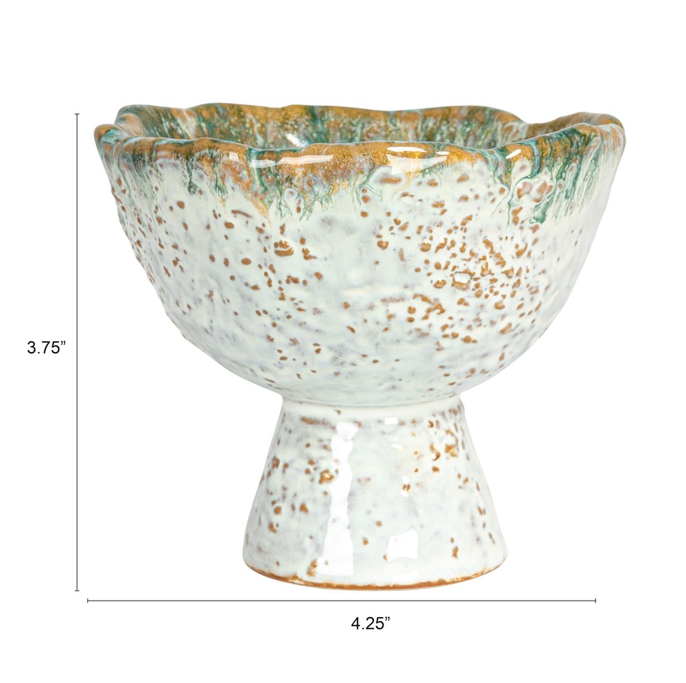 This Round Stoneware Bowl stands proudly on a flared foot, its rounded body coated in a green and brown speckled glaze that calls to mind the rich tapestry of a woodland clearing. The earthy tones and tactile finish evoke a sense of grounding and connection to the natural world, making it a serene addition to any home. Whether serving as a vessel for favorite snacks or as a standalone piece of art, this bowl's charming presence is a nod to the understated beauty of rustic life. It measures 4.25 inches in diameter and 3.75 inches in height, providing a compact yet visually striking presence. It's a functional piece that doesn't shy away from making a statement, embodying the spirit of pastoral elegance with a modern twist. A rustic stoneware bowl with a speckled glaze in shades of green and brown, reminiscent of a forest floor dappled with sunlight An ideal complement to farmhouse, French country, or coastal decor, this bowl brings a touch of nature's palette indoors This footed bowl, with its rounded body and flared base, offers a distinctive display for fruits or decorative items Made of durable stoneware, it features a unique speckled glaze that adds character and depth to the piece 4.25" Diameter x 3.75” H