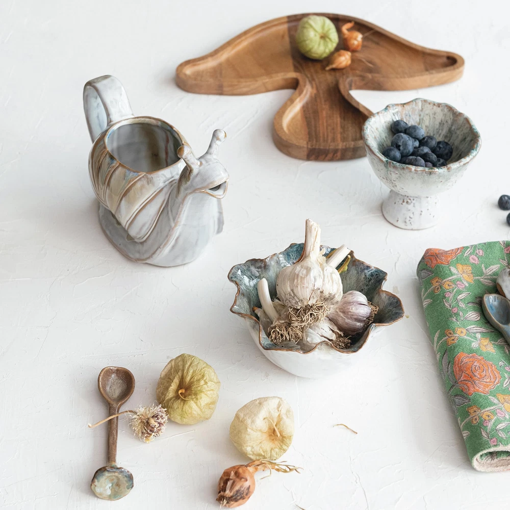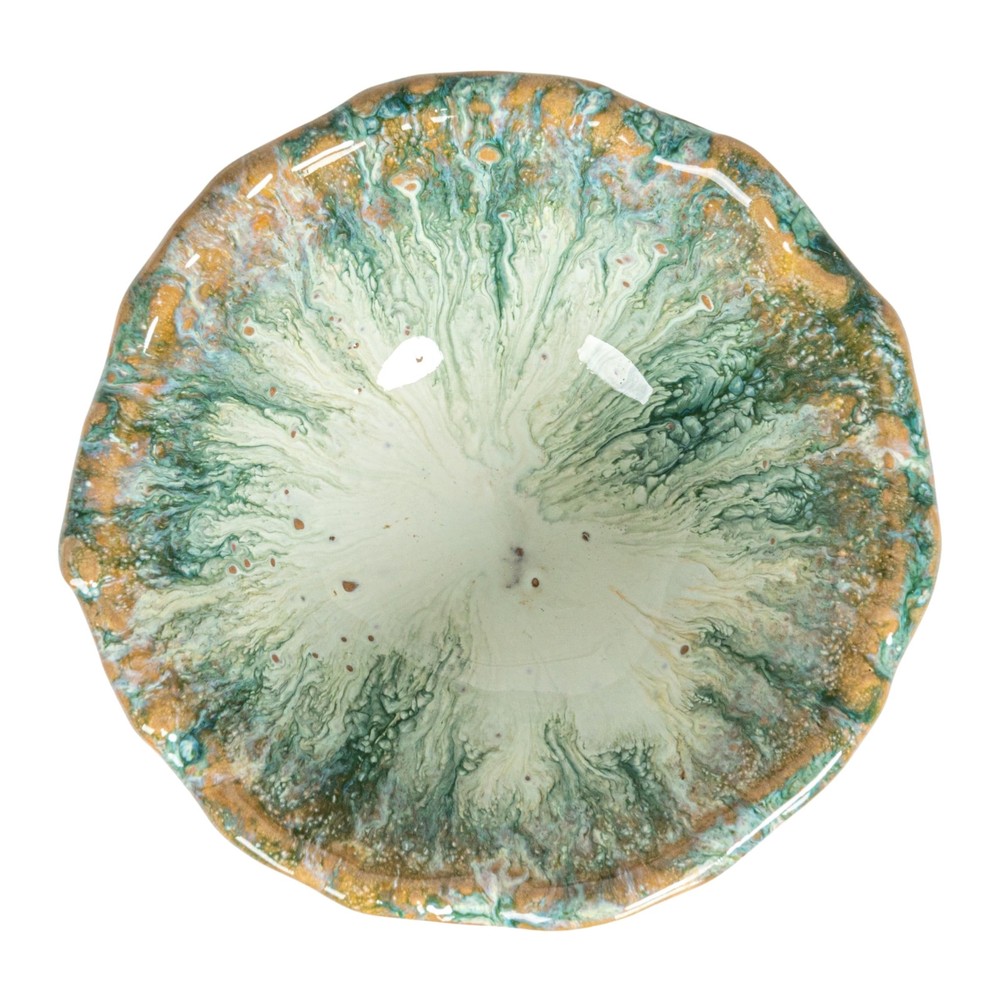 This Round Stoneware Bowl stands proudly on a flared foot, its rounded body coated in a green and brown speckled glaze that calls to mind the rich tapestry of a woodland clearing. The earthy tones and tactile finish evoke a sense of grounding and connection to the natural world, making it a serene addition to any home. Whether serving as a vessel for favorite snacks or as a standalone piece of art, this bowl's charming presence is a nod to the understated beauty of rustic life. It measures 4.25 inches in diameter and 3.75 inches in height, providing a compact yet visually striking presence. It's a functional piece that doesn't shy away from making a statement, embodying the spirit of pastoral elegance with a modern twist. A rustic stoneware bowl with a speckled glaze in shades of green and brown, reminiscent of a forest floor dappled with sunlight An ideal complement to farmhouse, French country, or coastal decor, this bowl brings a touch of nature's palette indoors This footed bowl, with its rounded body and flared base, offers a distinctive display for fruits or decorative items Made of durable stoneware, it features a unique speckled glaze that adds character and depth to the piece 4.25" Diameter x 3.75” H