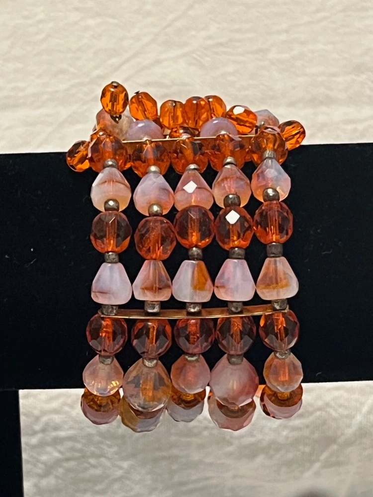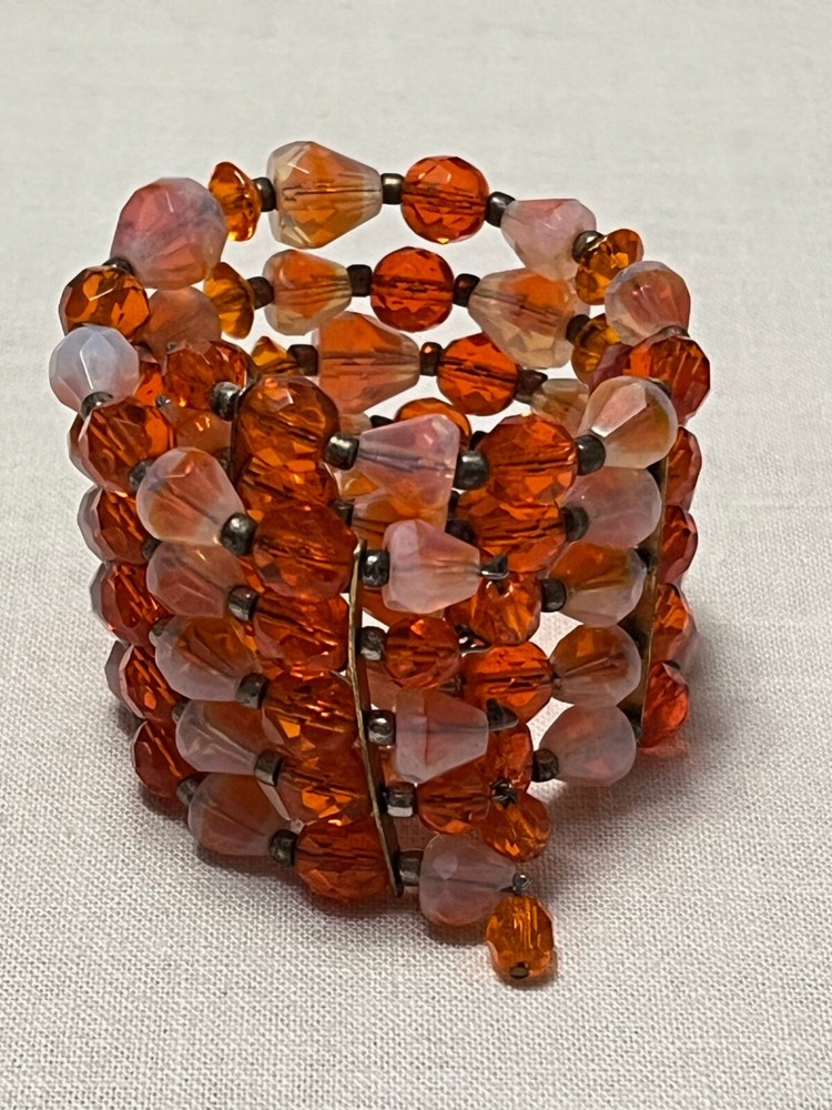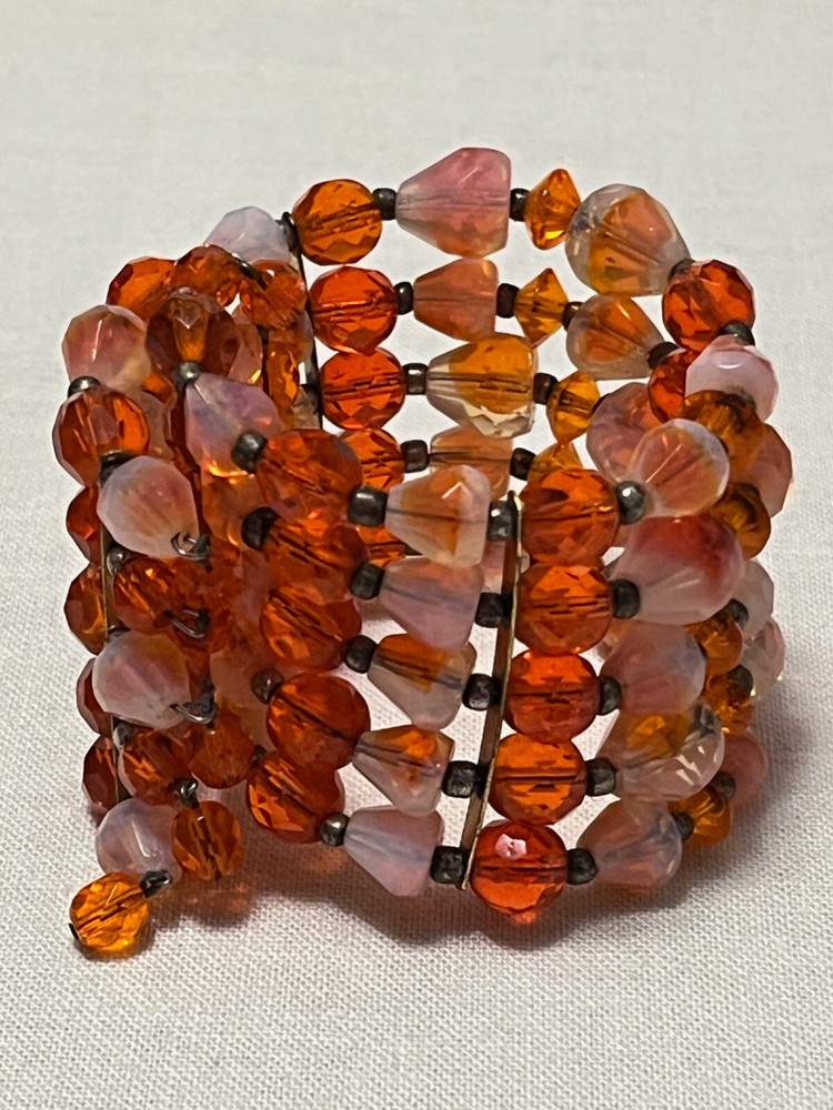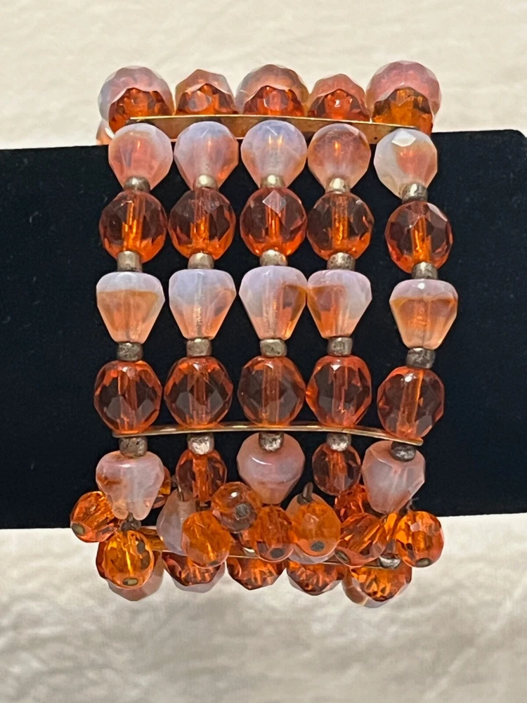 Striking mid century 5 strand gold tone orange art glass stretch cuff bracelet. Outrageously cool. The metal shows some wear, as it should. Condition is still very good....