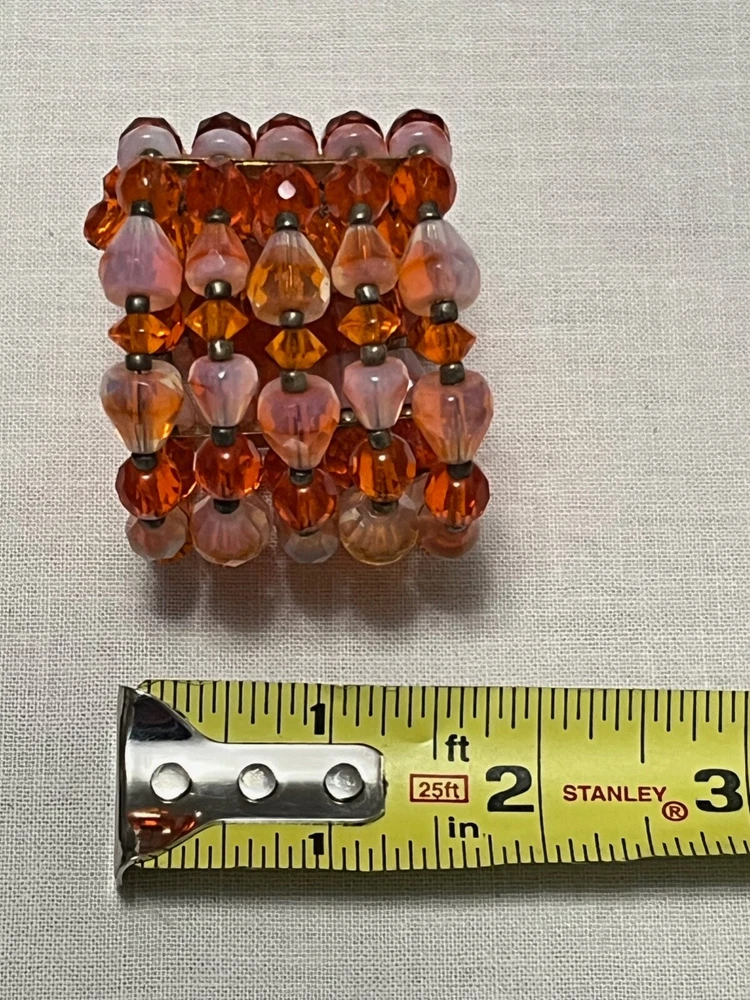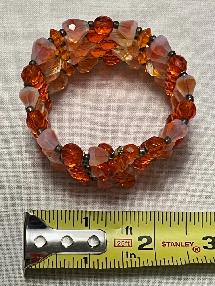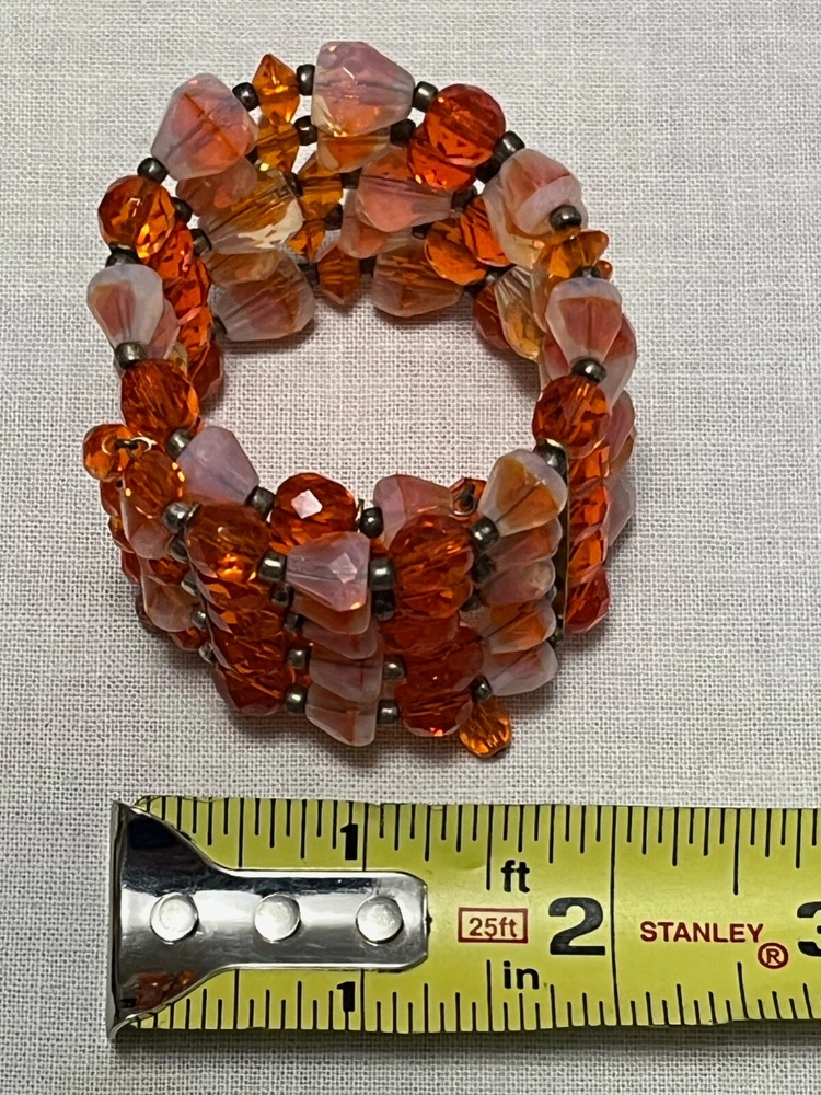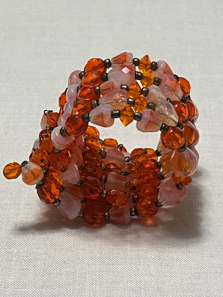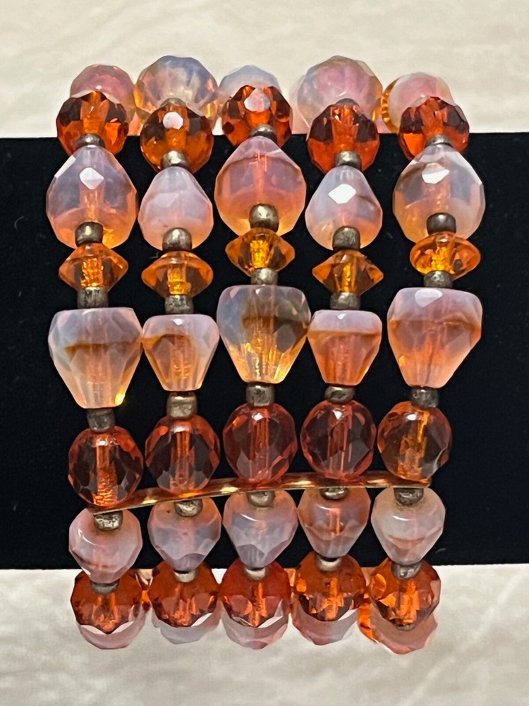 Striking mid century 5 strand gold tone orange art glass stretch cuff bracelet. Outrageously cool. The metal shows some wear, as it should. Condition is still very good....