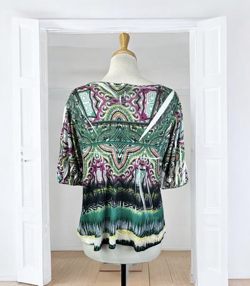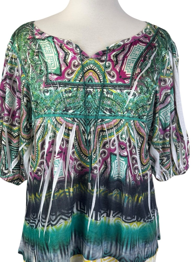 Love this boho-chic tunic! The vibrant colors and rhinestone details make it stand out, while the relaxed fit and V-neck keep it comfy. Perfect for dressing up or down—great for brunch, parties, or just adding flair to everyday outfits. The lightweight fabric drapes beautifully, and the petite sizing fits just right. A fun, artsy piece that instantly brightens my wardrobe!