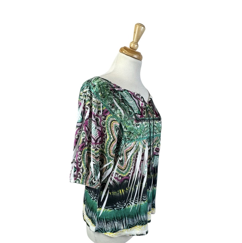 Style & Co PETITE Tunic Top Colorful Embellished Size PL Boho Art To Wear Artsy Inventory: 09142024-1-BIN Measurements: (Approximate) Length: 23 inches from top of shoulder to bottom of top Bust: 40 Short Sleeve Shoulder to Shoulder: 15 inches Add a pop of color to your wardrobe with this Style & Co. tunic top. The V-neckline and cap sleeves provide a comfortable and casual look, perfect for any occasion, whether it's a party, cocktail event, or casual outing. The abstract and geometric pattern with rhinestone accents adds a touch of bohemian flair, making it a perfect addition to any art-inspired outfit. Made of polyester jersey fabric, this tunic top is machine washable and easy to care for. It comes in a petite size PL, with a regular fit. The pullover style and lined features make it a great choice for fall and spring seasons. This top is perfect for those who love to add a touch of art to their wardrobe and is a must-have for any boho-inspired collection.