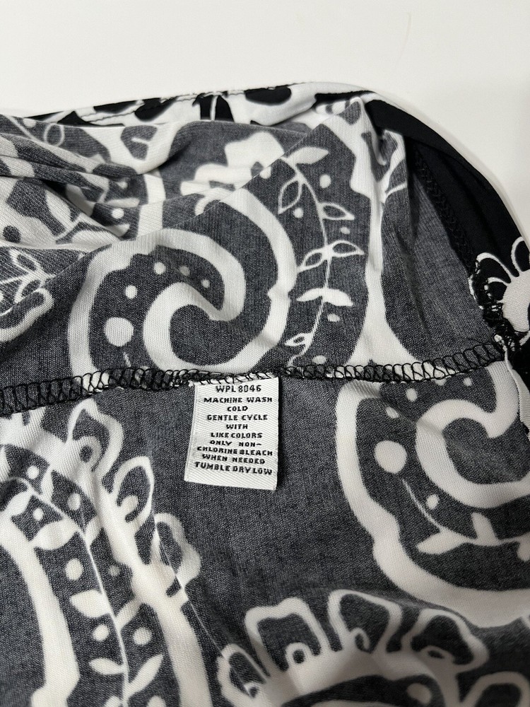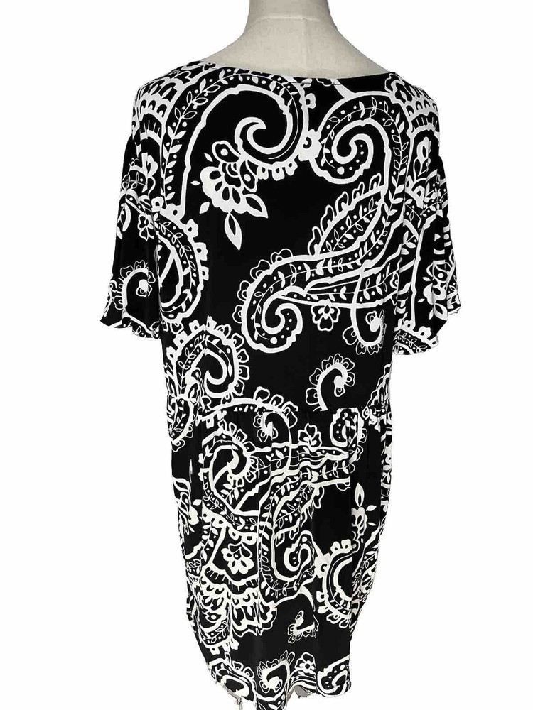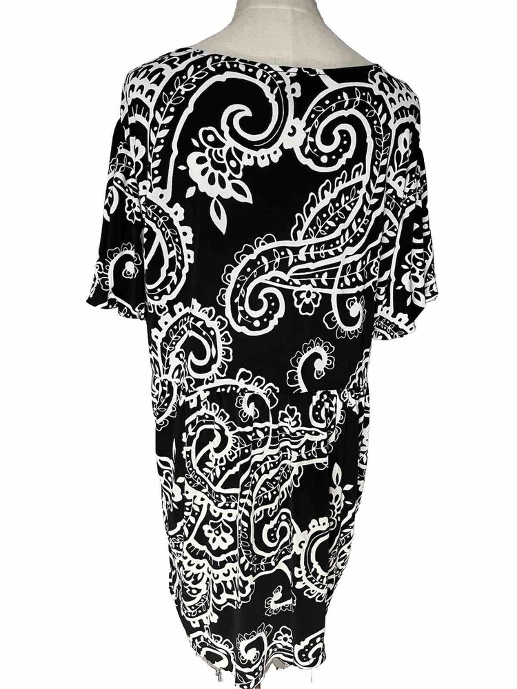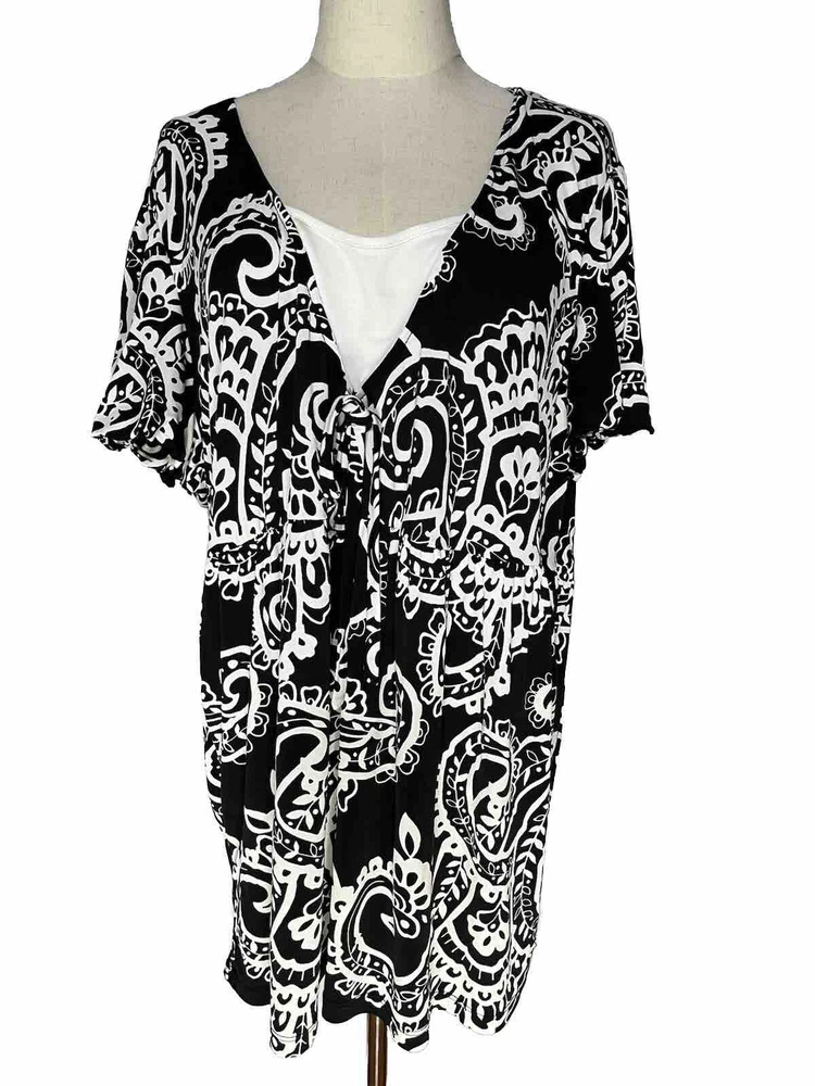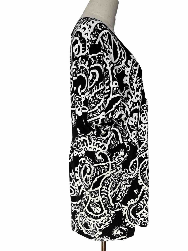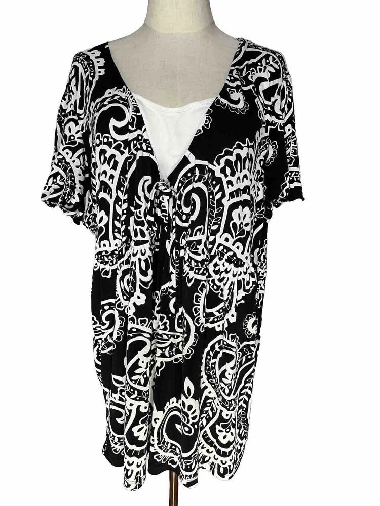 Style & Co Top Women’s 1x Stretch Knit Tunic Shirt Blouse Black White Printed, made Philippines, 95% polyester, 5% spandex, machine washable, sleeve 9”, armpit 25” each side, waist 23” each side, length 33”, black & white, small flaw: half of the bottom hem needs to be sewn.