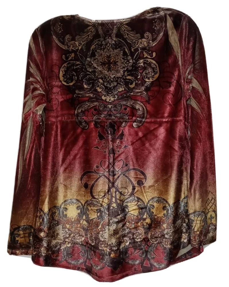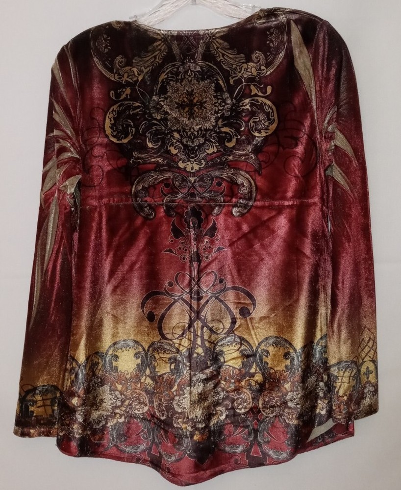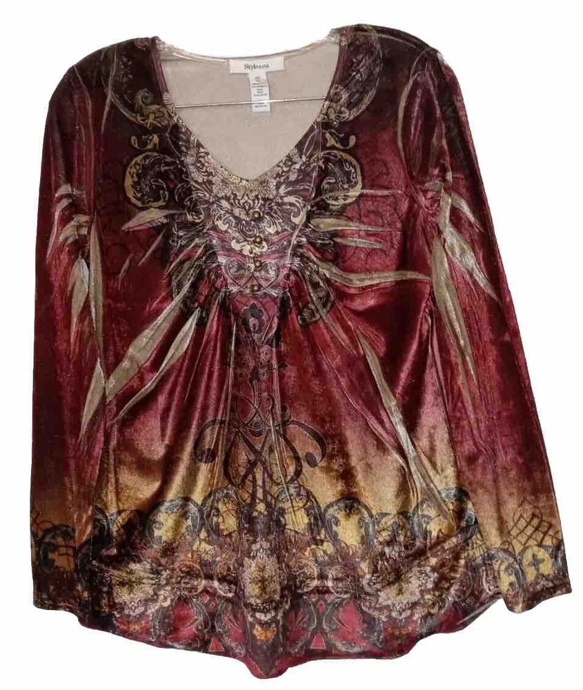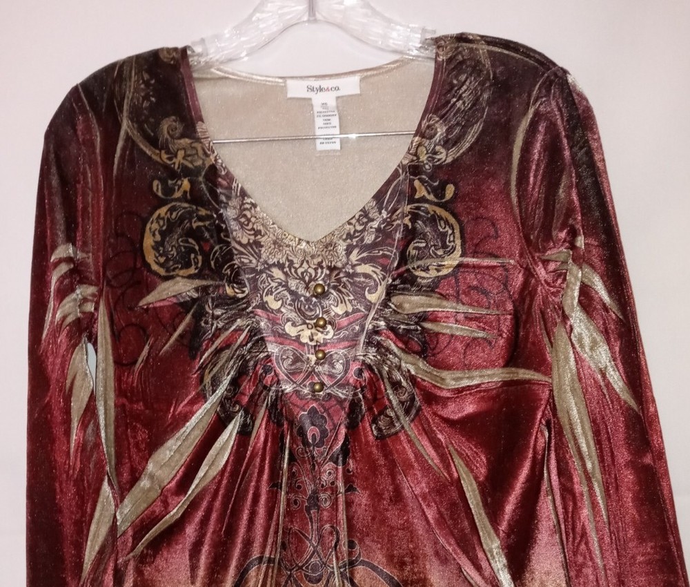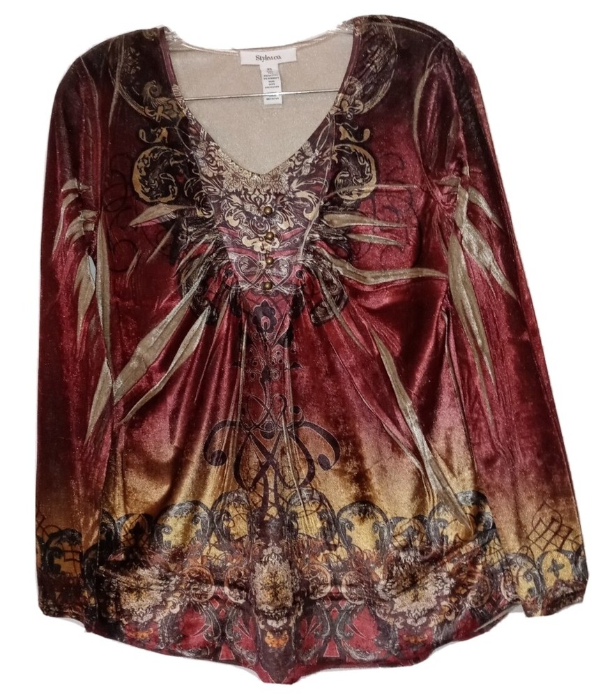 Up For Sale is a Cute Style and Co Macy's Brand artsy velveteen Stretch Knit tunic shirt in size XS The bust measures 34 - 36 " / Length is 28 inches Be sure to check out my other items in my eBay store! Everything is hand selected by me, carefully inspected, clean, smoke and pet free and ready for fast shipping! Check back often, new items added daily! You never know what I'll list next! If you like unique wearable art boho clothing, add the Happy Hippie Shack to your favorites!