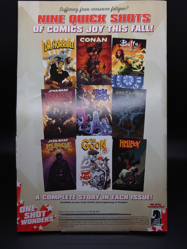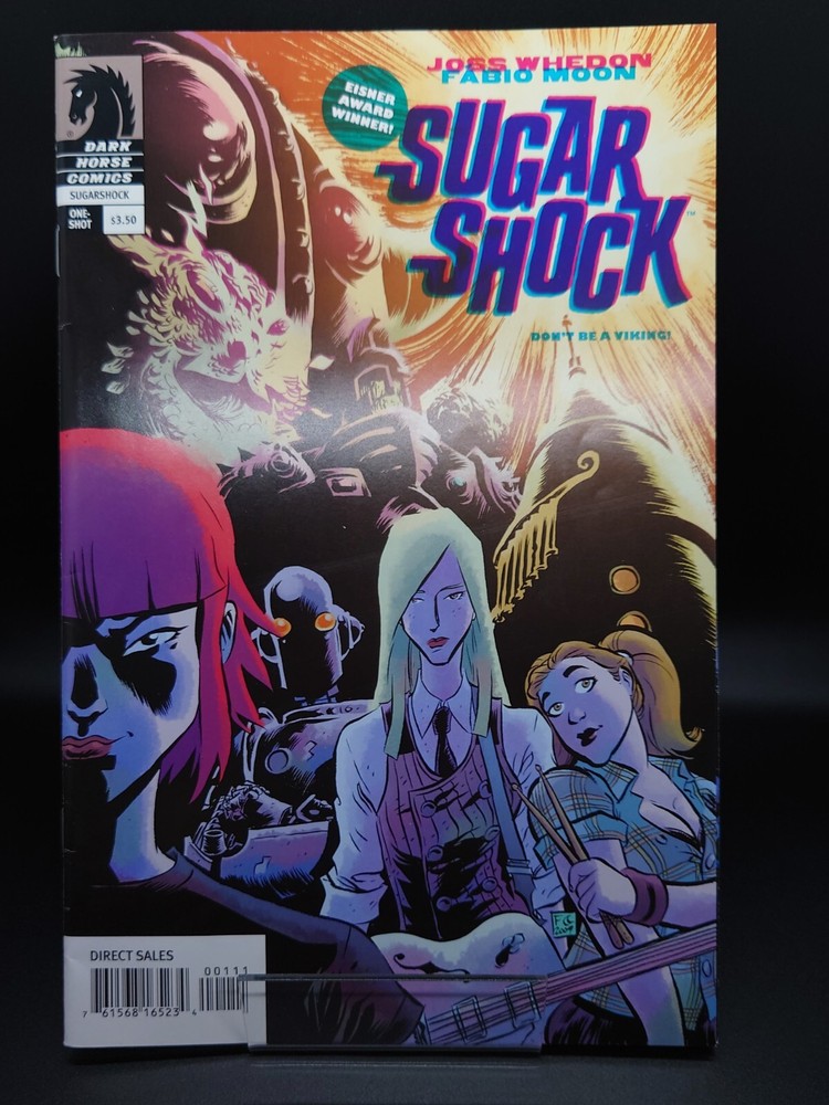 Sugarshock #1 comic book by Joss Whedon and Fabio Moon Eisher Award Winner! Written by Joss Whedon. Art and cover by Fábio Moon, and Dave Stewart Originally presented in the first online issues of MySpace Dark Horse Presents, for which it won the Eisner Award for Best Web Comic, Sugarshock tells the story of a rock band led by charismatic but crazy Dandelion Naizen, a hyperactive singer/songwriter possessed of a mean hatred of Vikings (don't ask) and a mission for a secret government agency that may only exist in her head. But when her band, which includes a robot bass player, is enlisted in an intergalactic battle of the bands-emphasis on battle-Dandelion gets to prove herself as both singer and soldier. This is Joss Whedon at his funniest and most hyperactive, with writing that bursts off the page in a way seldom seen in comics. Multiple Eisner Award winner Fábio Moon delivers the outrageous story with equal energy, as well as providing a fourteen-page look at his process, with never-before-seen character designs, page layouts, and promotional images. Joss Whedon's Eisner award-winning story gets its own comic! Sugarshock ©2009 Joss Whedon. This comic is in VF condition. Grading is subjective. I try to provide as detailed photos as possible for you to determine what the condition of the book is. We combine shipping for comic books paid for in the same invoice. Each additional comic is just 25 cents added to the shipping cost. All comics ship bagged and boarded in a comic flash mailer to minimize movement during shipment.