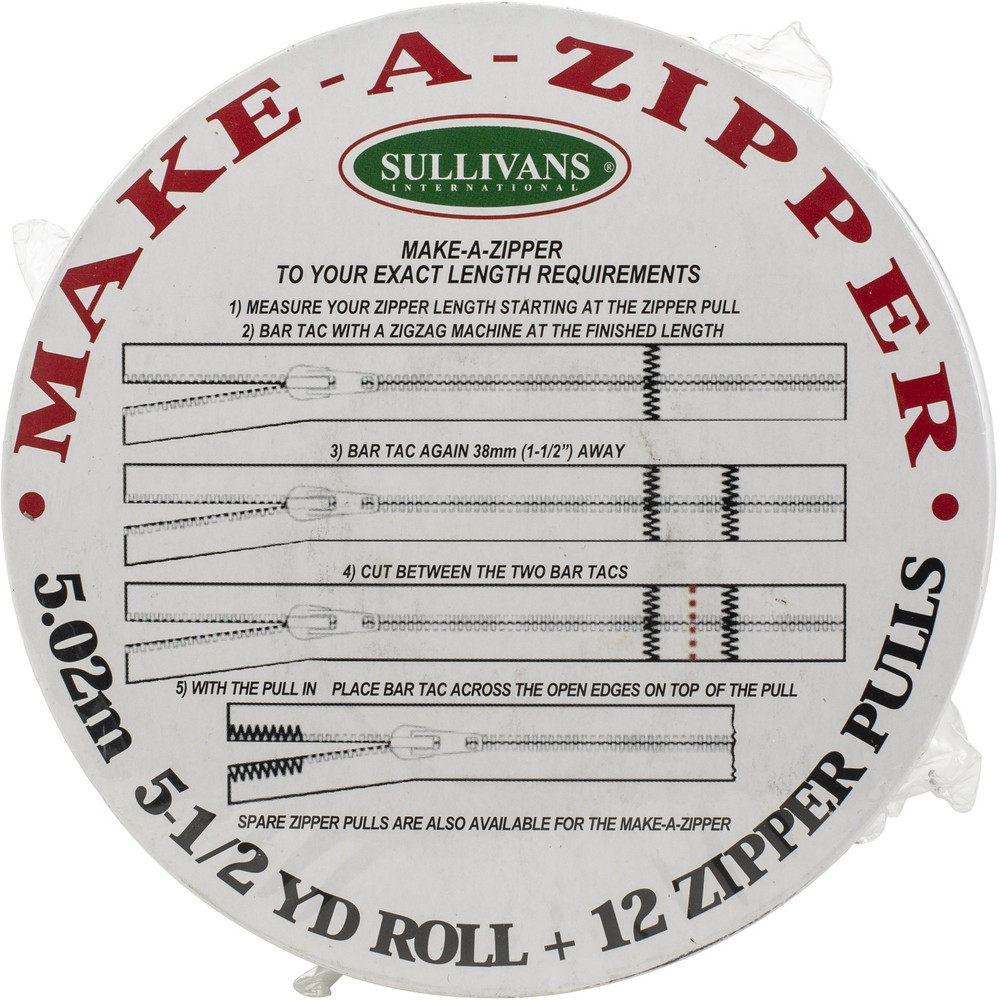 Product Description Sullivans Make-A-Zipper Kit 5.5yd-White SULLIVANS USA-Make a Zipper Kit allows you to custom make plastic zippers to your exact length requirements. The yardage roll can be cut to desired length and includes 12 zipper pulls. Measures 5.5 yards. Instructions included. Product Description Sullivans Make-A-Zipper Kit 5.5yd-White SULLIVANS USA-Make a Zipper Kit allows you to custom make plastic zippers to your exact length requirements. The yardage roll can be cut to desired length and includes 12 zipper pulls. Measures 5.5 yards. Instructions included.