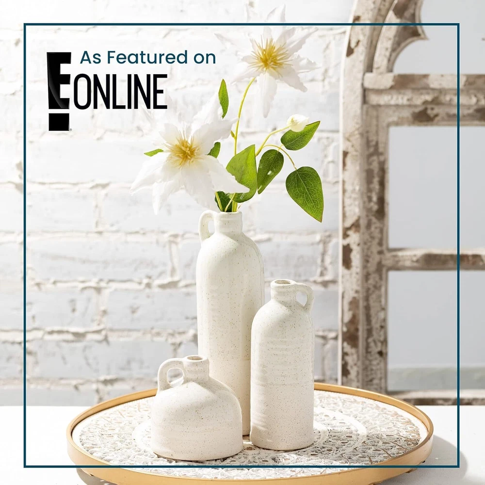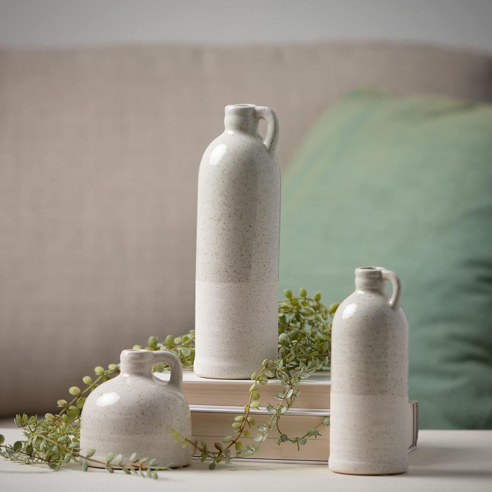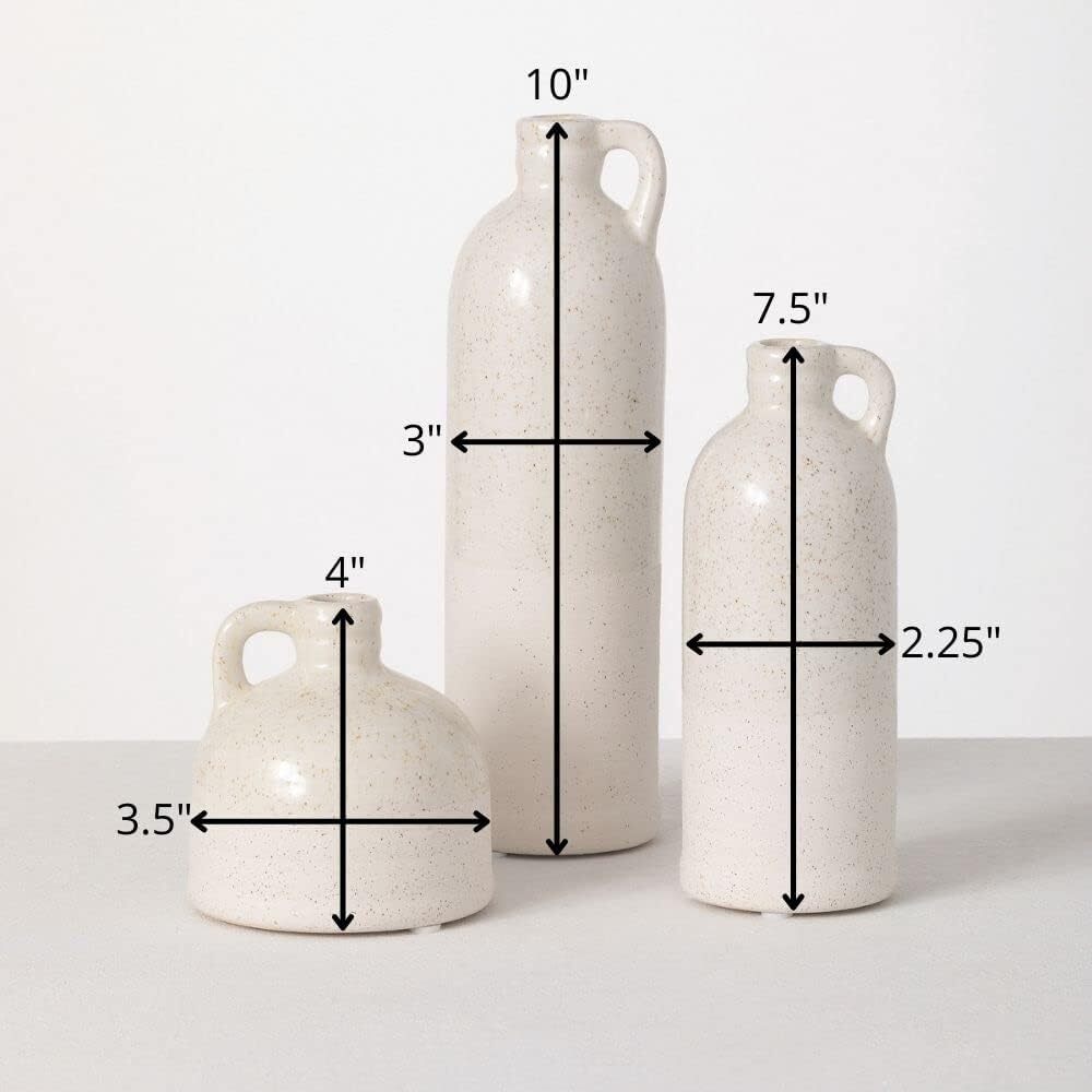Sullivans Modern Farmhouse Distressed Two-Toned White Small Ceramic Jug Product Details Brand: Sullivans Material: Ceramic Color: White Special Feature: Distressed, Two-Toned, Ceramic Style: Farmhouse Product Dimensions: 3"W x 10"H Shape: Bottle Item Weight: 2 Pounds With Lid: No Item Weight: 2 pounds Manufacturer: Sullivans Item model number: CM2875 Is Discontinued By Manufacturer: No Fabric Type: Ceramic Tick-repellent material: Ceramic Finish types: Ceramic Number of pieces: 3 Batteries required: No Ceramic Decorate Your Home with Personality – Showcase your style with this decorative distressed two- toned off-white ceramic jug set of 3. Create a space in your home with refined rustic, yet elegant and effortlessly beautiful home décor pieces, perfect for all seasons and Holidays. Multi-Purpose Decorative Ceramic Faux Floral Jug Set – (measuring 3”L x 3”W x 10”H; 2.25”L x 2.25”W x 7.5”H; 3.5”L x 3.5”W x 4”H, ) This decorative jug set can be used in many different ways. The distressed design is so stunning, you can use it on its own for a beautiful statement piece or add in faux florals, stems, bouquets, and greenery for an added pop of color. Perfect for your tabletop, shelf in a family room, mantel, dining room, bathroom or covered patio Long Lasting Quality – Crafted from 100% ceramic, this neutral off-white set of 3 is sure to set the stage anywhere in your home. This durable, high-quality, trend lasting jug set will keep your décor looking fresh and up-to-date year after year Create a Beautiful Centerpiece – This decorative multi-toned ceramic jug set will fit in with an abundance of styles; modern farmhouse, rustic, classic charm, country, and elegant yet simplistic. The versatility of this faux floral jug set makes it perfect to use for wedding, bridal and baby showers. Bring them out for your next gathering for an instant, stunning centerpiece Showcase Your Style with Confidence – Decorating your home brings your personality to life. This stunning ceramic vase set works well with faux florals to take your décor to the next level and wow your guests. The crackled rustic design is so detailed, you can even set it out on its own. With its elegant, timeless look, this set will look beautiful however you decide to use it" For over five decades, Sullivans has specialized in modern home décor - for every style and season. Our design team draws inspiration from around the globe - bringing you beautiful, quality products and freshness to your home.