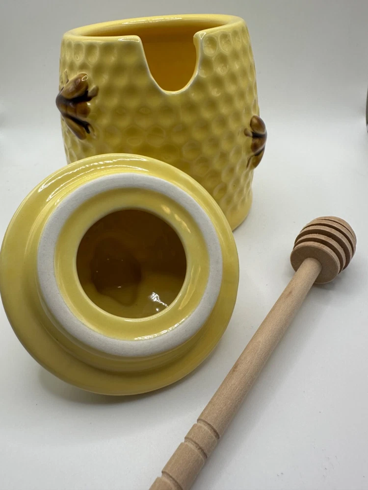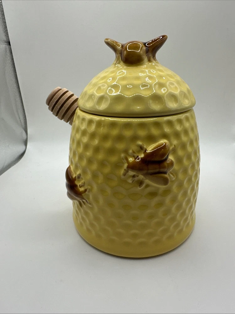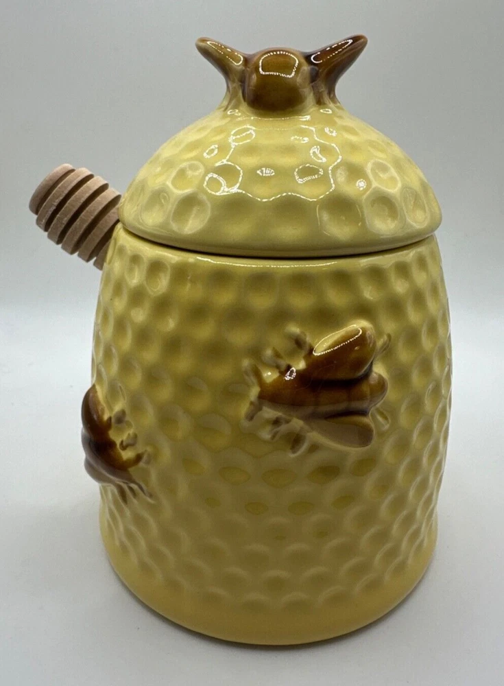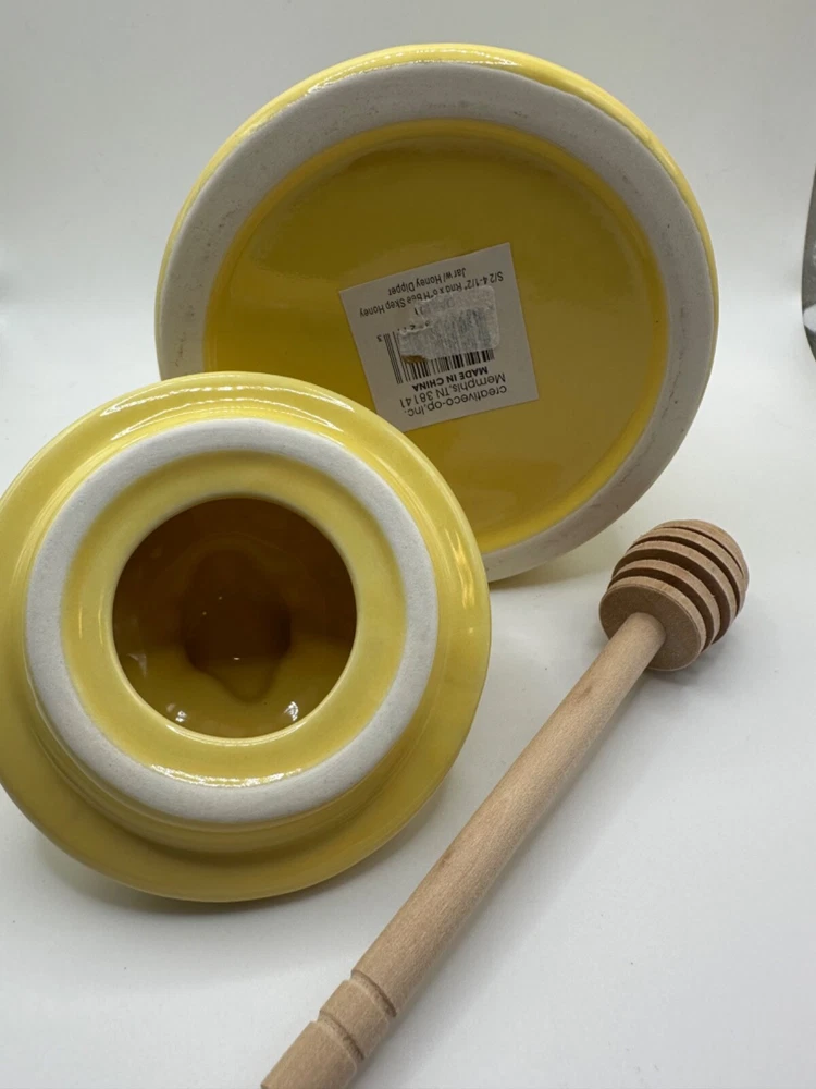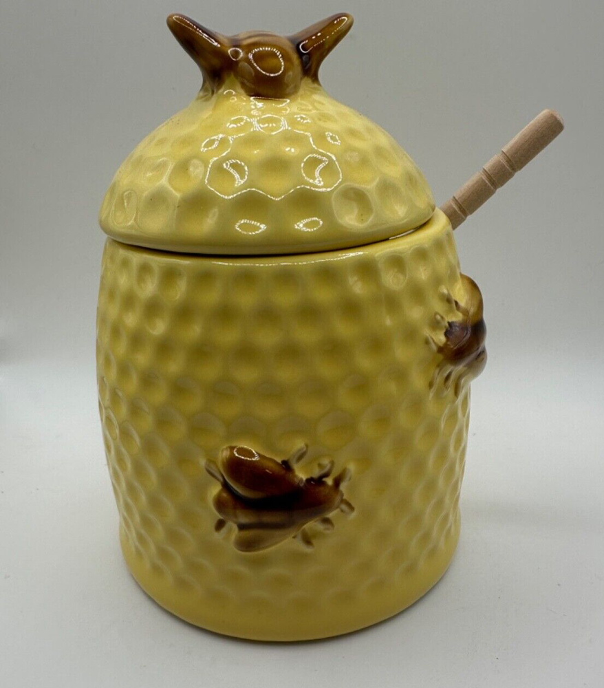 Experience the charm of vintage-inspired decor with the Creative Co-Op Bee Hive Honey Jar. This quaint ceramic piece is adorned in a cheerful yellow and brown motif, evoking the rustic allure of a countryside honeybee apiary. Measuring at a convenient height of 5.5 inches, it's the perfect size for displaying on a kitchen countertop or as a centerpiece.Crafted by Creative Co-Op, known for their commitment to quality and style, this honey pot and dispenser is not only functional but also a delightful aesthetic addition to any home. The jar's unique design, complete with a stick for easy dispensing, brings a touch of whimsy and nostalgia to your table setting or pantry shelf.