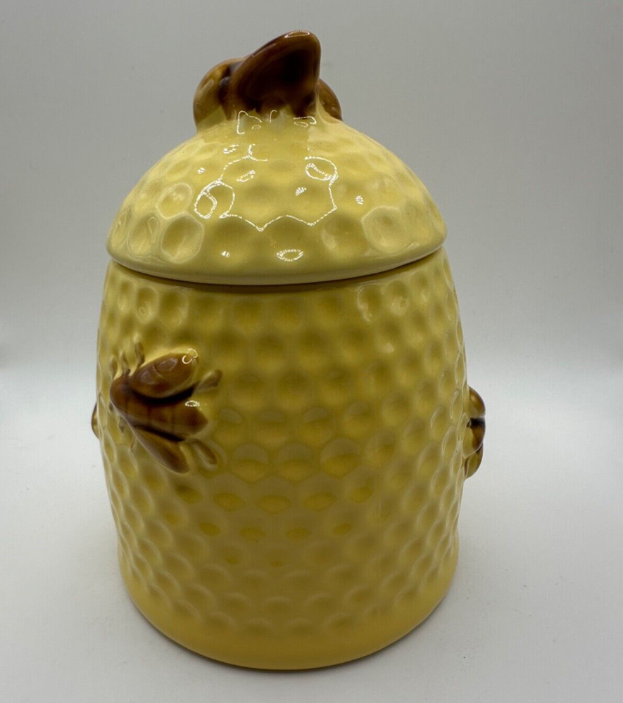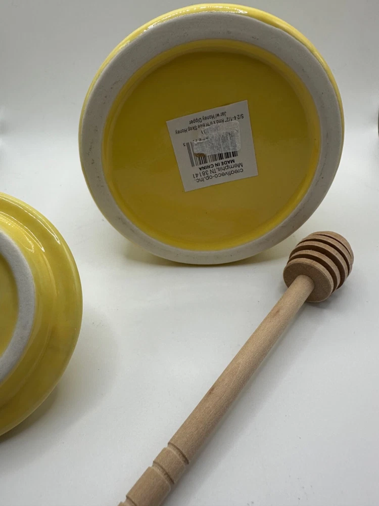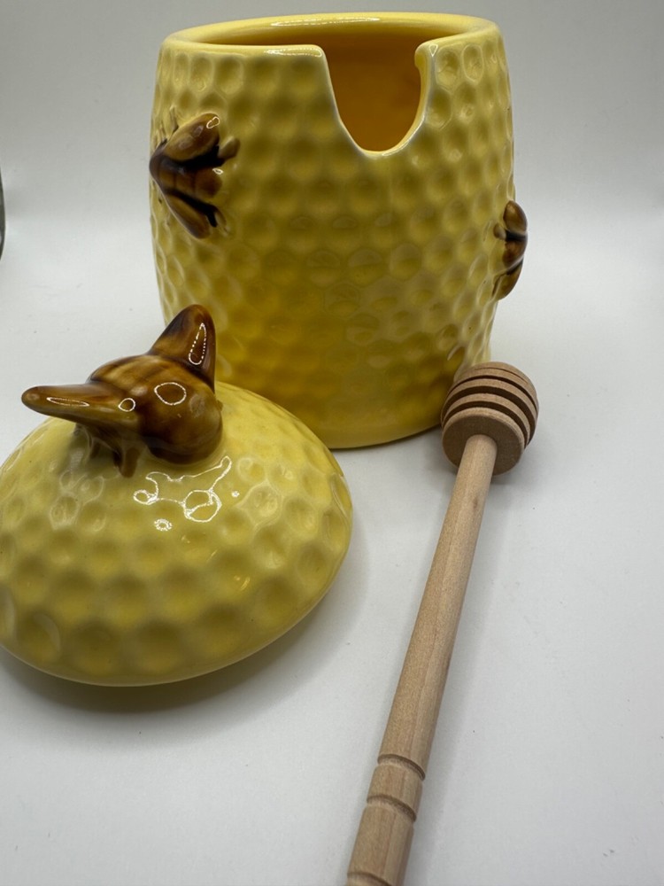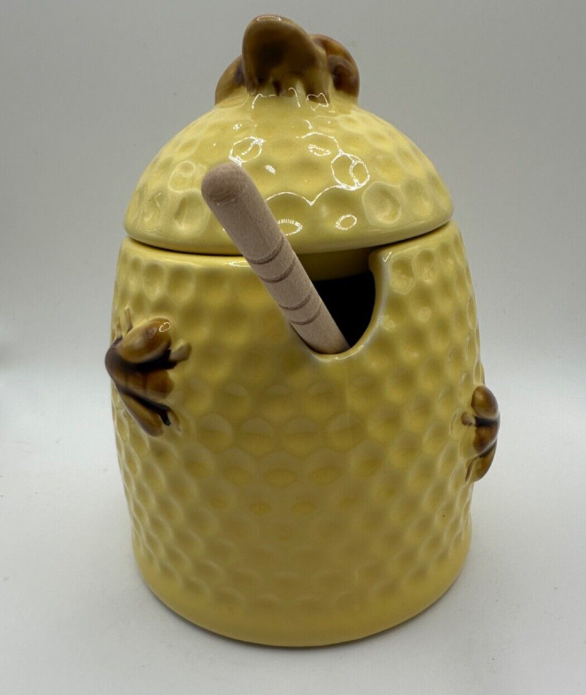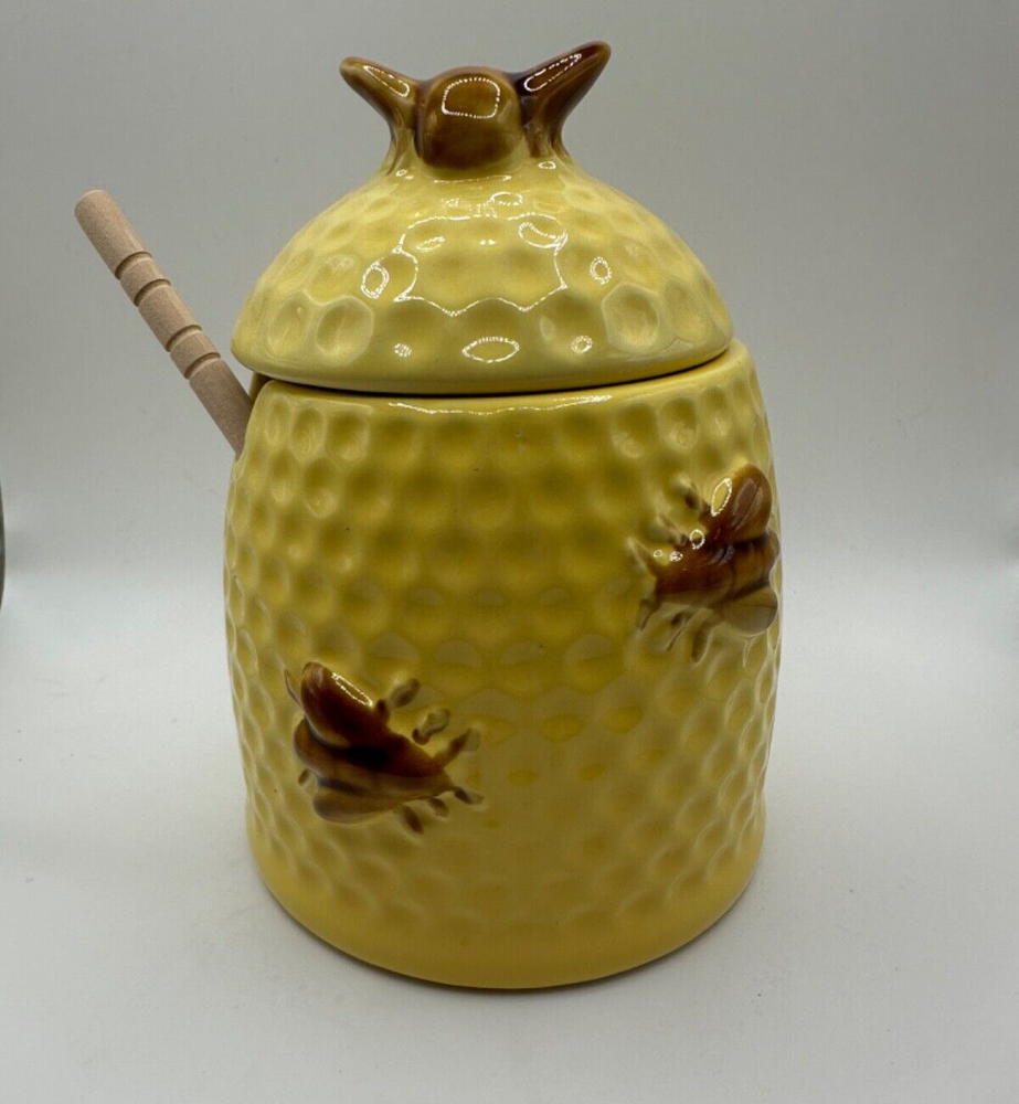 Experience the charm of vintage-inspired decor with the Creative Co-Op Bee Hive Honey Jar. This quaint ceramic piece is adorned in a cheerful yellow and brown motif, evoking the rustic allure of a countryside honeybee apiary. Measuring at a convenient height of 5.5 inches, it's the perfect size for displaying on a kitchen countertop or as a centerpiece.Crafted by Creative Co-Op, known for their commitment to quality and style, this honey pot and dispenser is not only functional but also a delightful aesthetic addition to any home. The jar's unique design, complete with a stick for easy dispensing, brings a touch of whimsy and nostalgia to your table setting or pantry shelf.