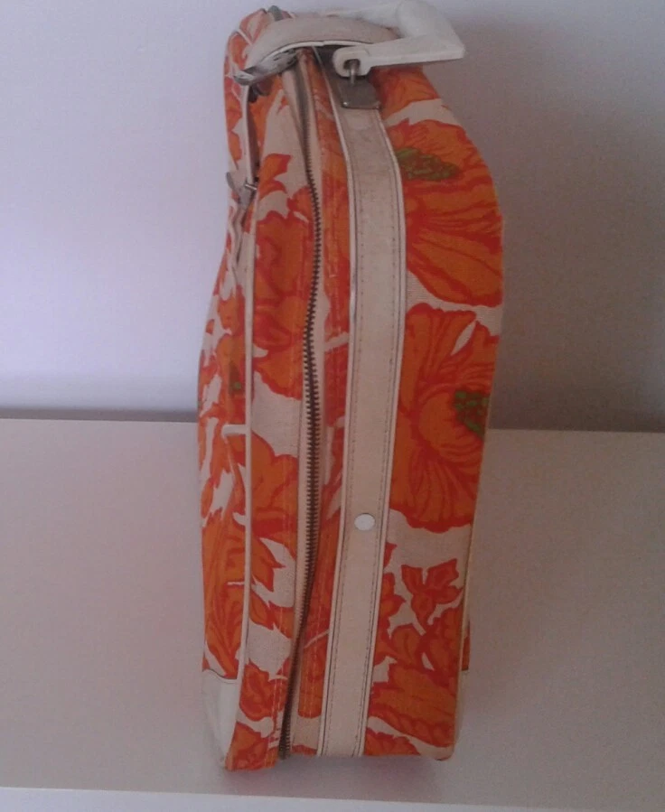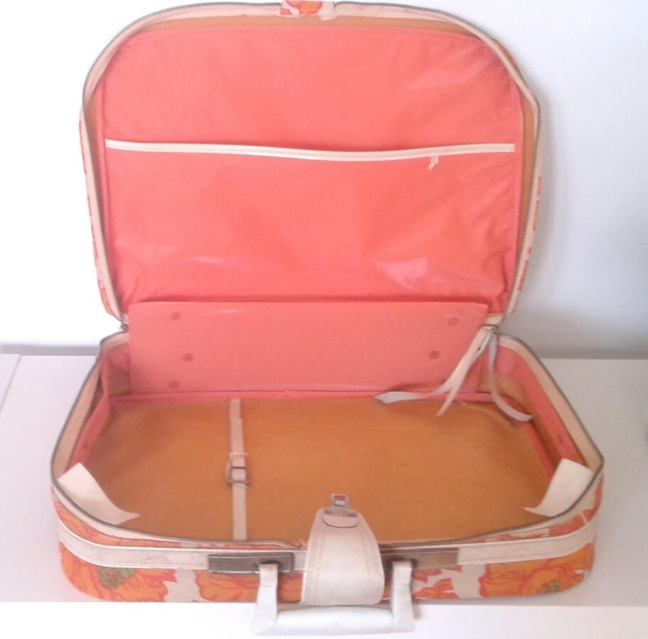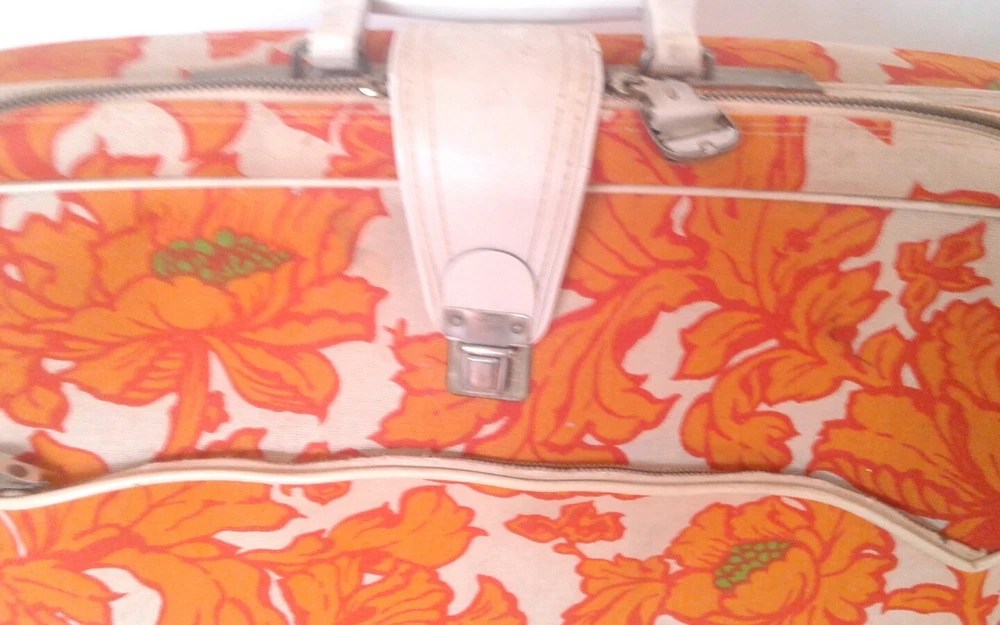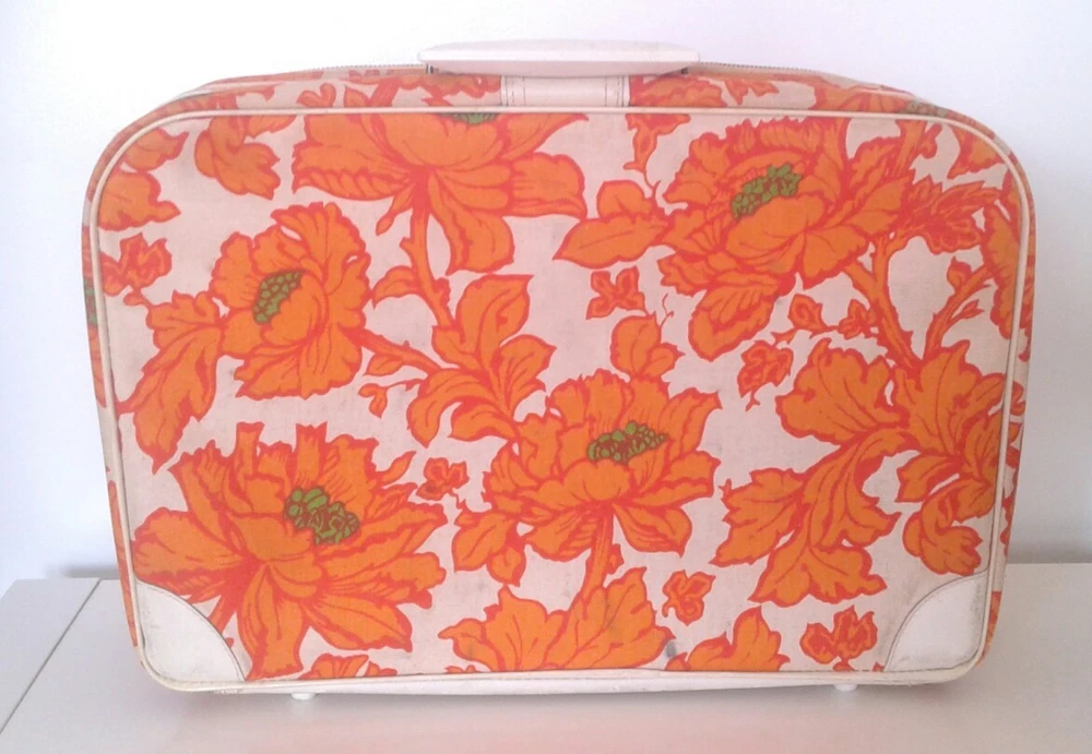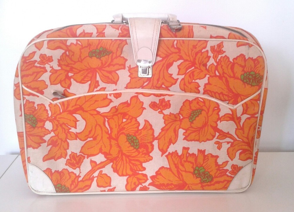 Super groovy suitcase wild orange flowers fabric Mid Mod. Orange, green, cream canvas and vinyl small suitcase/overnight bag. Cream plastic handle, outside zipper pocket. Inside pocket and braces. 18"x12"x4 1/4". Slight musty odor, some marks, keys not included; otherwise, good condition.