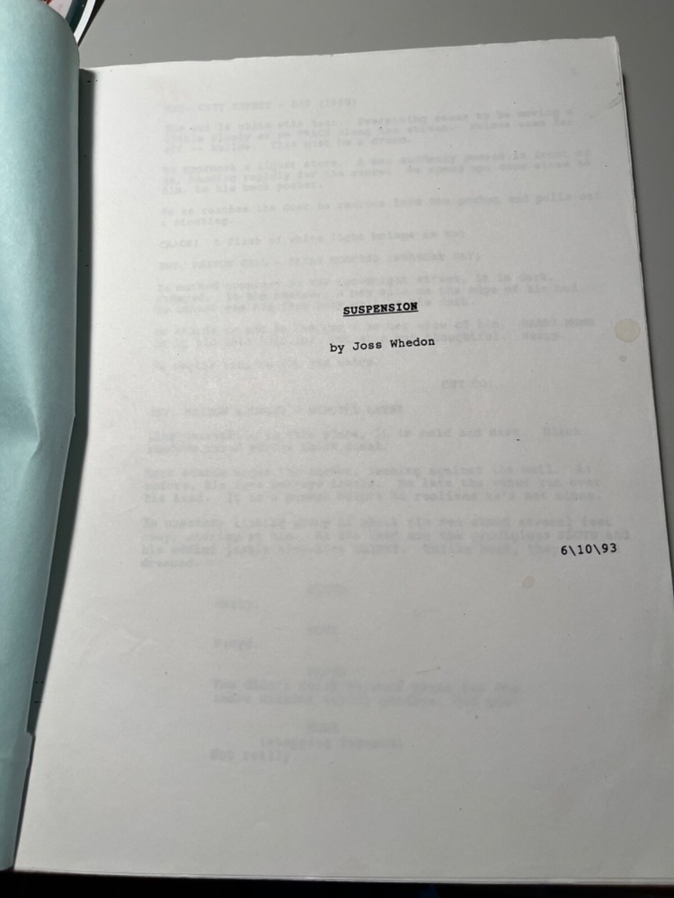 SUSPENSION - original unproduced 1993 screenplay by Joss Whedon. First draft dated 6/10/93. Sold to studio but never produced...