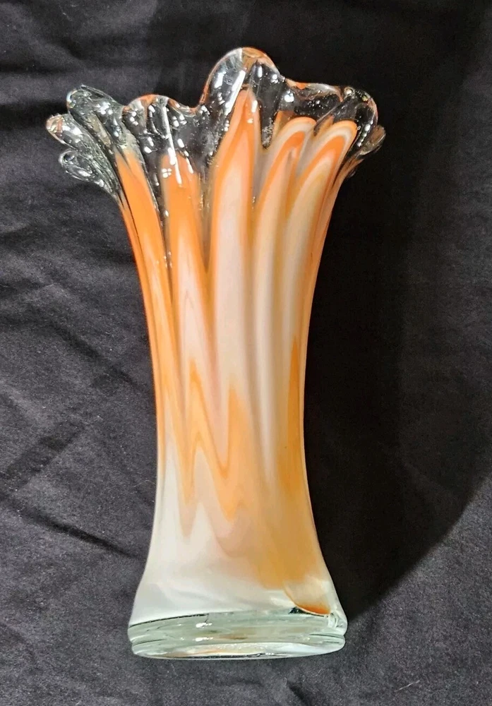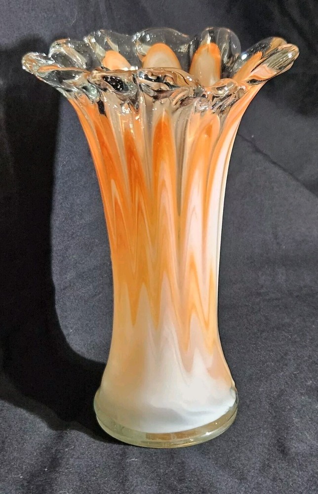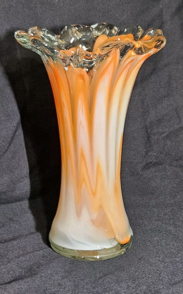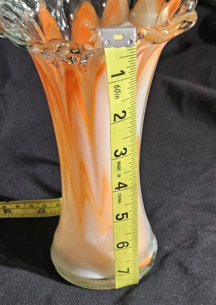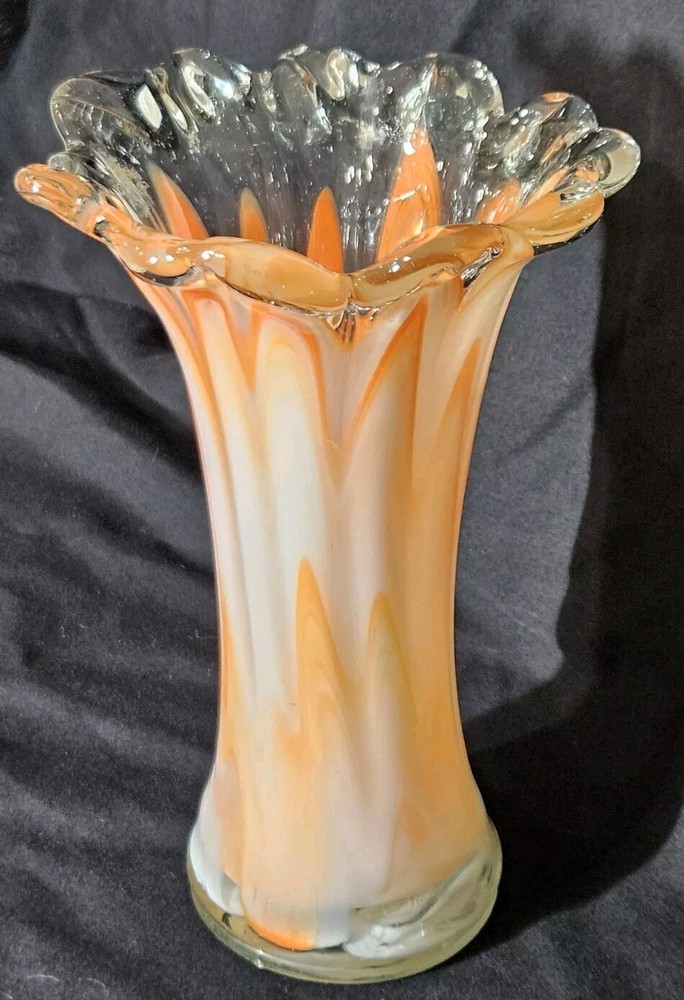 Add a pop of color to your home decor with this stunning Swirled Glass Vase. The vase features a beautiful pattern of swirled orange and white hues, handcrafted from high-quality glass. The glossy finish adds a touch of elegance to this mid-century modern style piece, perfect for displaying your favorite flowers or as a decorative accent on its own. This vase stands approximately 7.5" tall, and the opening is 4.5" wide. With its unique design and vibrant colors, this vase is sure to bring a touch of art and sophistication to any room.