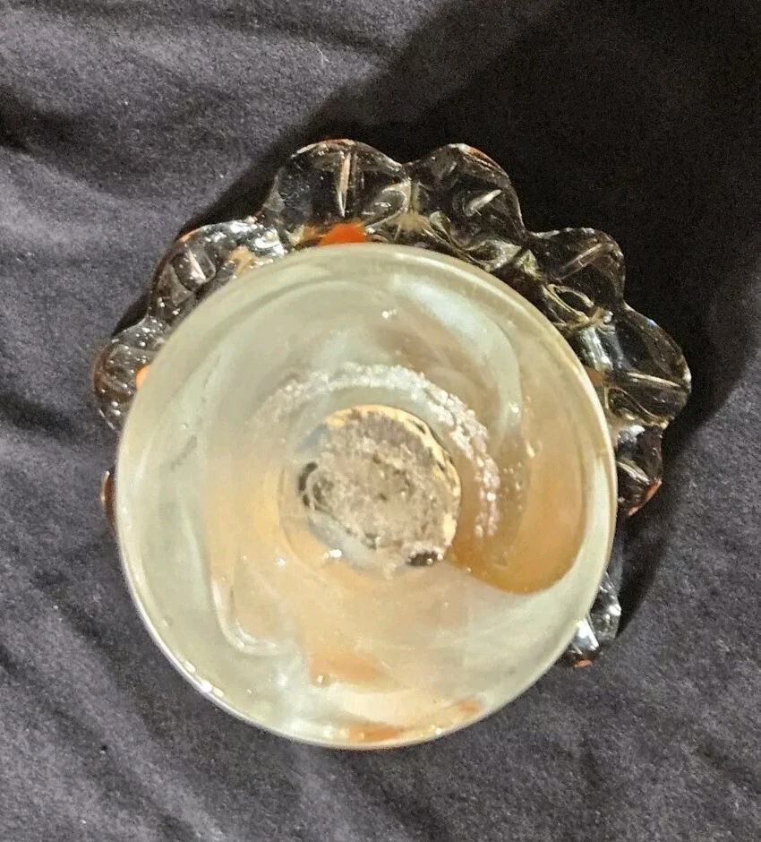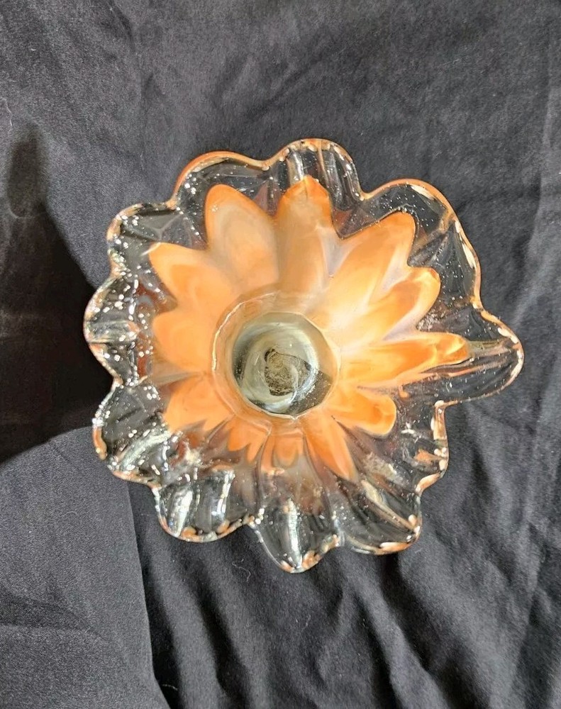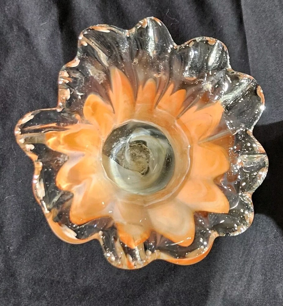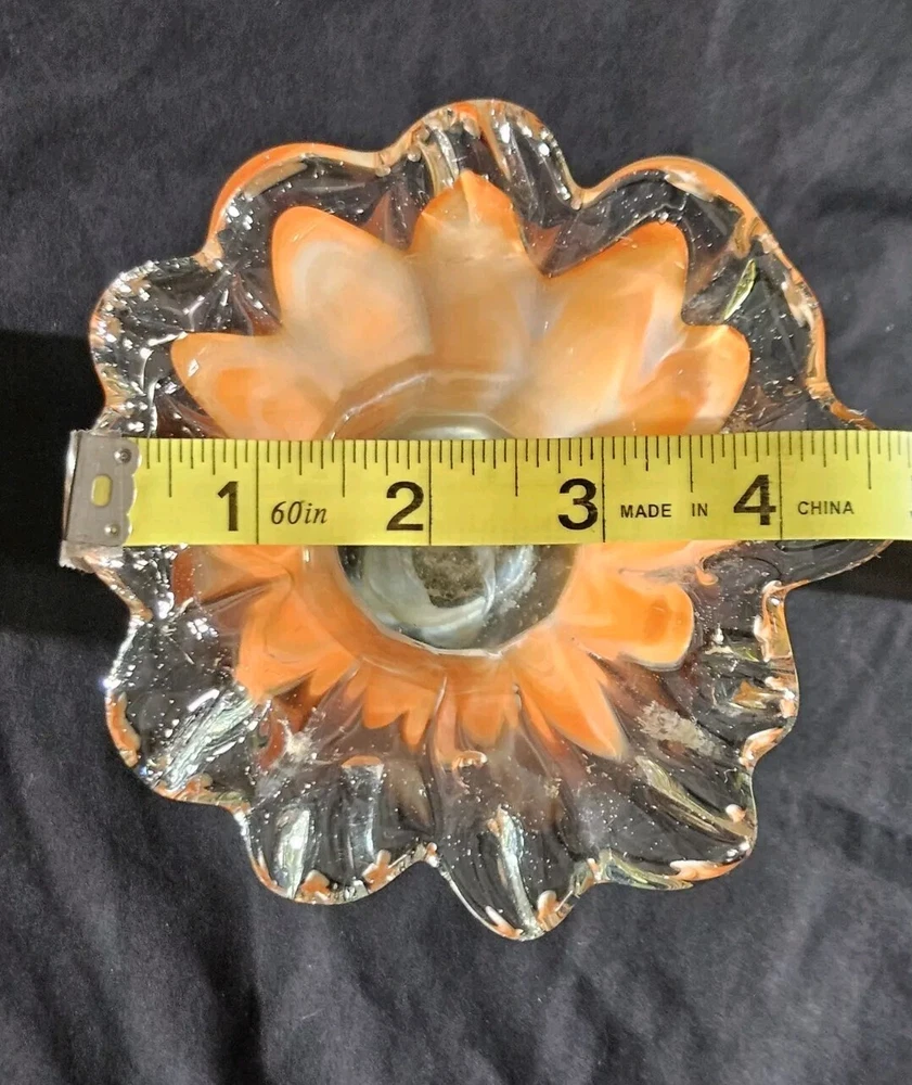 Add a pop of color to your home decor with this stunning Swirled Glass Vase. The vase features a beautiful pattern of swirled orange and white hues, handcrafted from high-quality glass. The glossy finish adds a touch of elegance to this mid-century modern style piece, perfect for displaying your favorite flowers or as a decorative accent on its own. This vase stands approximately 7.5" tall, and the opening is 4.5" wide. With its unique design and vibrant colors, this vase is sure to bring a touch of art and sophistication to any room.