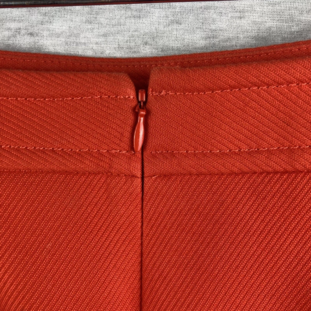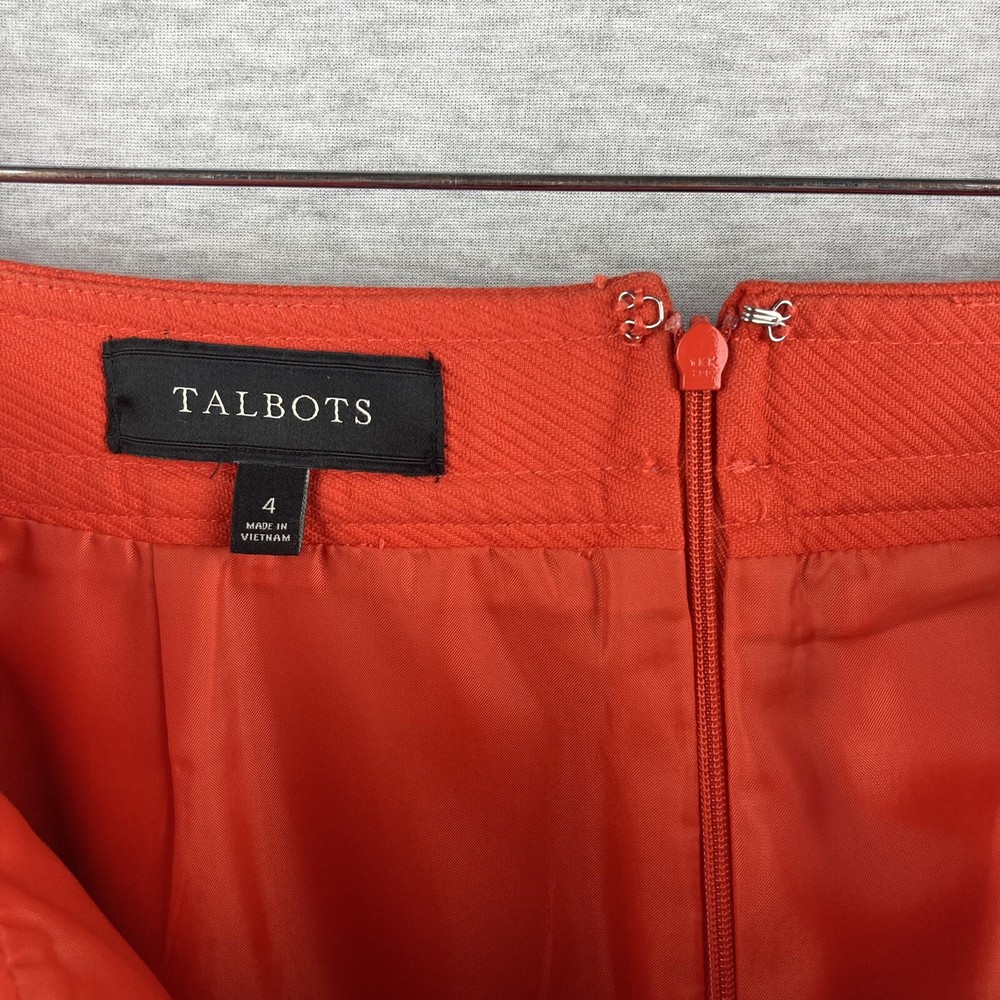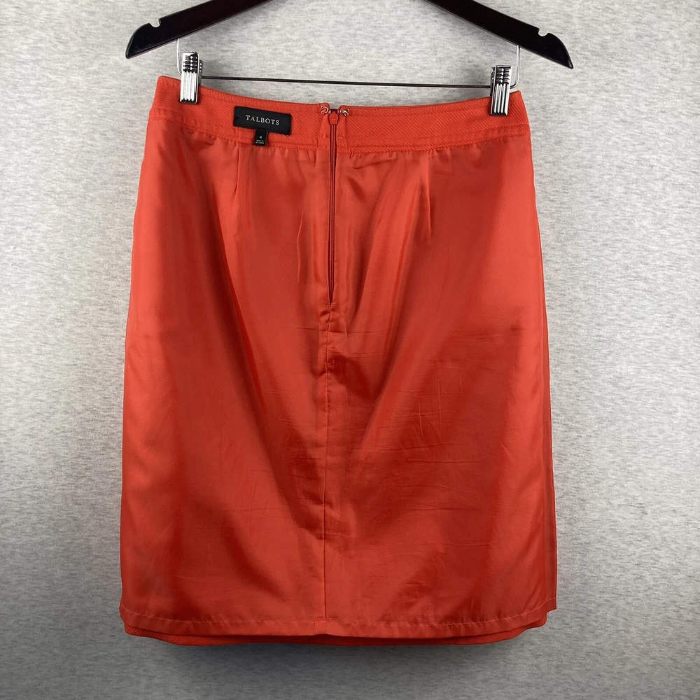 This beautiful Talbots skirt is a must-have for any wardrobe. The vibrant orange color and gold button accents are sure to make a statement. Made from high-quality cotton and fully lined, this knee-length skirt is perfect for casual wear, workwear, or business attire. The skirt features a zip closure and pockets, making it both stylish and functional. It's a straight and a little bit of a pencil style, with a solid pattern and colorful theme. The fabric type is cotton, with “dry clean” care instructions. The skirt is a size 4 and is of regular size type. Please inspect all photos as they are part of the items description. Item will ship at sellers discretion using USPS.