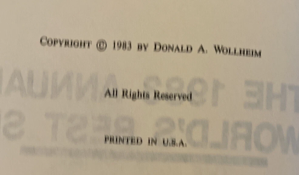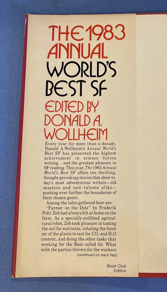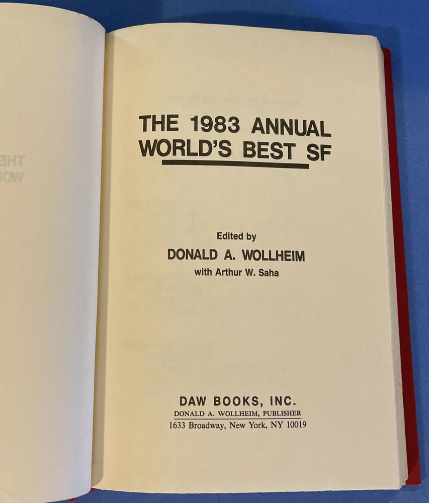 THE 1983 ANNUAL WORLD'S BEST SF - Wollheim (Editor), 1983 Daw Books Hardcover. **************************************** Please see all photos to help determine Condition We are not book experts and all information is to the best of knowledge Book was part of a Hugh collection I recently purchased from an estate of collector. Books in the photographs are the books you will receive **************************************** Please look at our eBay store for unique collectibles and quality vintage items. Read our Seller Feedback and shop with confidence. PLEASE DO NOT PAY FOR YOUR MULTIPLE ITEMS INDIVIDUALLY - WE WILL INVOICE YOU WITH COMBINED SHIPPING. THANKS! See all the photos as they are part of the description and show condition . Item pictured is item that you will receive. sold as is. Please ask any and all questions BEFORE purchasing. I try to describe as best as I can and all sales are AS IS. We are not experts on any items and all information is to the best of our knowledge. High Value items will be shipped insured and may require signature on delivery. clear T701