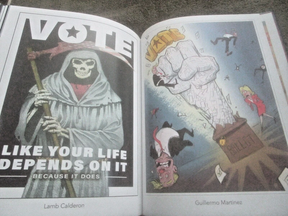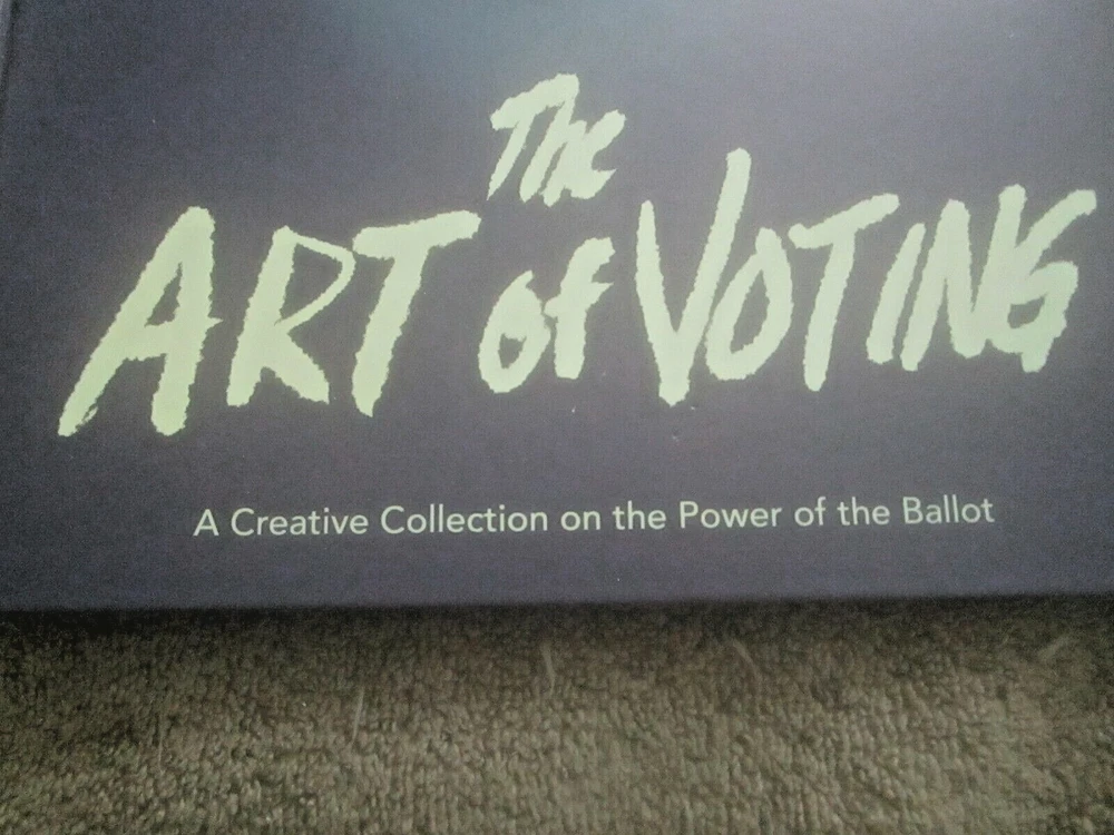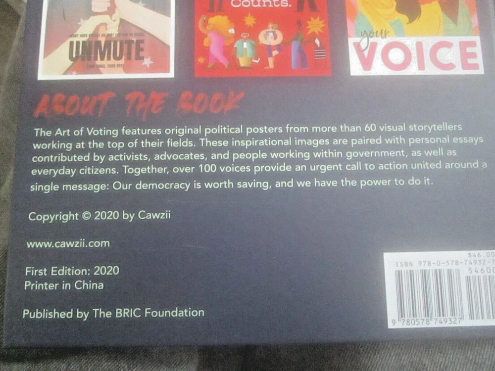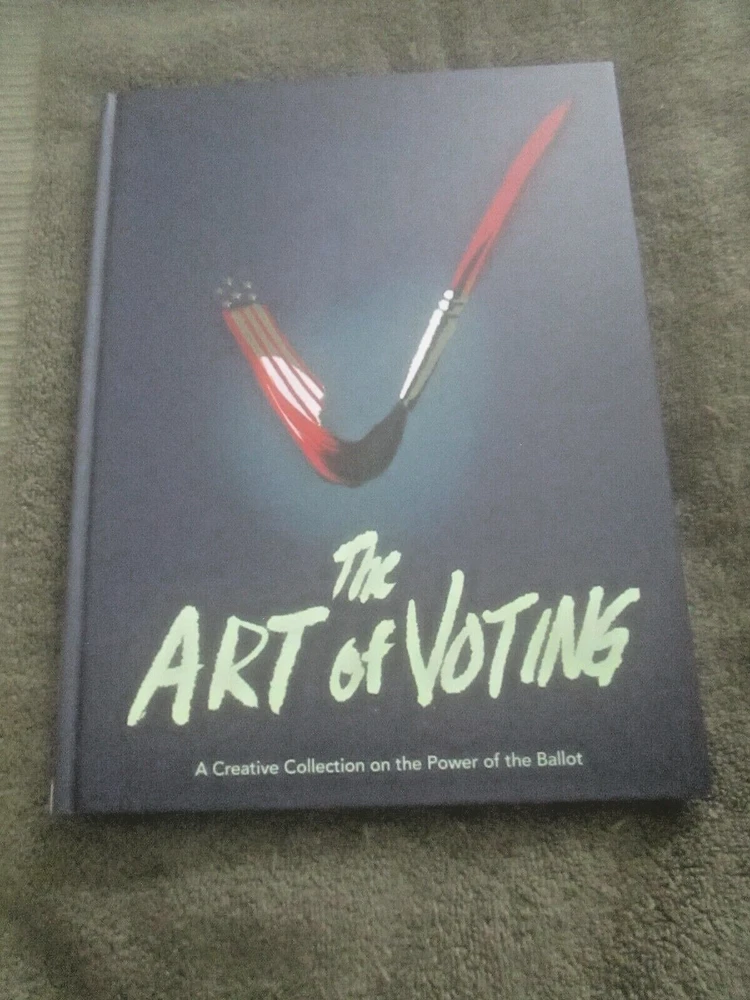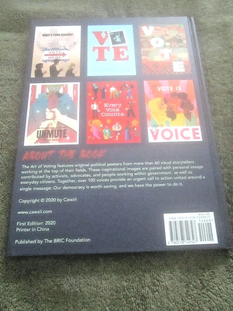 THE ART OF VOTING: A CRTEATIVE COLLECTION ON THE POWER OF THE BALLOT, Foreword by Angela Davis, Introduction by Alison Mann and Stephanie Perea, 2020 ist edition, copyright by Cawzii, published by The Bric Corporation, 12.225 x 9.2-inch semi-glossy HB, no DJ as issued, 105 numbered pp. + 3 unnumbered pages (2 with ACKNOWLEDGEMENTS, one ABOUT THE CREATORS shared with copyright info), all printed on thick, white, se,i=gl;ossy stock which looks new and durable; $46.00 in bar code box at lower rear corner). This is a lovely, creative, family-friendly book about the importance of voting. It also showcases dozens of talented newer poster artists. Eacj photo of a poster has the artists' name in the bottom white edge. There are also many punchy, fun civis lessons about why folks of voting age should exercise the franchise. Although only one poster has an image of Doanld Trump and it was published during the pandemic (so a few figures are wearing masks, and one urges viewers to "Vote Like Your Life Depended On It," it's more progressive than specifically anti-Trump. It's an impressive, fun, educational book, and its message is extremely relevant. There are 2 other copies on eBay. The one listed as good due to rubbed white damage at the center of the lower back cover, is otherwise fine and listed at$49.99 with free shipping. The copy listed as new, accompanied by cover photos only, is $24.00 +$14.19 shipping. Mine like new with 24 pix for you to examine. The Buy-It-Now price of $34.00 includes shipping bubble-wrapped in a cardboard box via media mail, which takes around 7 days with tracking, less in California.