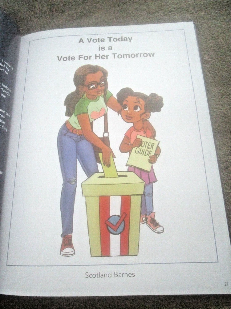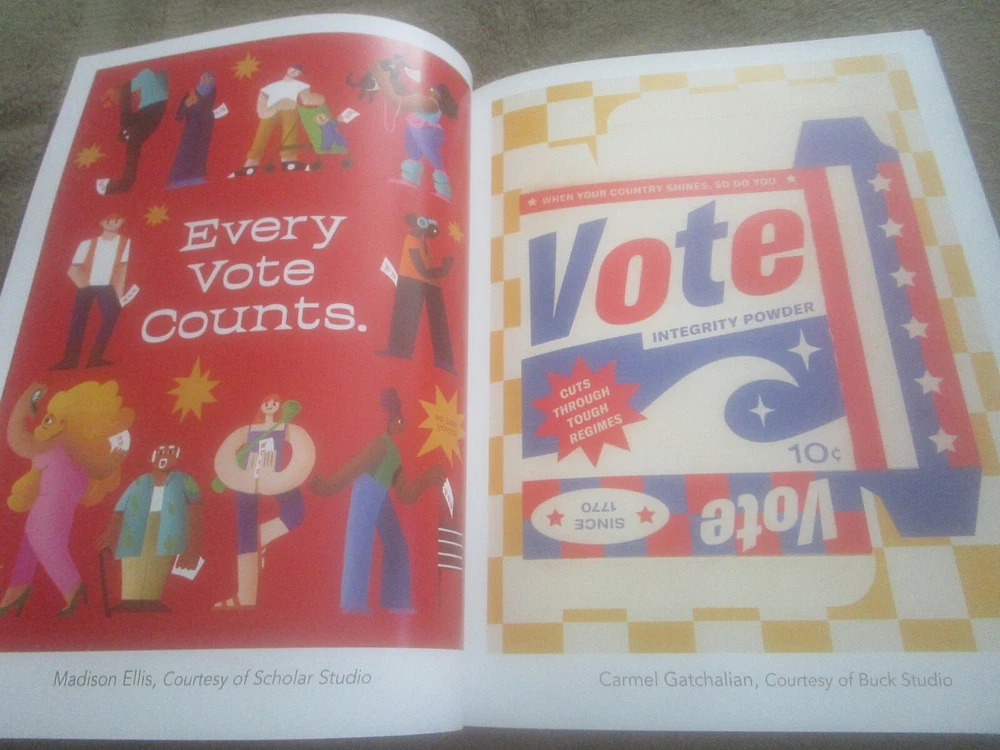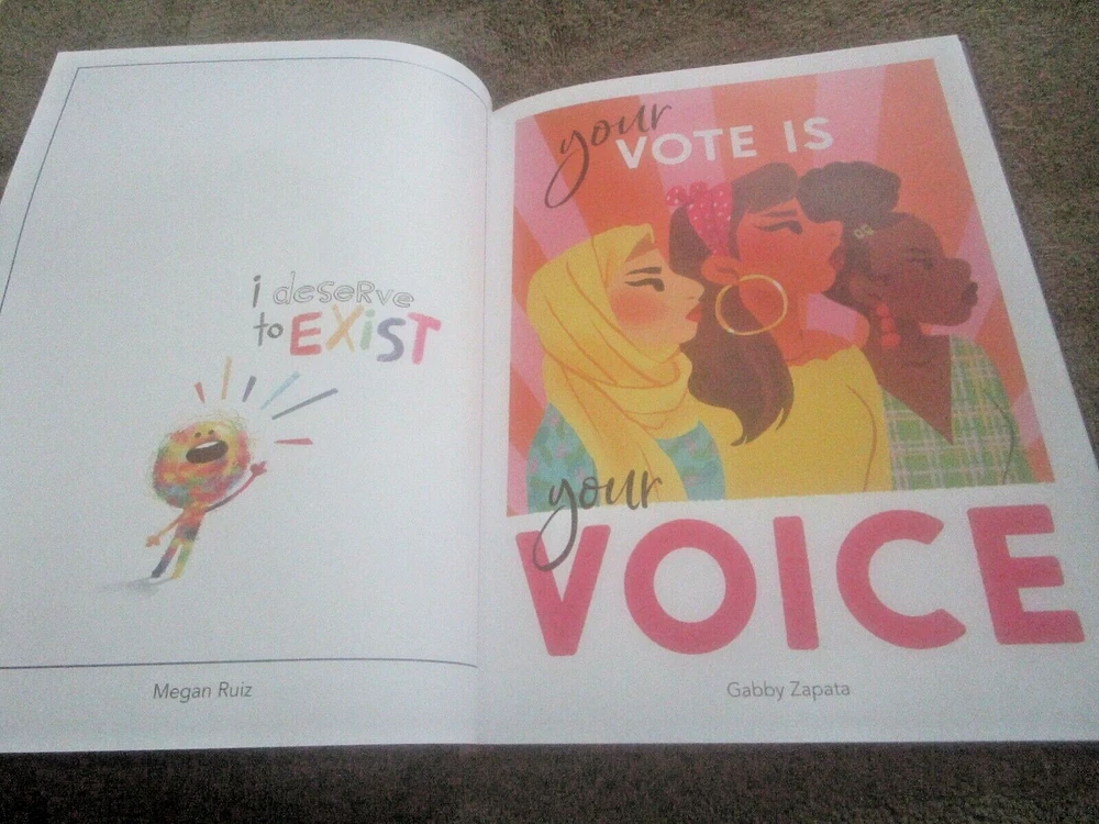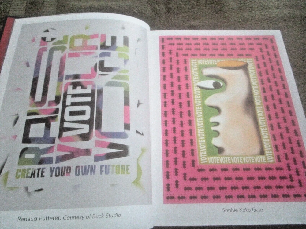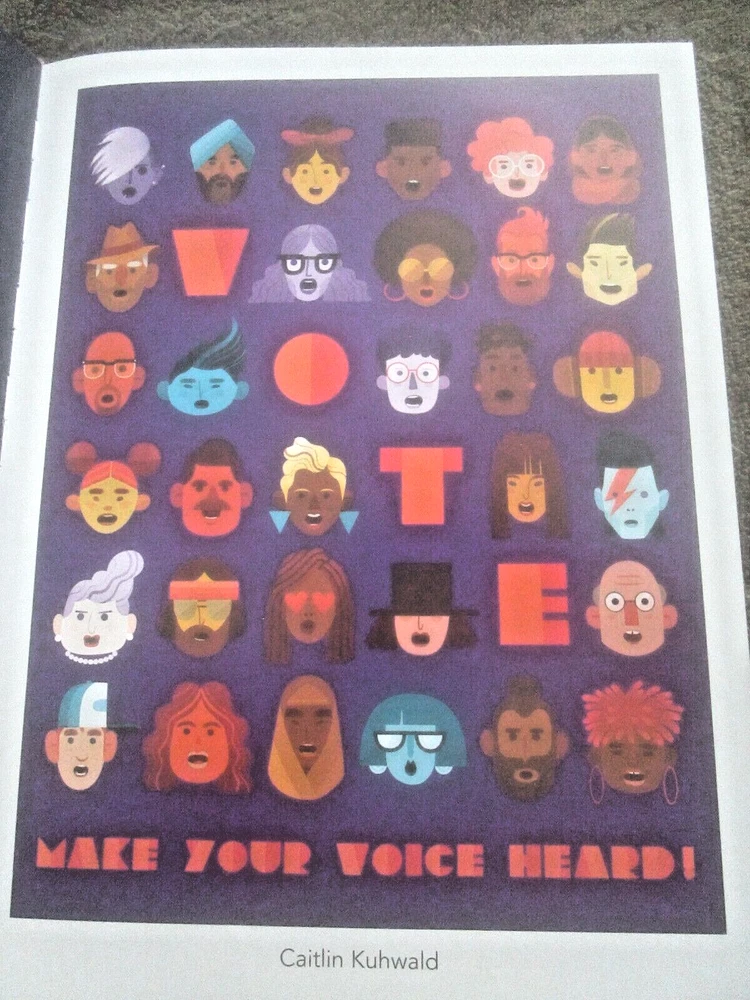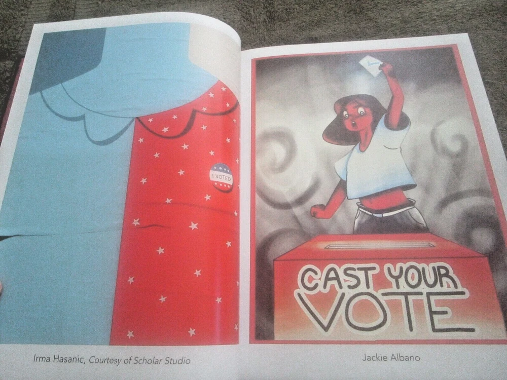 THE ART OF VOTING: A CRTEATIVE COLLECTION ON THE POWER OF THE BALLOT, Foreword by Angela Davis, Introduction by Alison Mann and Stephanie Perea, 2020 ist edition, copyright by Cawzii, published by The Bric Corporation, 12.225 x 9.2-inch semi-glossy HB, no DJ as issued, 105 numbered pp. + 3 unnumbered pages (2 with ACKNOWLEDGEMENTS, one ABOUT THE CREATORS shared with copyright info), all printed on thick, white, se,i=gl;ossy stock which looks new and durable; $46.00 in bar code box at lower rear corner). This is a lovely, creative, family-friendly book about the importance of voting. It also showcases dozens of talented newer poster artists. Eacj photo of a poster has the artists' name in the bottom white edge. There are also many punchy, fun civis lessons about why folks of voting age should exercise the franchise. Although only one poster has an image of Doanld Trump and it was published during the pandemic (so a few figures are wearing masks, and one urges viewers to "Vote Like Your Life Depended On It," it's more progressive than specifically anti-Trump. It's an impressive, fun, educational book, and its message is extremely relevant. There are 2 other copies on eBay. The one listed as good due to rubbed white damage at the center of the lower back cover, is otherwise fine and listed at$49.99 with free shipping. The copy listed as new, accompanied by cover photos only, is $24.00 +$14.19 shipping. Mine like new with 24 pix for you to examine. The Buy-It-Now price of $34.00 includes shipping bubble-wrapped in a cardboard box via media mail, which takes around 7 days with tracking, less in California.