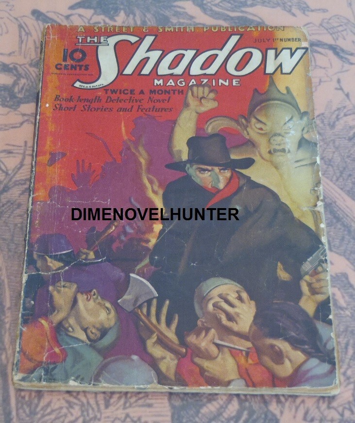 This is a ORIGINAL SCARCE ISSUE NOT A REPRINT THE SHADOW JULY 01 1935 "FATE OF JOSS" WRITTEN BY MAXWELL GRANT 15 THE SHADOW 1933 THRU 1937 WATCH VIDEO FOR THE VERY BEST DESCRIPTION I CAN OFFER!! CLICK PHOTO TWICE TO VIEW VIDEO This book is in good condition with some chipping on edges, small tears and marks. A dealer stamp is on inside page. Paper quality is very good. This bo ok is one of a large collection we are placing on our eBay store of rarely available items and books. The book is one of the many rarely seen items that we will be offering over the next few months from a collectors estate sale. Once these are gone how long before you will see them come up again. Once a collector buys them they go right back into a vault somewhere. We always take into consideration a customers history of buying from us when addressing "BEST OFFER" option. We will respond to you within the allotted time but if it has just been listed we will give it the full time period to allow others to make similar offers or purchase. We list many, many items that may be "One of a kind" or simply "One of a kind on the market" . These items usually are placed in collections which are not seen again on the market until once again sold by collectors. If you collect, you realize that is a once in a lifetime occurrence for collectors..... BOX #125