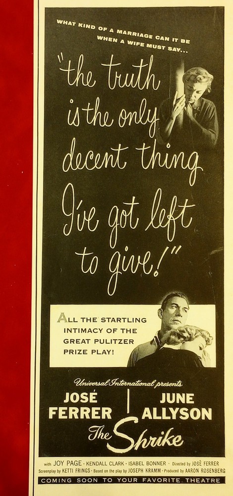 THE SHRIKE * RARE VINTAGE 1955 PROMO BANNER AD JOSS FERRER JUNE ALLYSON JOY PAGE * This rare historical full-length promo banner ad is NOT A REPRODUCTION and guaranteed vintage from 1955. Measures 14" long x 6" wide and is in collector's grade condition. Suitable for Framing and fits perfectly into a standard size 11" x 14" frame. FAST SHIPPING IN AN ARCHIVAL SLEEVE...!!! h