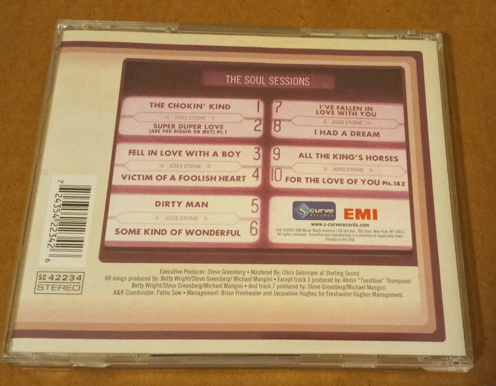 "THE" SOUL SESSIONS"by JOSS STONE (Singer) (CD, Sep-2003, S-Curve (USA)). SC 7243 5 42234 2 6. The disc is in very good condition has some wear. The inlay / artwork is in like new condition. The case ...
