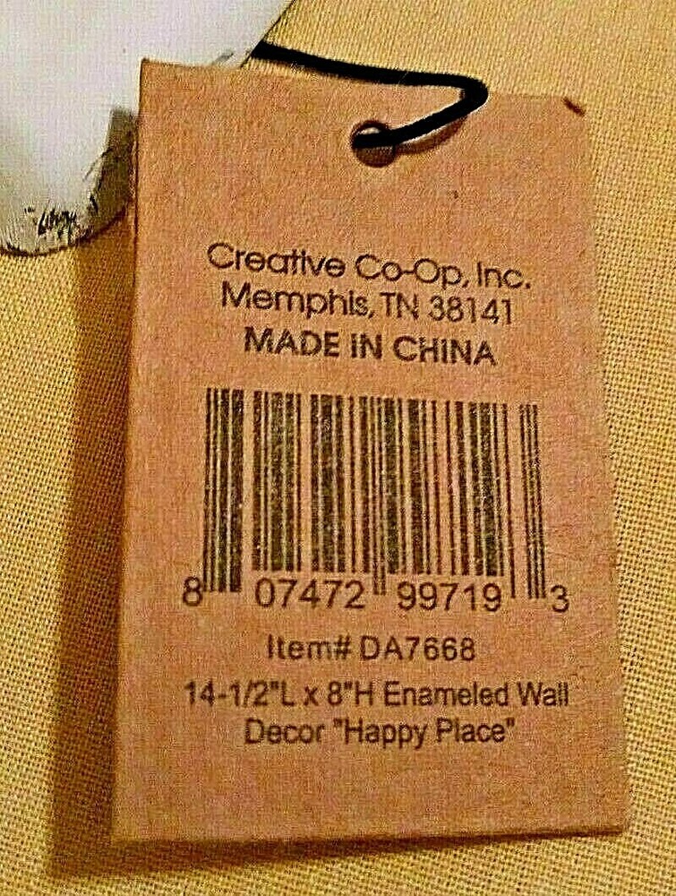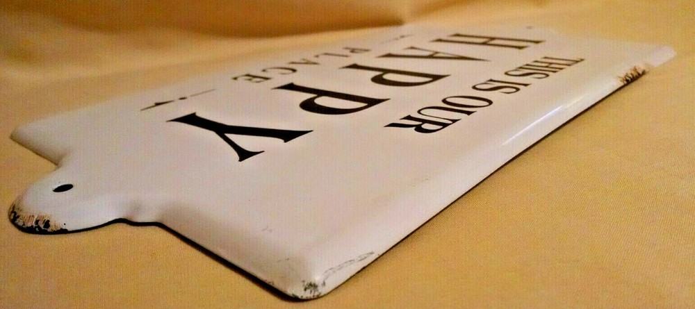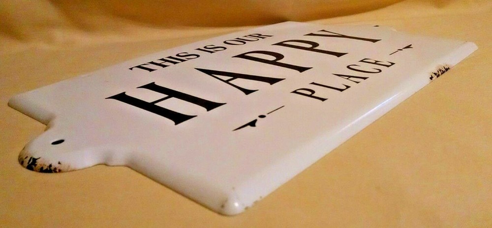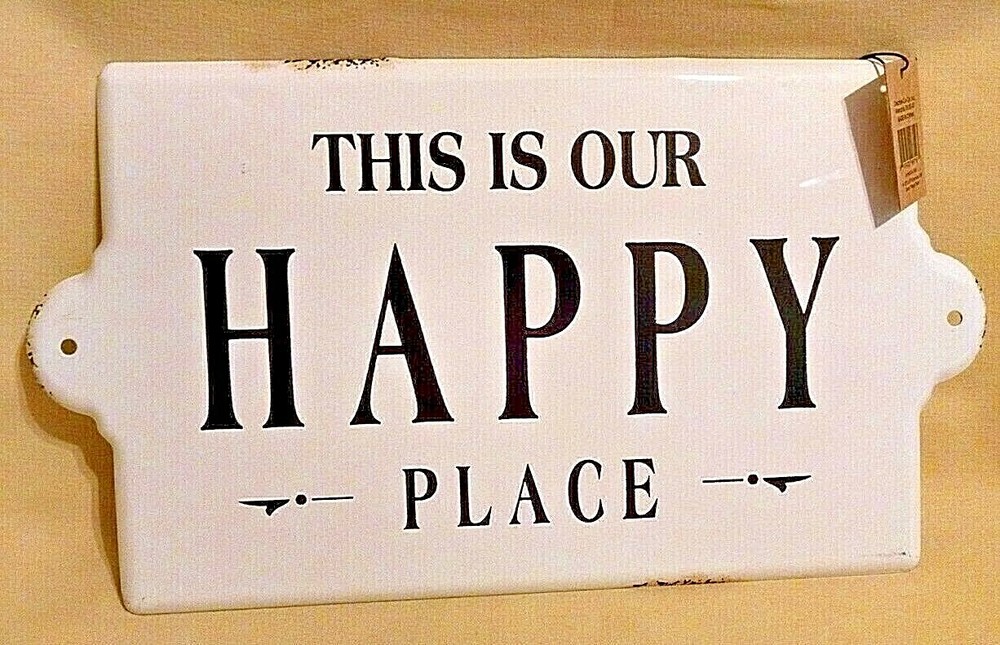 ** You are bidding on a Brand New, Tags Still Attached Enameled Wall Sign Hanging “This Is Out Happy Place” by Creative Co-Op, Inc. – White with Black Lettering, Retro “weathered” look, 2 Predrilled Holes and 2 Hangers for multiple hanging options – Item #DA7668, Made in China, Bar Code 807472997193 – measures 14 ½ by 8 inches – comes to you in good and clean condition. {30315.2232833} I am by no means an expert, so please feel free to ask plenty of questions. I will ship USPS - either Priority or Standard Post depending on the size and weight of the item. Please note that if you are bidding from outside of the United States, the shipping will be more expensive. Please contact me regarding a quote on shipping or refer to the Shipping Calculator for shipping charges. In all instances, please wait for an invoice before paying so that I can give you the correct amount for shipping and handling. I only accept PayPal due to EBay's requirements. I am always happy to provide additional pictures or answer additional questions. Please note that I will reply during the evening hours since I am may be unavailable to my computer during the daytime hours. Your purchase comes from a clean, smoke free, pet free home. I try to describe the overall condition as best possible. Please ask questions BEFORE bidding. Your purchase is FINAL and NO REFUNDS will be given. Also, please note that you are buying this item AS IS ? be aware of any toy recalls if necessary and know that you are purchasing a collectible for an adult versus a toy for a child. I do not add insurance automatically - if you would like to insure your item, please let me know. Please contact me within 48 hours of receiving your invoice so that we can make payment/