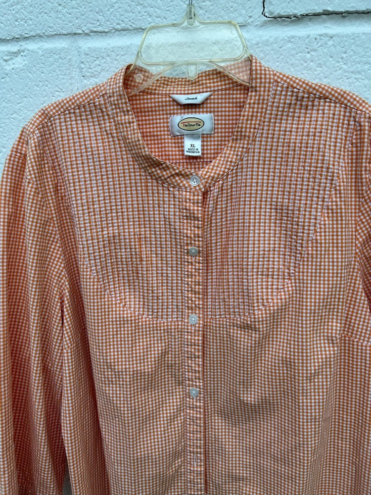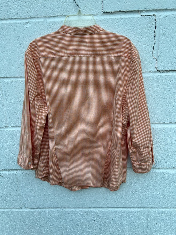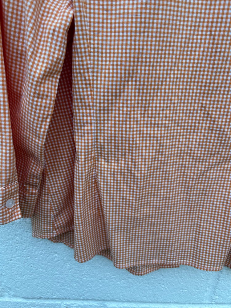 Perfect Condition. Features a small amount of SPANDEX (4%) to ensure a perfect fit. Stylish yoke neck style with rouching ( see pic) Great with capris, or can be worn nicely through fall due to the nice shade of orange. Sort of reminds me of gingham MEASUREMENTS ARE APPROX, TAKEN WHILE LYING FLAT AND BUTTONED: Underarm to cuff: 12" Chest: 20" Length: 25" Shoulder to Shoulder" 16.5"