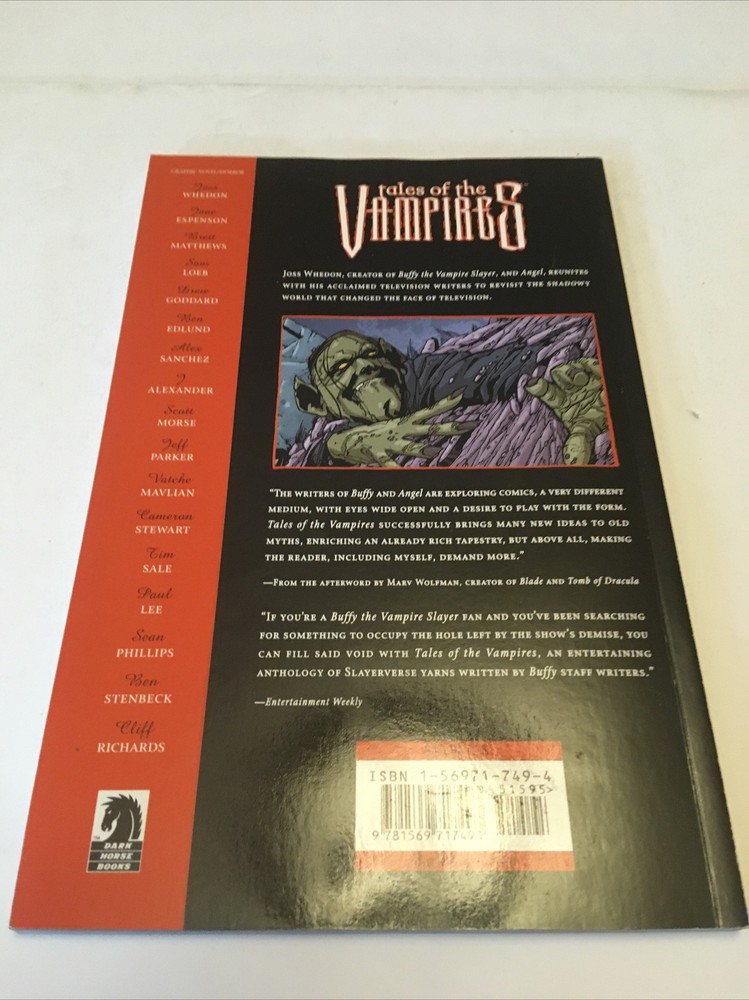 Tales of the Vampires - Joss Whedon 2004 Dark Horse Books 1st edition PB VF. This is a solid collected 1st print edition of tales of the vampires from the creator of Buffy the vampire slayer Joss Whedon. The book is unread and in solid condition but it does have slight wear along the edges. I’m calling VF+ But please look at the pictures and use your own best judgement as far as the condition goes, as we are not experts at grading. Also, for each 25 dollars you spend you get a free comic while supplies last. Please look carefully at all pictures, as they are part of the description. Thanks for looking! We generally ship our items within 24 business hours. If you have any questions about an auction or an item you've gotten from us, please contact us. We are happy to help and take care of any issues you might have. Please be aware that vintage and antique will typically show some signs of age - ie, colors not as crisp as new, plastic parts or book pages may have yellowing, and may collect dust in storage, etc. All of our auction style listings are no reserve, because reserves are lame. We do offer combined shipping, so be sure to check out our other listings and our store.