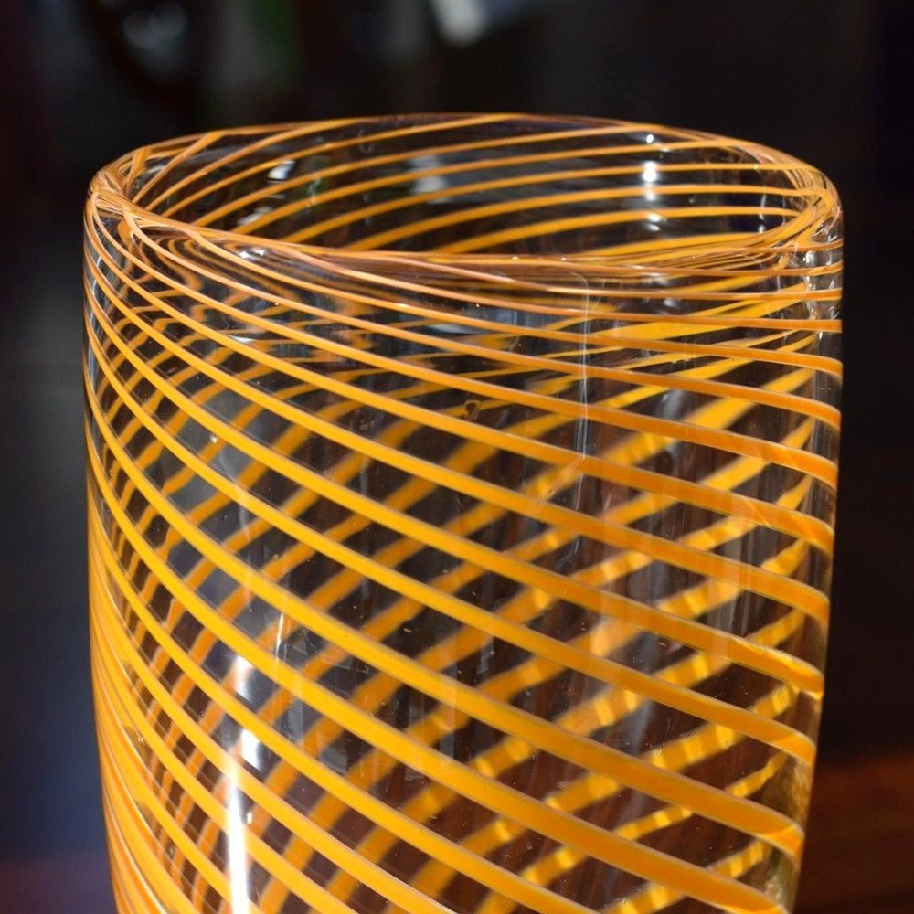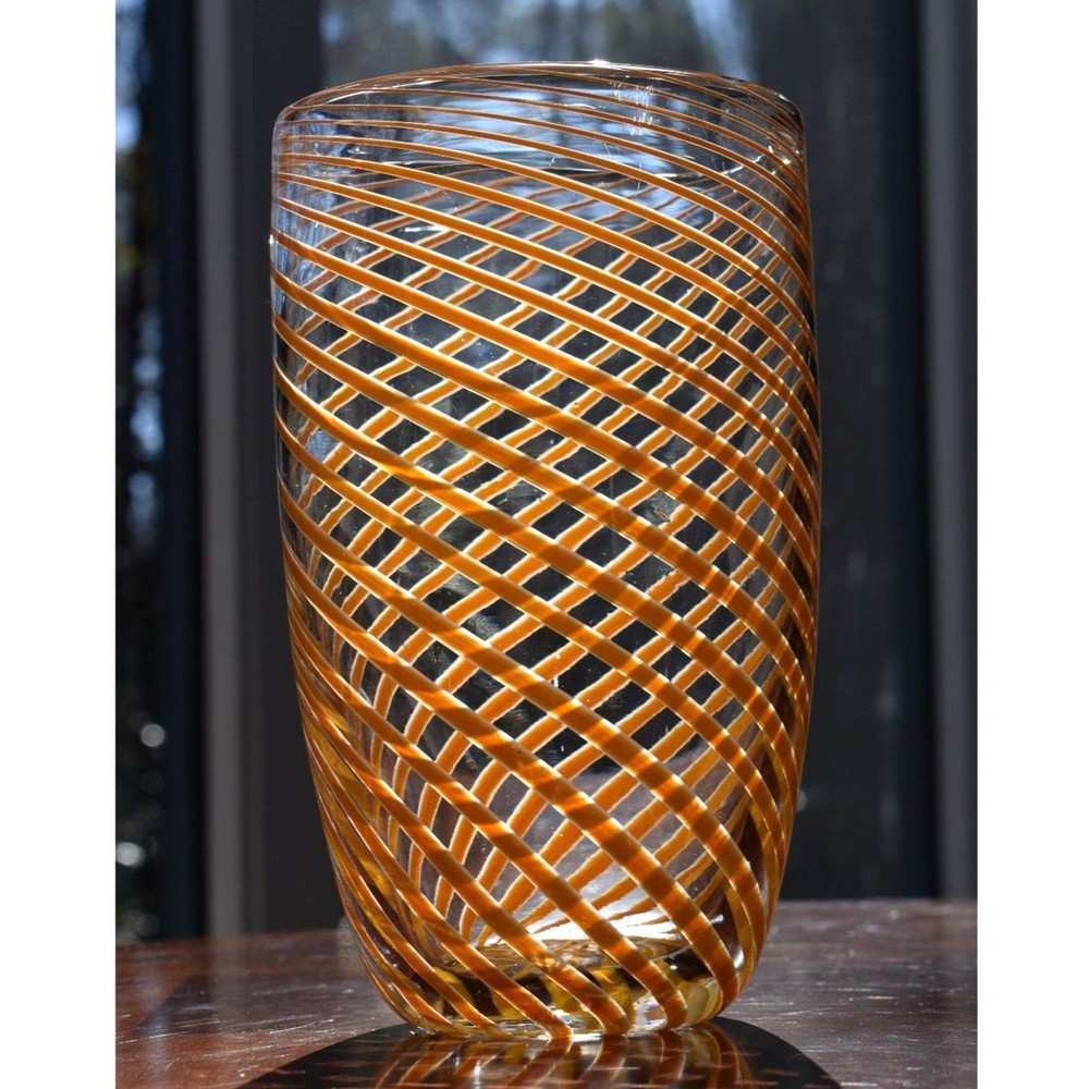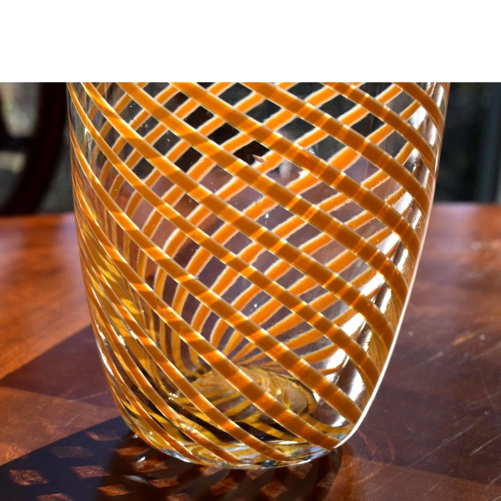 This exquisite Mid-Century Murano glass vase features vibrant orange spiral stripes gracefully encircling its clear glass form. Hand-blown by skilled Italian artisans, this piece exemplifies the elegance and craftsmanship synonymous with Murano glass. Its striking design makes it a perfect centerpiece for any decor. Condition: Excellent vintage condition with no chips, cracks, or visible wear. Dimensions: Height: 9.5 inches Diameter: 5.5 inches Era: Circa 1970s