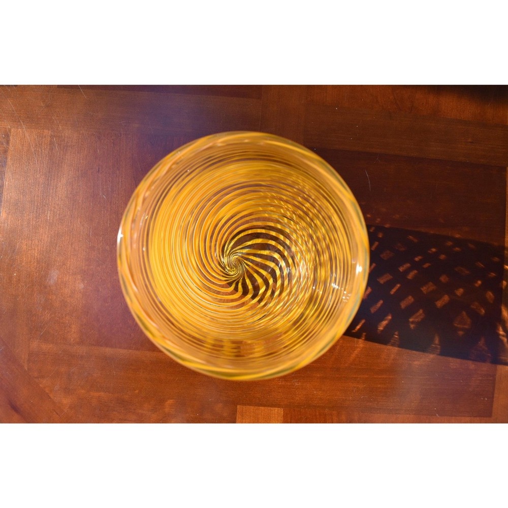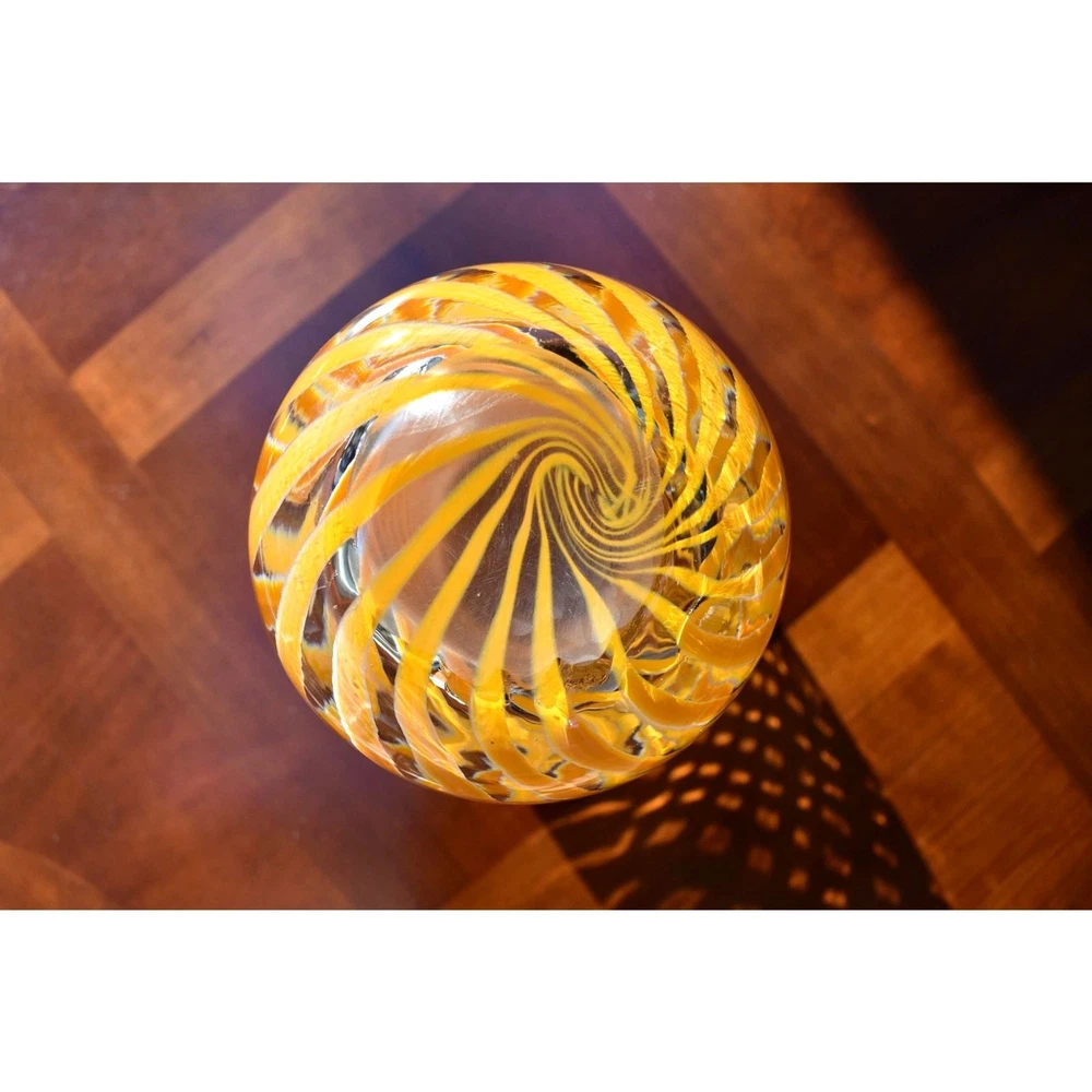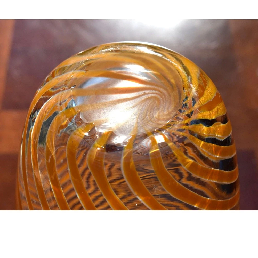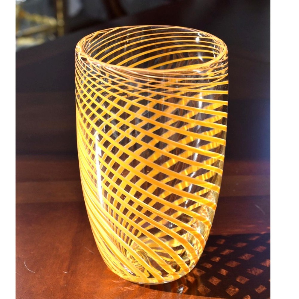 This exquisite Mid-Century Murano glass vase features vibrant orange spiral stripes gracefully encircling its clear glass form. Hand-blown by skilled Italian artisans, this piece exemplifies the elegance and craftsmanship synonymous with Murano glass. Its striking design makes it a perfect centerpiece for any decor. Condition: Excellent vintage condition with no chips, cracks, or visible wear. Dimensions: Height: 9.5 inches Diameter: 5.5 inches Era: Circa 1970s