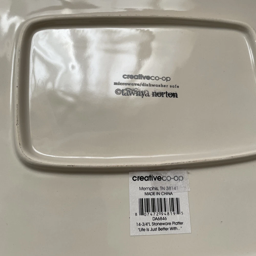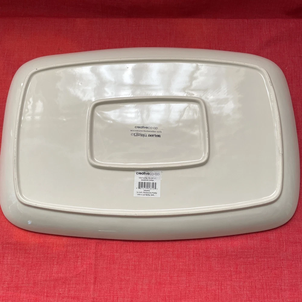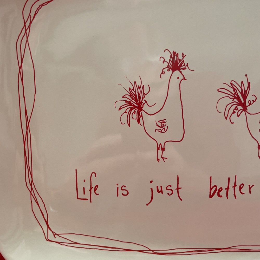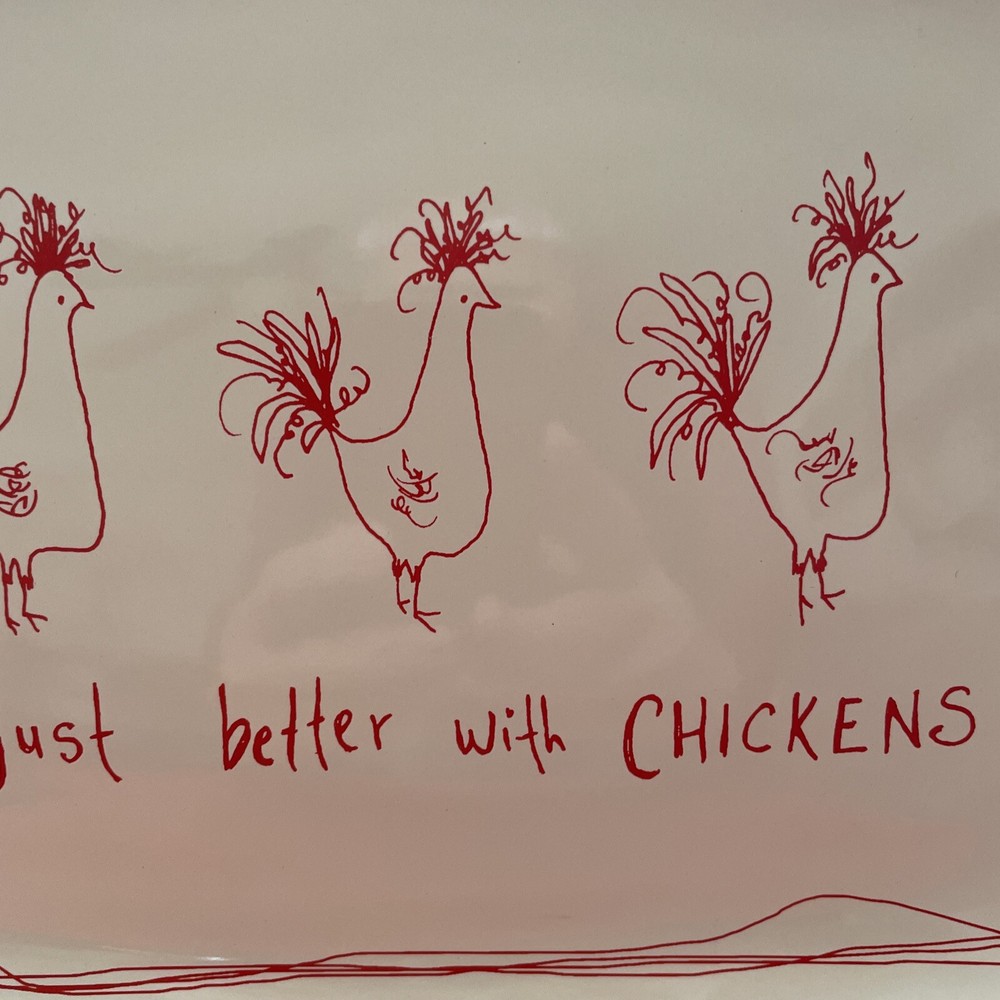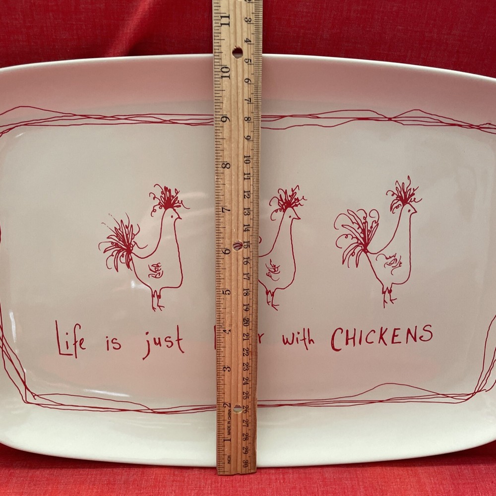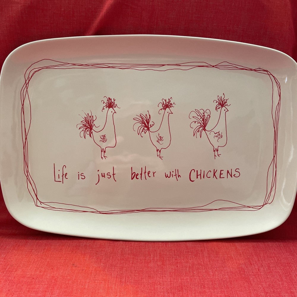 This beautiful platter by Tawnya Norton and made by Creative Co-op is a perfect addition to your kitchen or dining room. The awesome chickens are cute and red on white color scheme make it a great fit for all occasions. The stoneware production style ensures durability, and the glossy finish gives it a decorative touch. Featuring a charming chicken-themed pattern, this platter is sure to be a conversation starter. Measuring 15 inches in length and 10 inches in width, it is perfect for serving your favorite food. I have two listed. One has new stickers still attached and the other still looks unused.