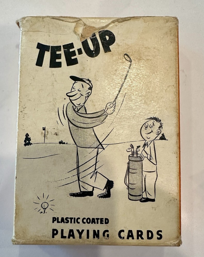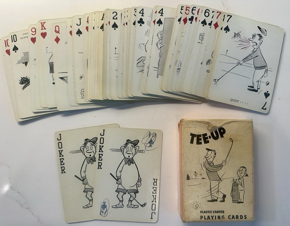 The product is a vintage 50s novelty playing card deck featuring a golfing theme, crafted by Creative Playing Card Co Complete Good condition With jokers...