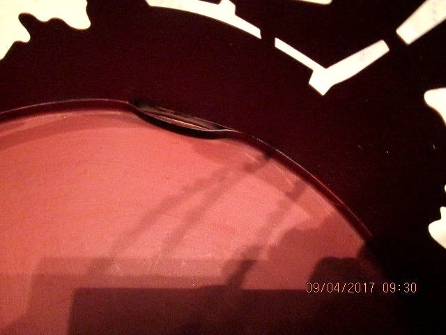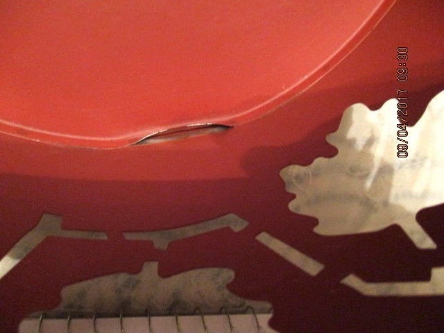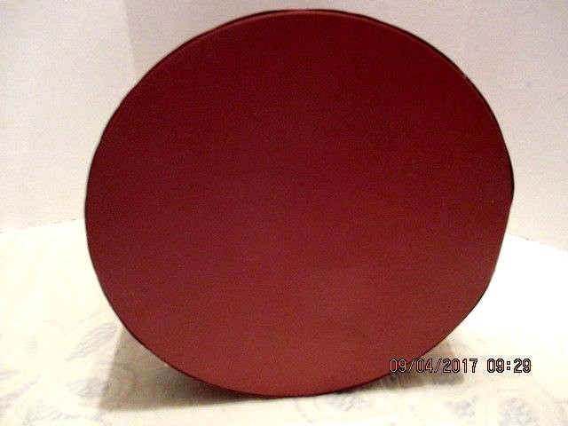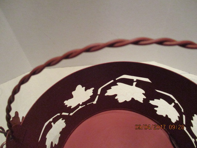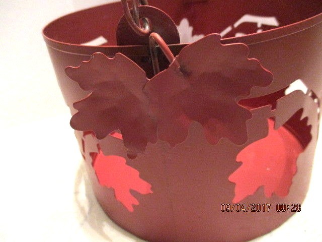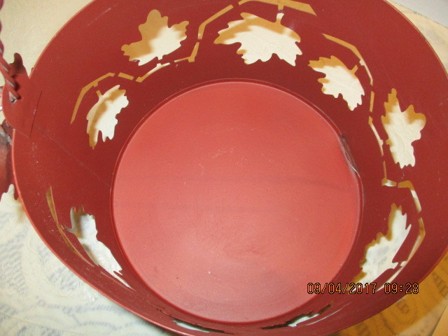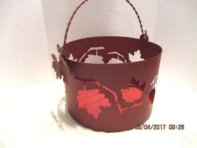 This is a terra cotta orange metal oak leave cut out twisted handle round fall basket. About 5" H x 7-3/8" W across top. A little dent is on the inside bottom. This doesn't show on the outside bottom. Otherwise, in very good condition. Please e-mail me with any questions or concerns you may have before bidding. Thanks for looking.