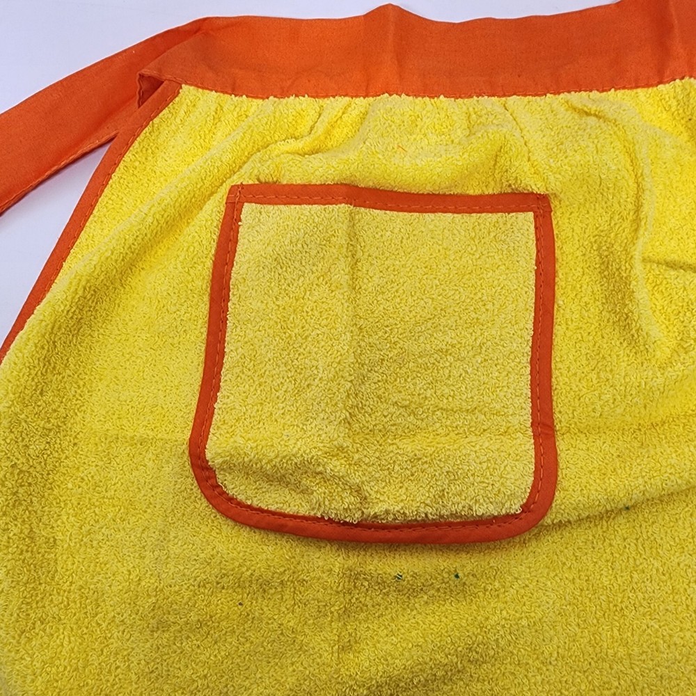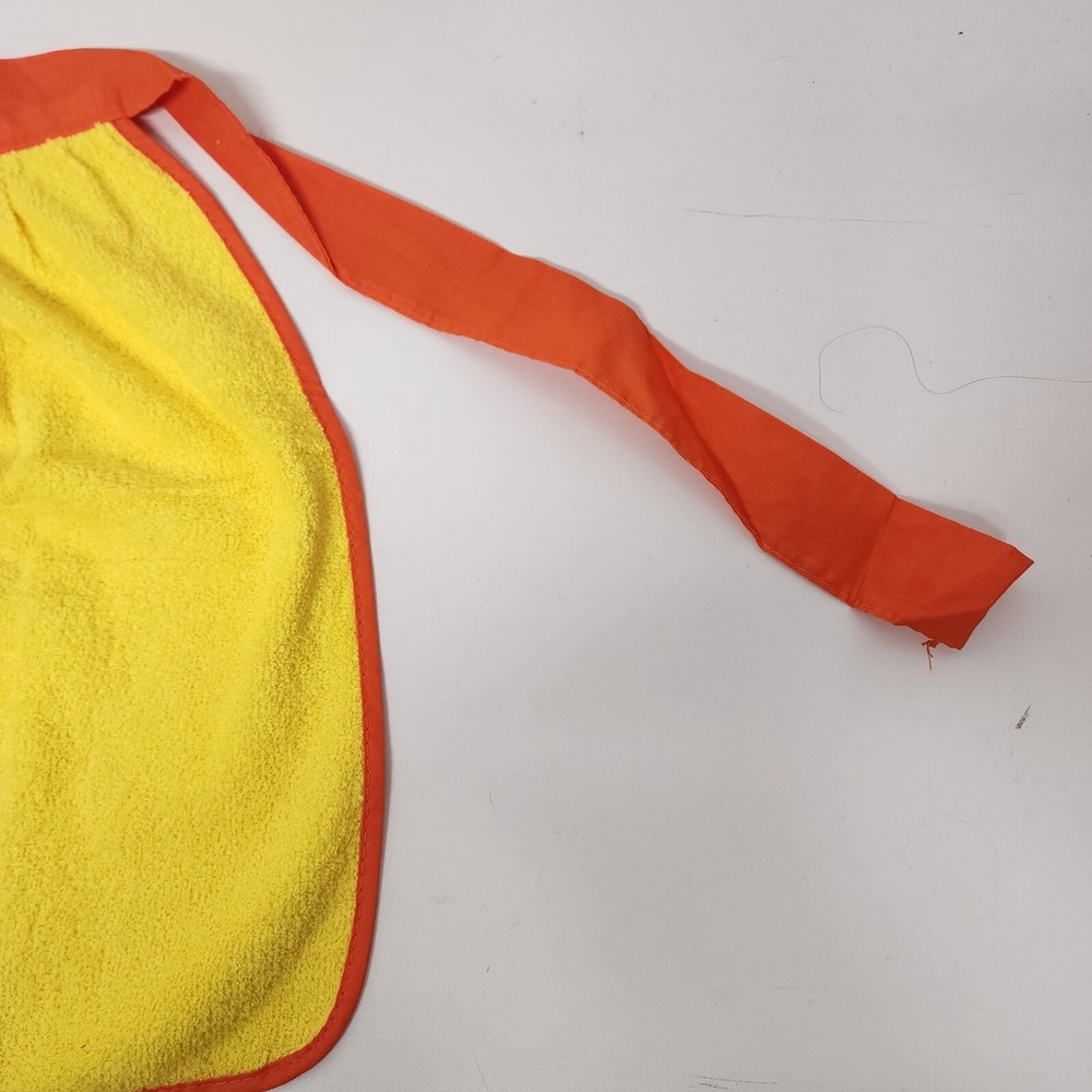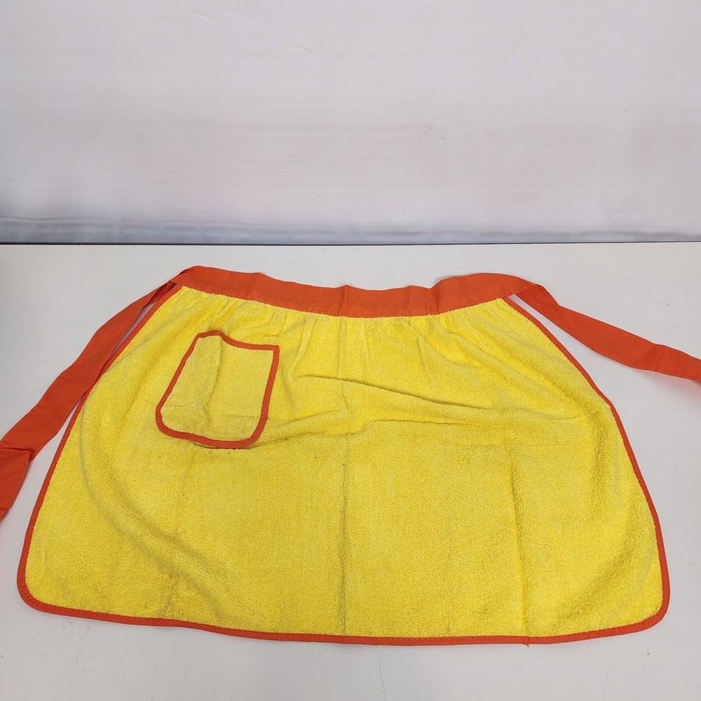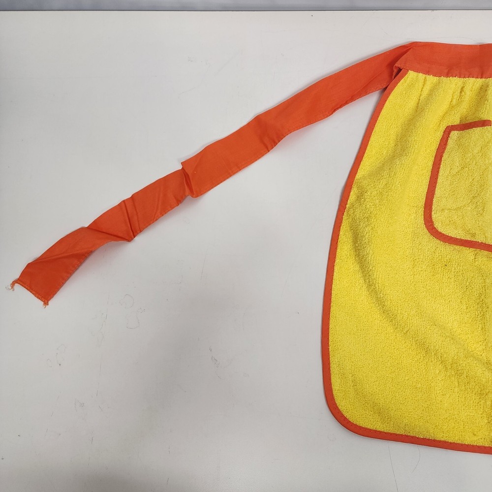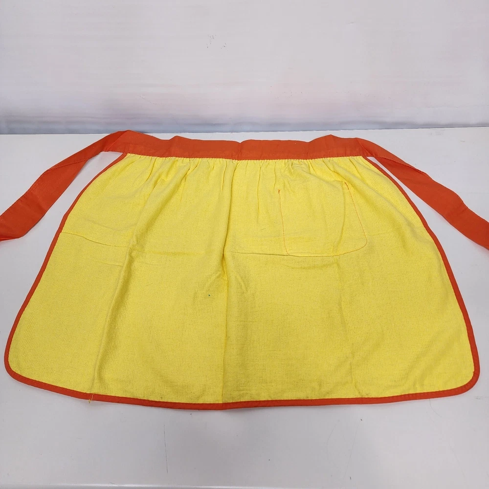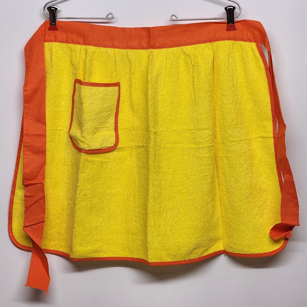 TerryCloth Waist Apron MCM 1970s Flower Power Yellow Orange Mid Century Modern Add a pop of retro flair to your kitchen with this TerryCloth Waist Apron from the 1970s. The vibrant Flower Power color in shades of Yellow and Orange is sure to brighten up your cooking routine. Approximate Measurements: 21" top to bottom 28" Across the bottom of the apron Ties are 19.5 and 22.5" Band above apron is about 18" Total length is about 60" from tip of band to tip of band Measuring 21 inches in length and 28 inches in width, this one-size-fits-all apron features a mid-century modern style that captures the essence of the 1970s. Care for this Kitchen Apron is easy as it is machine washable. Made in the United States, this collectible item is perfect for those who appreciate the beauty of vintage and the nostalgia of the past. Shipping weight is 5 ounces