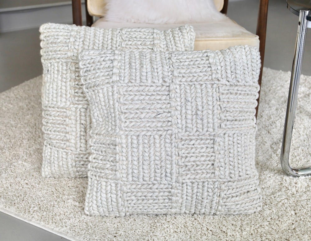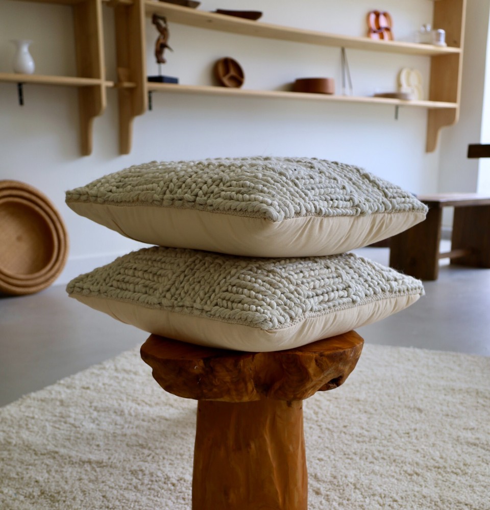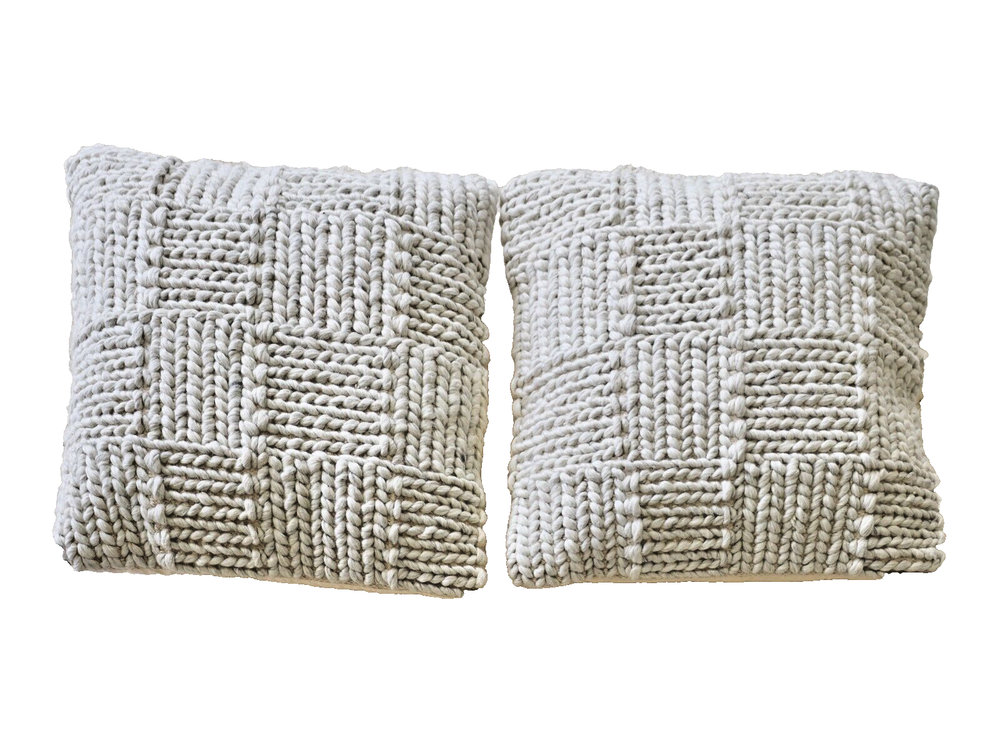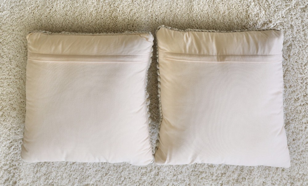 This matching pair of neutral-toned, woolen, woven cushions are super cozy and add a great tactile and visual touch to any room. The front is woven and woolen in gray and white, and the back is a very light peachy cream cotton canvas or similar. The pillow covers can be removed, via a zippered opening in the back. The care instruction is spot clean only.