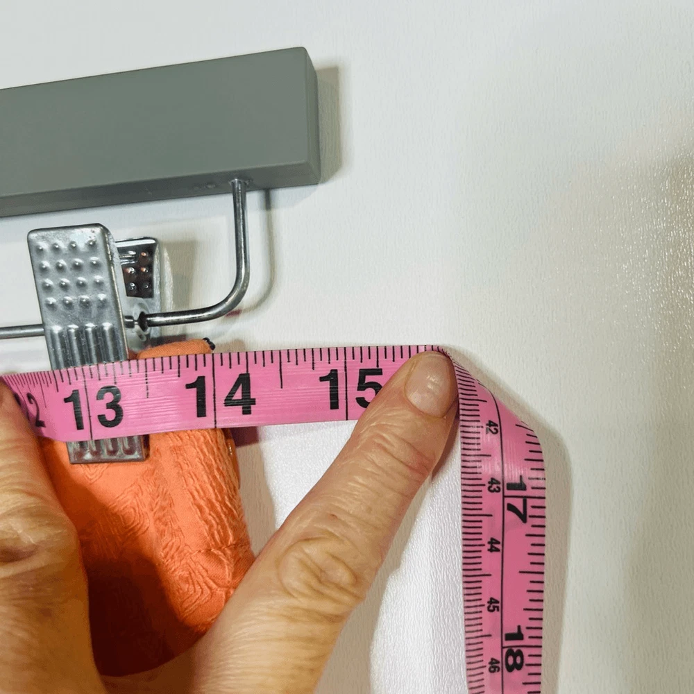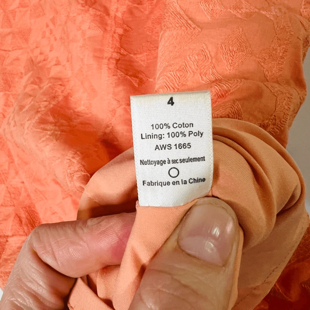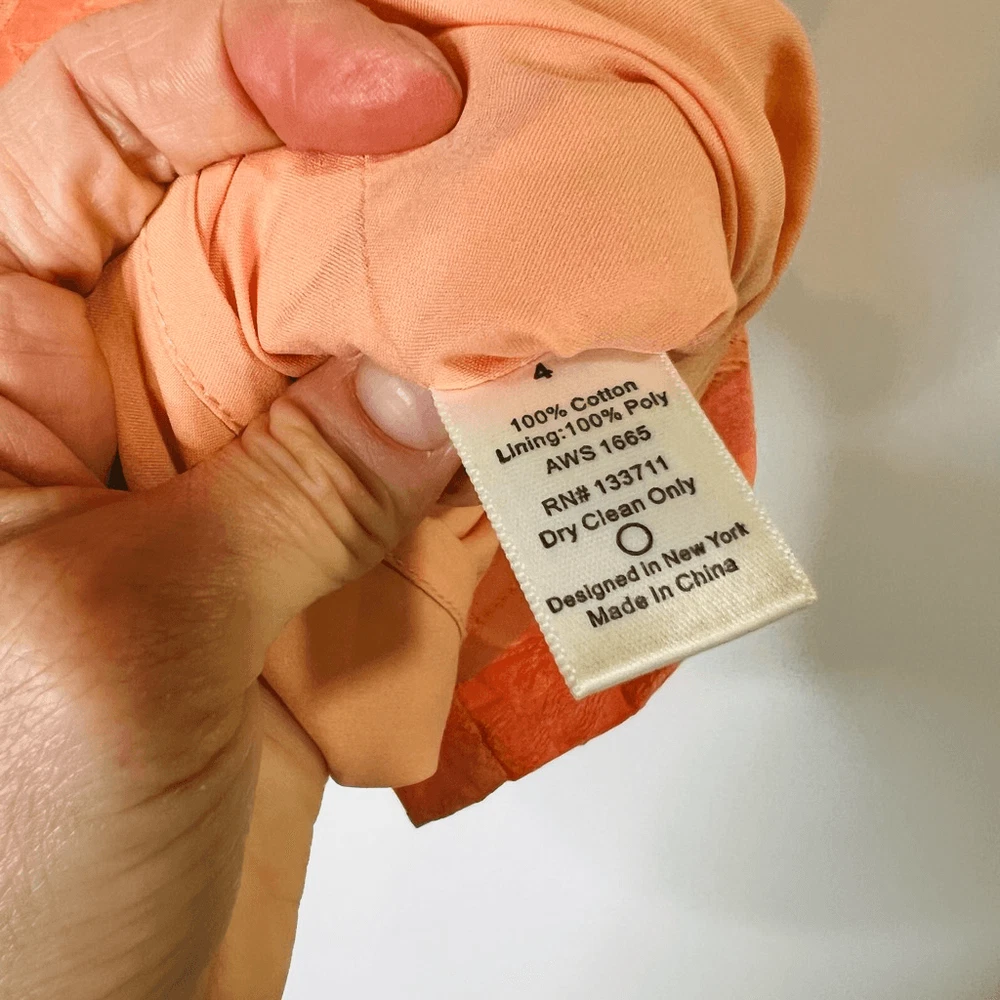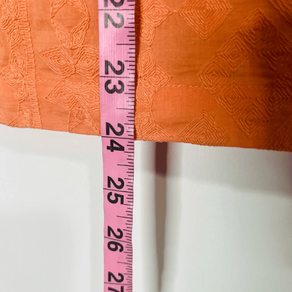 The Addison Story Peach Orange Embroidered Pencil Skirt Size 4 Cotton Lined 2 small tan colored marks as pointed out, both low on skirt, one in front and one in back Side zipper See pics for measurements