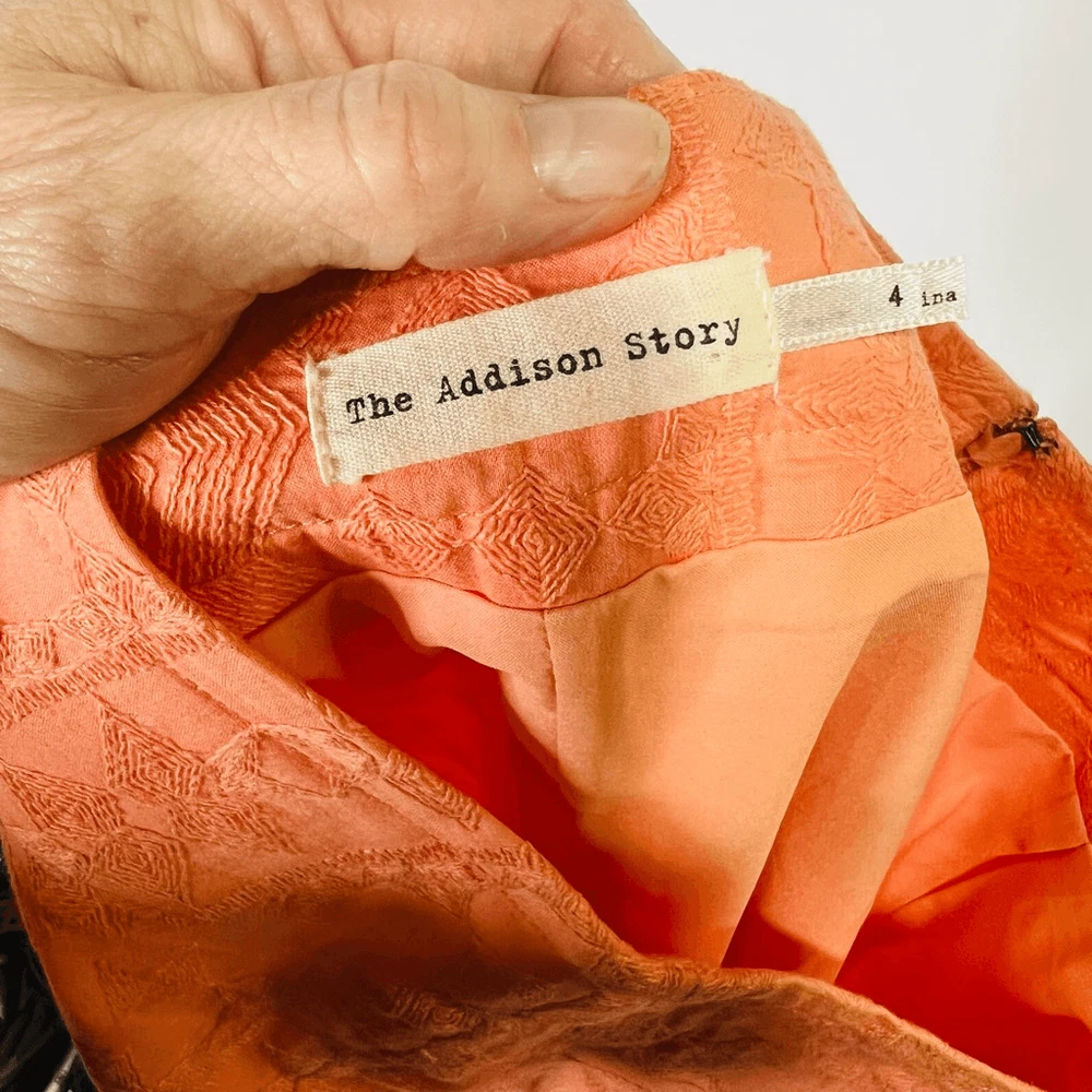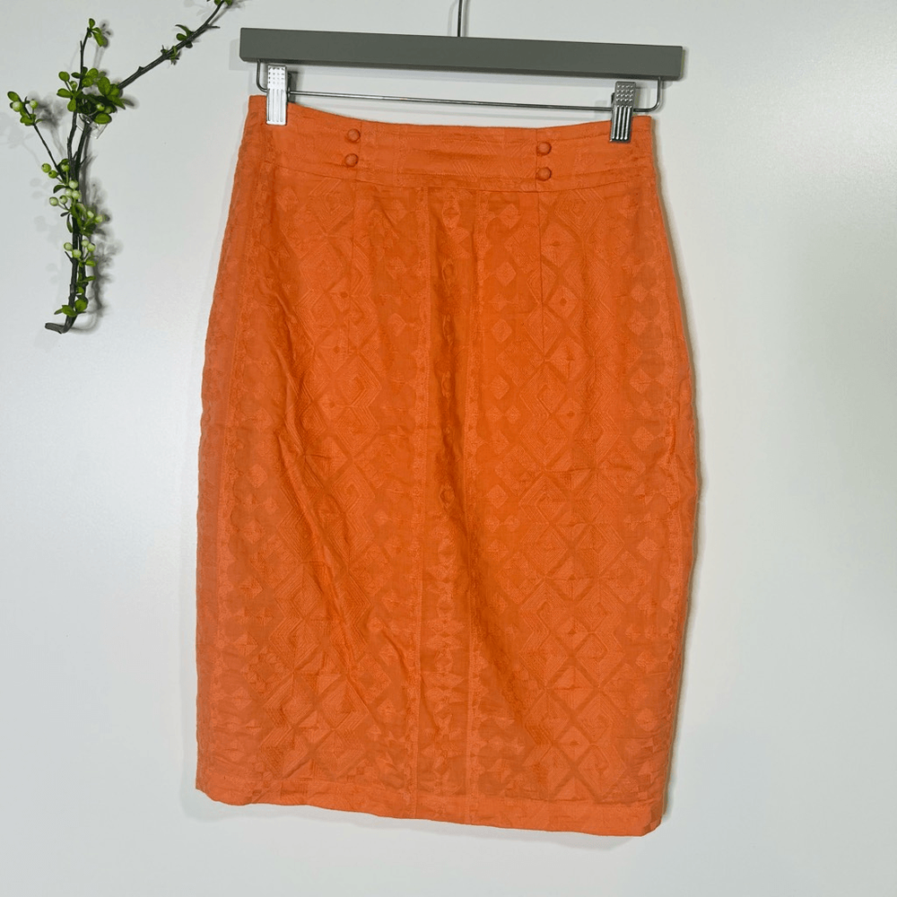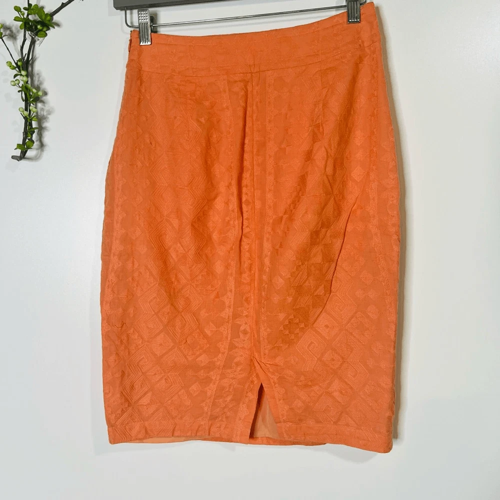 The Addison Story Peach Orange Embroidered Pencil Skirt Size 4 Cotton Lined 2 small tan colored marks as pointed out, both low on skirt, one in front and one in back Side zipper See pics for measureme...