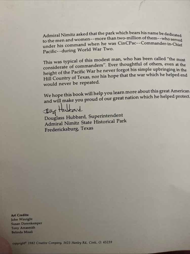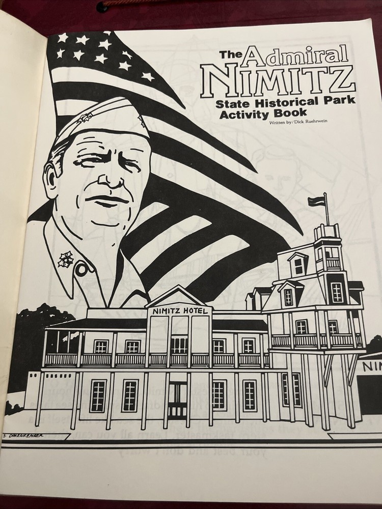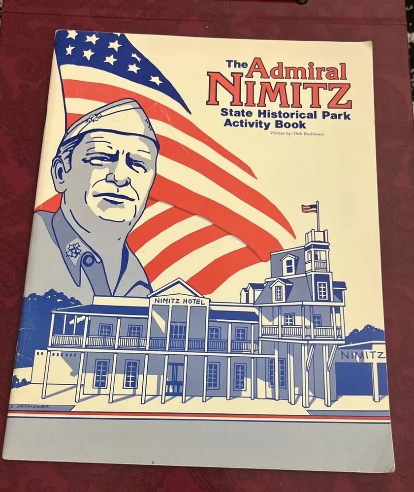 This is an activity book for the Admiral Nimitz State Historic Park, located in Fredericksburg, Texas. The park honors Admiral Chester W. Nimitz, who commanded the U.S. Pacific Fleet during World War II. It includes the National Museum of the Pacific War, which houses exhibits and artifacts related to the war. Cincinnati: Creative Company, 1982. Pamphlet. 32 p., stapled wraps, 8.5x11 inches, very good condition.