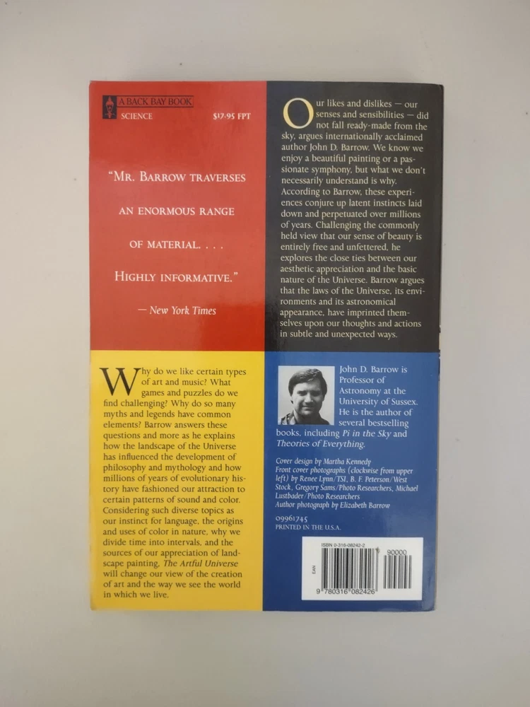 The Artful Universe:The Cosmic Source of Human Creativity-Paperback-LIKE NEW-A11 Dive into the cosmic origins of creativity with John D. Barrow's "Artful Universe: The Cosmic Source of Human Creativity." This thought-provoking paperback edition explores the intricacies of creative ability as influenced by scientific and psychological factors. Published by Little Brown & Company in 1996, this book is a treasure for enthusiasts of both disciplines, offering 288 pages of insightful analysis and stimulating ideas. Measuring at 9.2 inches in length, 6.1 inches in width, and a slight height of 0.8 inches, this trade paperback is a comfortable fit for readers to carry and delve into. The item's ISBN is 03165 and it weighs in at a substantial yet manageable 14.3 ounces. Whether you're a student, a researcher, or simply curious about the nature of creativity, this book promises to be a valuable addition to your library.