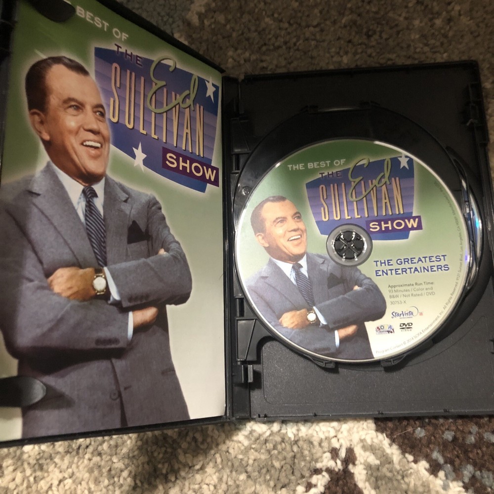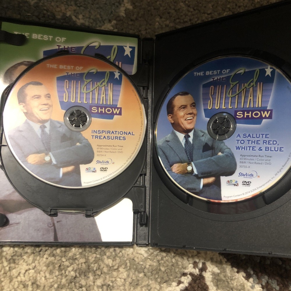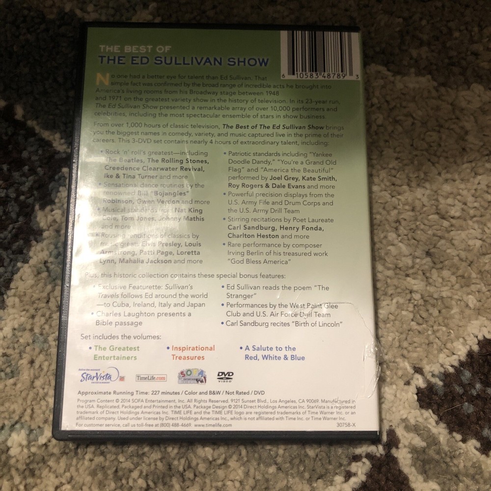 The Best Of The Ed Sullivan Show 3 DVD Set StarVista Time Life 227 Minutes. Original case but there is a tear on the back. Beatles, Elvis, Bojangles, Nat King Cole, Ike & Tina Turner, Loretta Lynn, Joel Grey, Creedence Clearwater Revival, Johnny Mathis, and more. Salute to the red, white, and blue patriotic includes Irving Berlin singing “God Bless America.” Actual item shown.