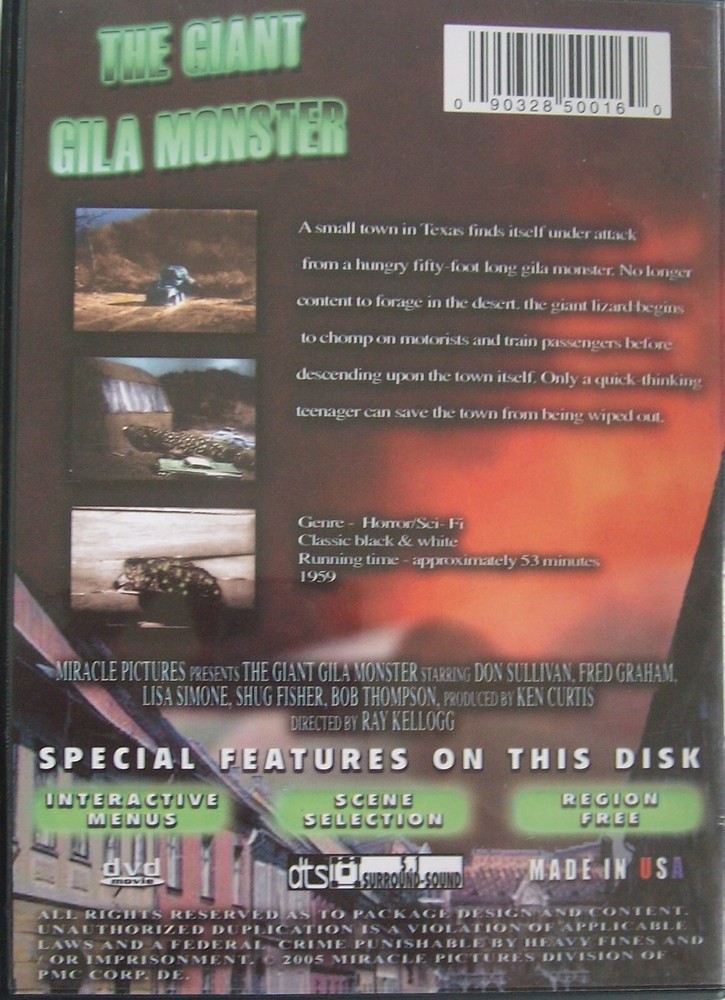 Pictures tell the story. We want you to be happy with your purchase. Please look at the pictures to verify the description and the condition. When in doubt, please don't hesitate to ask. Communication is the key to a great transaction. We are not responsible for the content of the movie, but these pictures will give you a clear idea of what the content is all about, enabling you to make an informed decision, based upon your preferences. In the case of a defect, please inform us immediately so we can attempt to fix the problem to your satisfaction. We stand behind our products. We offer free returns, and we guarantee that, except in the case of porch pirates, you will receive the item you paid for or a refund. We appreciate your interest. Thank you for looking. ABOUT OUR USED ITEM: We receive our inventory through the mail, and sometimes they arrive in less-than-perfect condition. In those instances, we remove the wrap, check the case and the disc, and if there are no damages we reset the disc on the hub. We take this measure to prevent further damage to the item. However, we do not sell these items as Brand New. We take a picture of it and note the conditions in our listing according to our findings. If you find more than we do, please let us know, so we can both arrive at a fair and amicable resolution. SYNOPSIS: Experience the thrill of the 1959 cult classic, "The Giant Gila Monster" on this standard edition DVD. This black and white Sci-Fi/Horror film, directed by Ray Kellogg and produced by Miracle Pictures, stars Don Sullivan and Fred Graham in a world where monstrous creatures roam free. This DVD features an NTSC video format, English language with subtitles, and a region code of DVD: 0/All (Region Free/Worldwide), making it perfect for movie lovers worldwide. The DVD comes in a standard case type and includes special features like interactive menus, scene selection, and full-screen viewing. Get ready for a wild ride with this Sci-Fi classic! THE STORYLINE: A small town in Texas finds itself under attack from a fifty foot long Gila Monster. No longer content to forage in the desert, the giant lizard begins to chomp on the motorists and train passenger before descending upon the town itself. Only a quick thinking teenager can save the town from being wiped out. SHIPPING: *We ship with USPS within one business day (Monday to Friday) of cleared payment. We do not ship on weekends or holidays. * We offer Free Shipping to US destinations. * We Ship Worldwide through eBay International Shipping, which is a knowledgeable unit on International Laws. The process is convenient and easy. We offer free shipping to their domestic shipping hub, where they take care of international shipping, customs paperwork, returns, and post-transaction communication on our behalf.