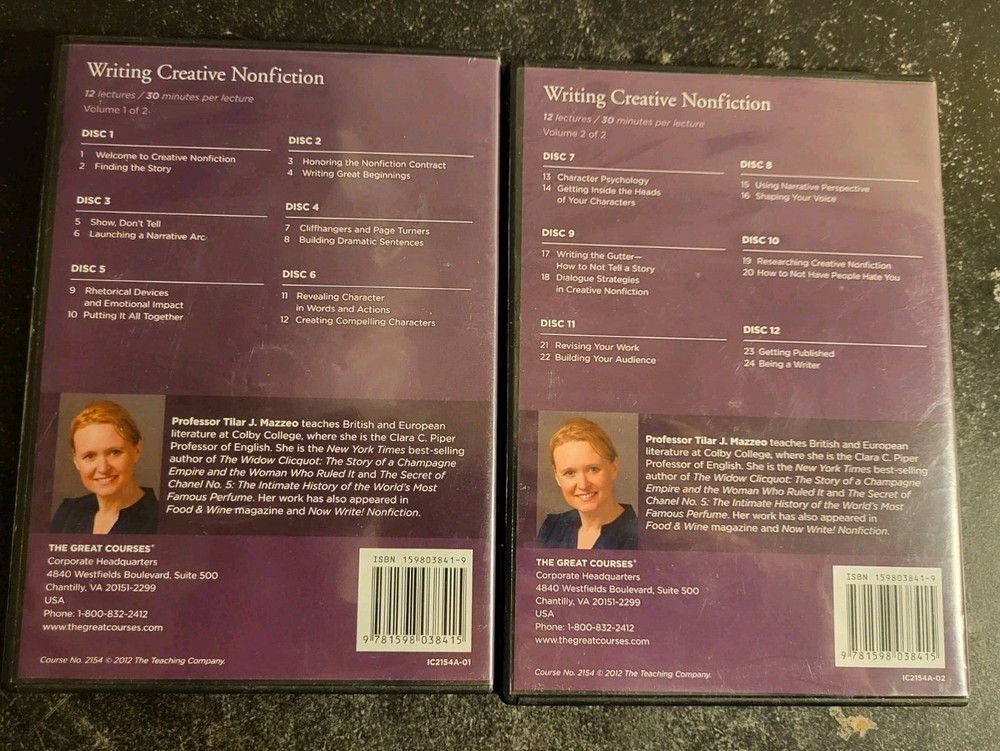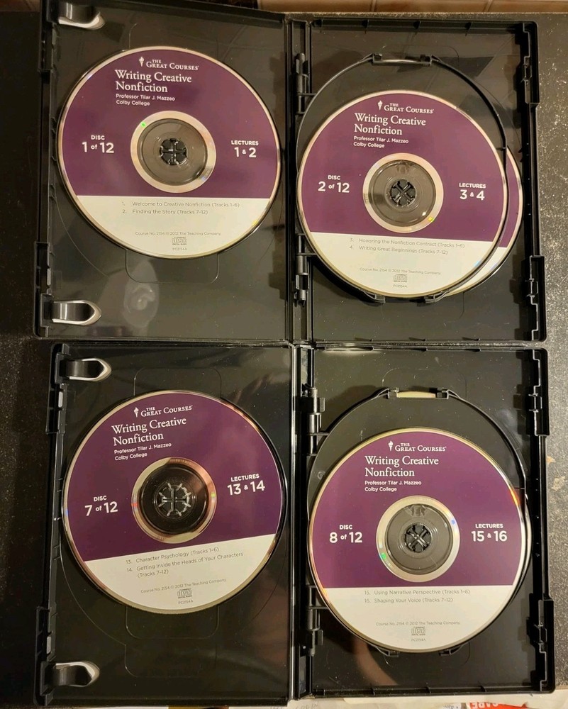 Complete 1 of 2/2 of 2 Writing Creative Fiction 12 disc set. 2012 The Teaching Company. Each volume has 6 cds, 12 lectures per volume. Each lecture is roughly 30min. Some of the discs may have minor surface marks. They play fine.