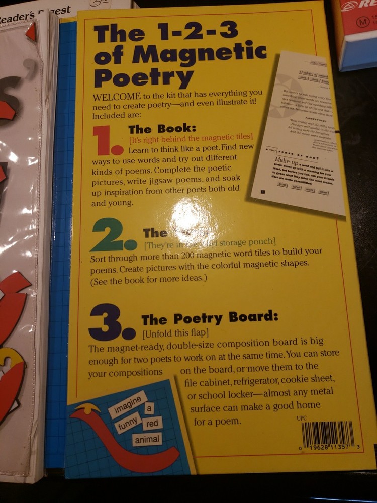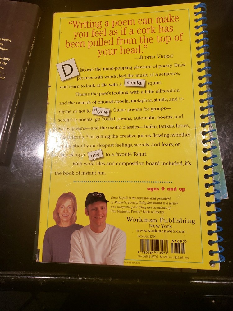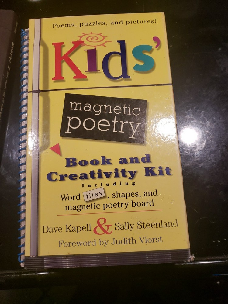 Explore the world of poetry and creative writing with the "Kids' Magnetic Poetry" kit, authored by Sally Steenland and Dave Kapell. Published in 1998 by Workman Publishing Company, Incorporated, this hardcover edition is a treasure trove for juvenile nonfiction enthusiasts. The book spans 64 pages and is adorned with vibrant illustrations that inspire and engage young minds. Perfect for language arts composition and creative writing, this kit encourages imaginative expression through the joy of poetry. Measuring 10.7 inches in length, 6.8 inches in width, and a slight height of 0.6 inches, it's a compact and portable resource for educational fun. Weighing in at just 25 ounces, it's lightweight enough for young hands to handle and carry to their creative spaces.