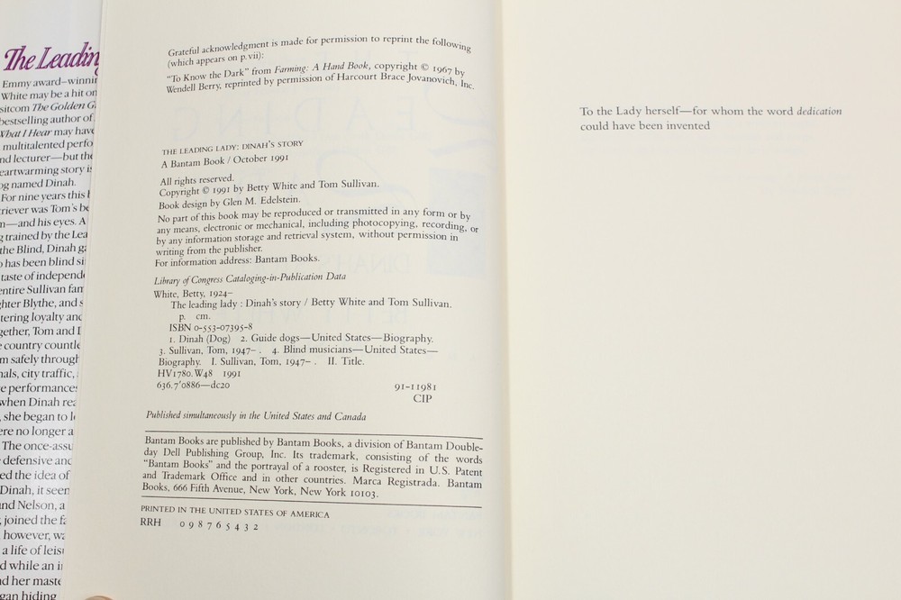 The Leading Lady Dinah’s Story Hardcover Book By Betty White And Tom Sullivan Very good condition. The front dustjacket cover has a small tear at the top. The covers and pages are clean with no writing, marks, stains, etc. Please see the included photos for close-up condition of the book. All images are photos or scans of the exact item you will receive. No stock or re-used photos . Please review images and condition notes, and feel free to ask any questions you may have. The item will be securely packaged to assure safe arrival. I am always happy to combine shipping whenever possible. Thank you for your interest!