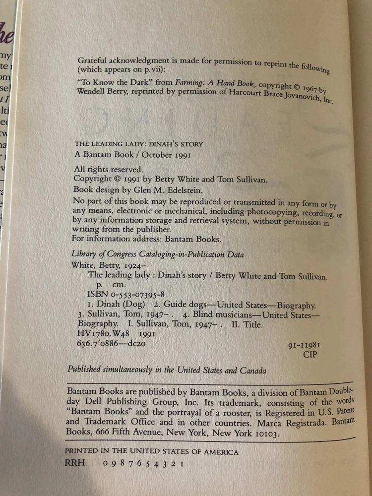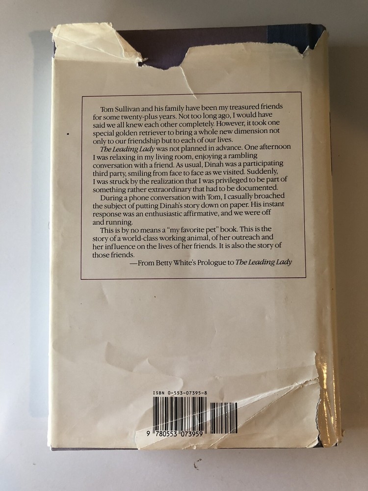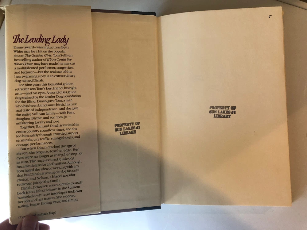 The Leading Lady Dinah's Story by Betty White & Tom Sullivan 1991, Hardcover With Dust Jacket. Condition is good with no torn lose or missing pages and no obstruction to the text. Dust Jacket is in poor condition with tears on backside and front area, see photos. Ships via USPS Economy Media Mail. Please be aware that currently media mail is taking the post office between 2-3 weeks to deliver. If you want the book delivered sooner please choose priority mail. You can also pick up at Casa Grande Books Movies and More, 408 N. Florence St. Casa Grande, Arizona