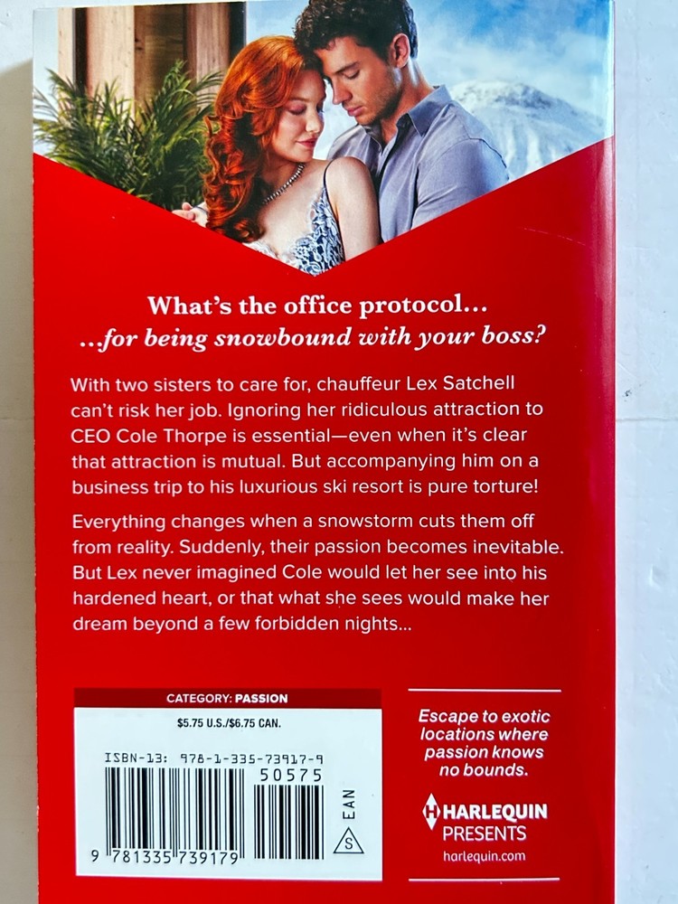 | Synopsis | She resisted him...until they were stranded in snow-capped luxury, in this workplace romance from Joss Wood. What's the office protocol... ...for being snowbound with your boss? With two sisters to care for, chauffeur Lex Satchell can't risk her job. Ignoring her ridiculous attraction to CEO Cole Thorpe is essential--even when it's clear that attraction is mutual. But accompanying him on a business trip to his luxurious ski resort is pure torture! Everything changes when a snowstorm cuts them off from reality. Suddenly, their passion becomes inevitable. But Lex never imagined Cole would let her see into his hardened heart, or that what she sees would make her dream beyond a few forbidden nights... From Harlequin Presents: Escape to exotic locations where passion knows no bounds. Read all the Cape Town Tycoons books: Book 1: The Nights She Spent with the CEO Book 2: The Baby Behind Their Marriage Merger |