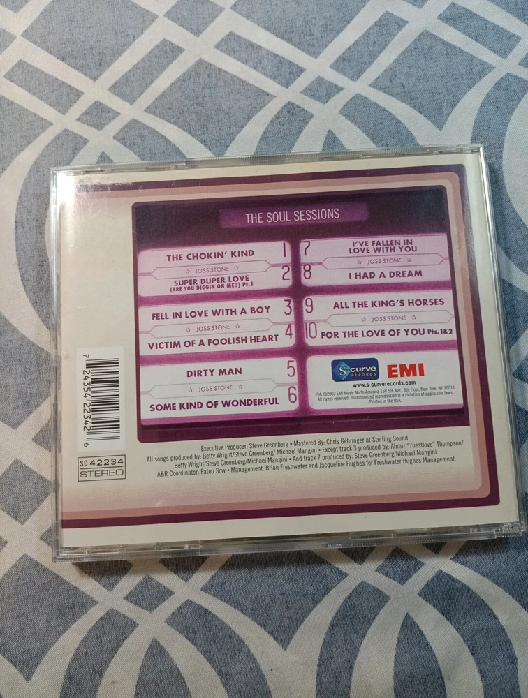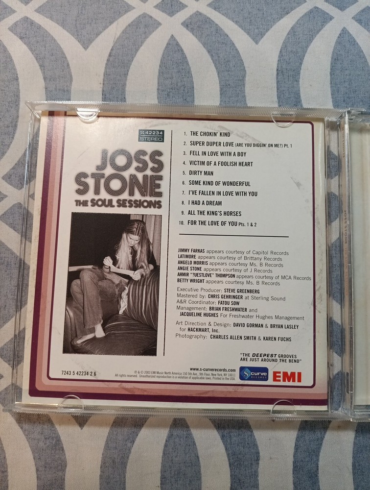 Get ready to enjoy the soulful sounds of Joss Stone with her 2003 album "The Soul Sessions." This CD features a mix of rock and pop genres, with a run time of 42 minutes. The album was released under the S-Curve (USA) record label and includes contributions from Ahmir Thompson, Angie Stone, Betty Wright, and Latimore. The disc comes in the standard CD format and is a must-have for fans of Joss Stone and lovers of rock and pop music alike. This album is perfect for adding to your music collection and will provide you with hours of listening pleasure. This is a nice and gently used item and is in really good condition. It comes with the usual handling wear and age. There are some visible scratches and scuffs here and there, but nothing too serious . More pictures are available upon request, and thank you for your business.