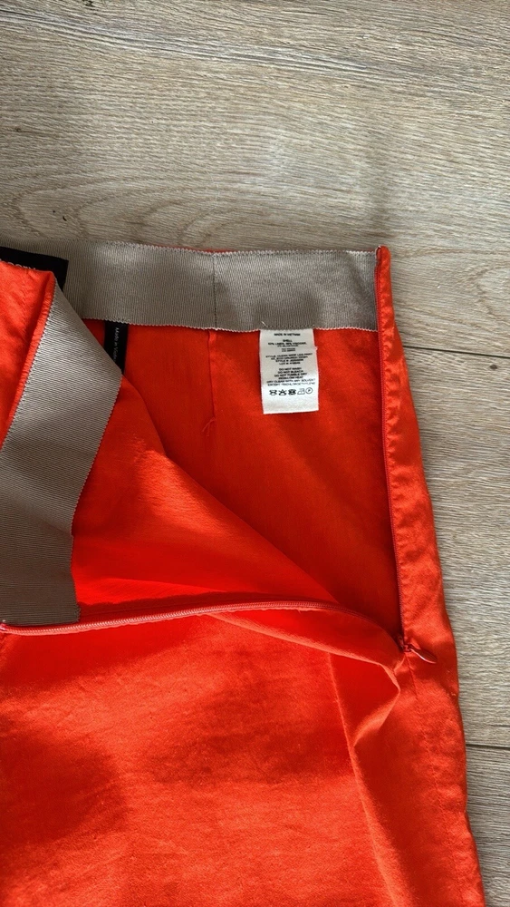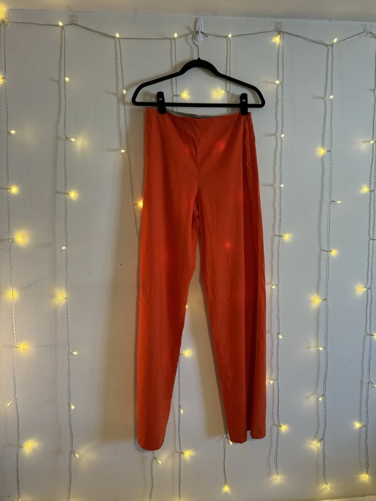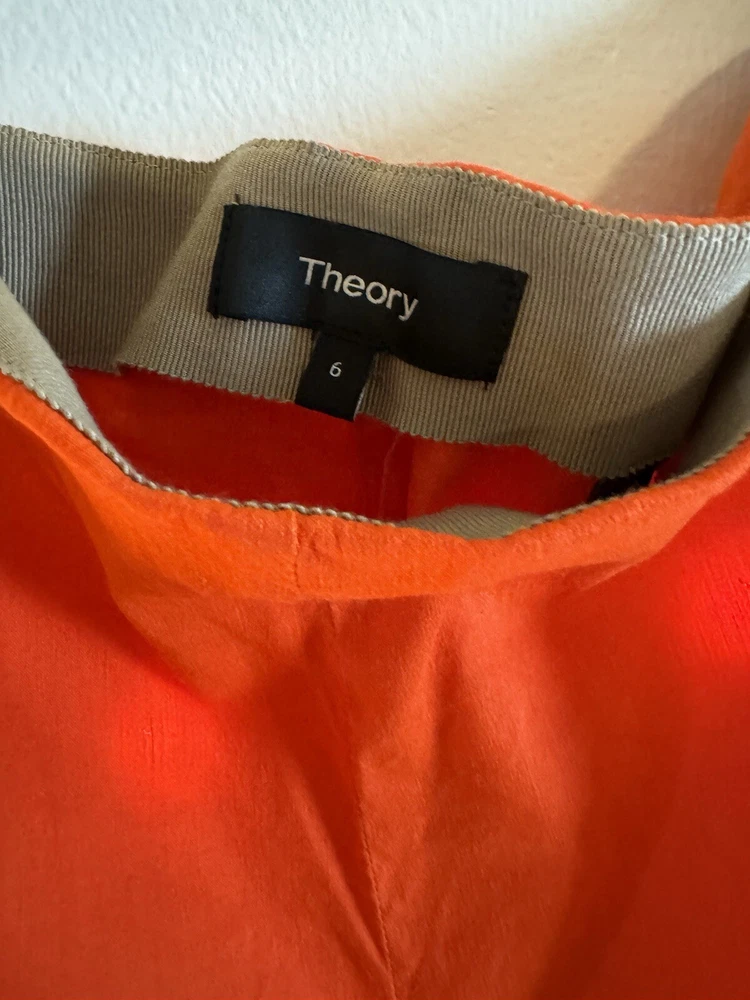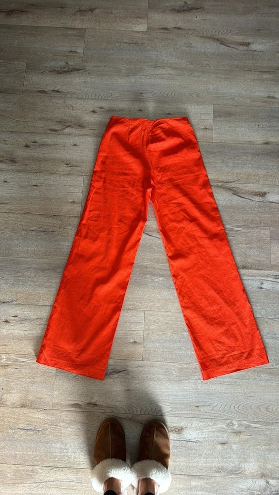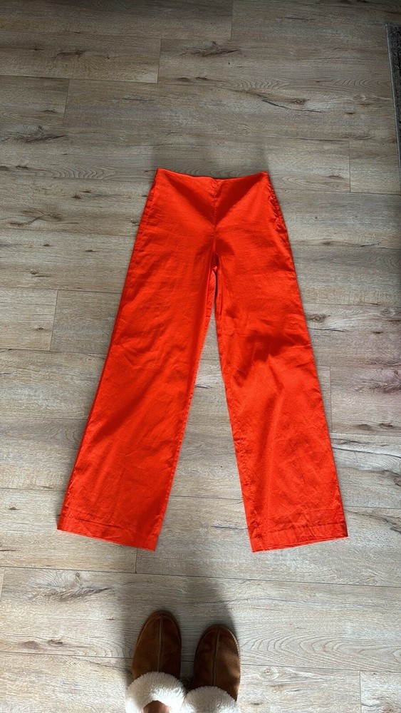 Elevate your wardrobe with these stunning Theory women's pants. The linen blend material provides a comfortable and breathable fit, while the flat front and straight leg design create a timeless and versatile look. The orange color adds a pop of brightness to any outfit, and the size 8 fit is perfect for a regular size type. The pants feature a solid pattern, 32" hips, and a 34" inseam. The vintage-free design and regular fit make these pants a must-have addition to any modern wardrobe. Perfect for any occasion, these pants are a true staple for any fashion-forward woman. Side zipper and darts to make it fitted. I’m 5’10” and it’s too long without shoes.