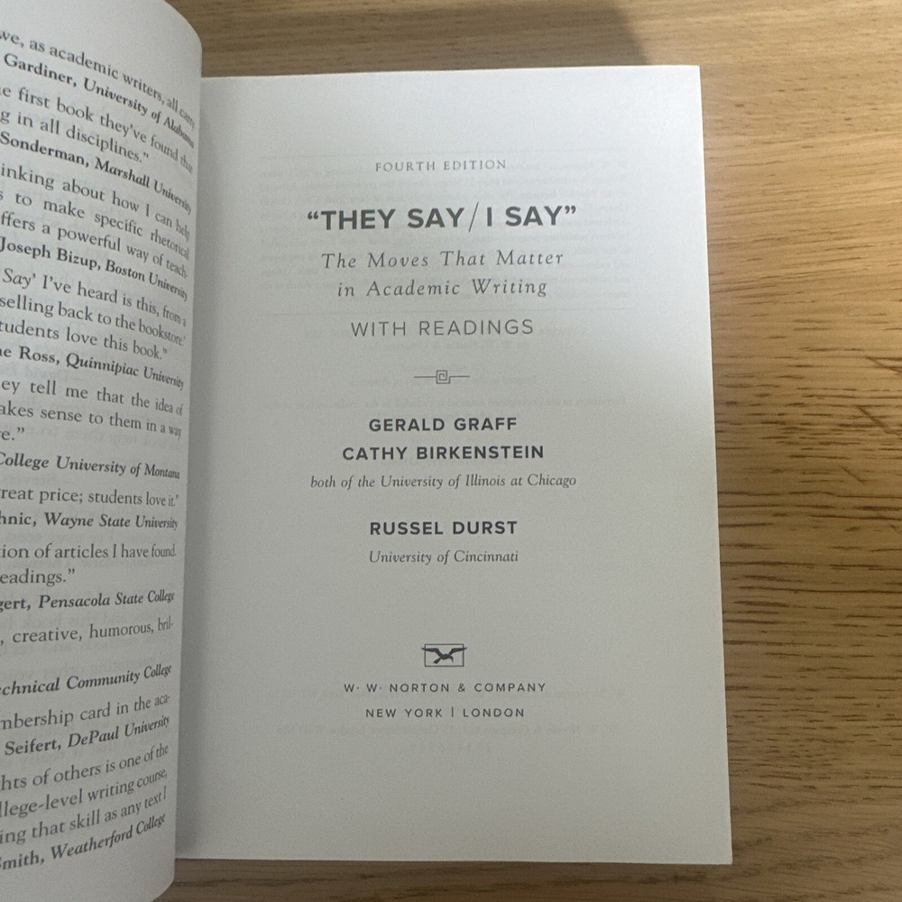 *New to the editionPreface: Demystifying Academic ConversationIntroduction: Entering the Conversation Part 1. "THEY SAY"1. "They Say": Starting with What Others Are Saying2. "Her Point Is": The Art of Summarizing3. "As He Himself Puts It": The Art of QuotingPart 2. "I SAY"4. "Yes / No / Okay, But": Three Ways to Respond5. "And Yet": Distinguishing What You Say from What They Say6. "Skeptics May Object": Planting a Naysayer in Your Text7. "So What? Who Cares?": Saying Why It MattersPart 3. TYING IT ALL TOGETHER8. "As a Result": Connecting the Parts9. "You Mean I Can Just Say It That Way?": Academic Writing Doesn't Mean Setting Aside Your Own Voice10. "But Don't Get Me Wrong": The Art of Metacommentary11. "He Says Contends": Using the Templates to RevisePart 4. IN SPECIFIC ACADEMIC SETTINGS12. "I Take Your Point": Entering Class Discussions*13. Don't Assume They'll Scroll Up: Entering Online Conversations14. "What's Motivating This Writer?": Reading for the Conversation15. "Analyze This": Writing in the Social SciencesREADINGS16. How Can We Bridge the Differences That Divide Us?*Sean Blanda, The Other Side Is Not Dumb*danah boyd, Why America Is Self-Segregating*Michelle Alexander, The New Jim Crow: Mass Incarceration in the Age of Colorblindness (documented)*J. D. Vance, Hillbilly Elegy: A Memoir of a Family and Culture in Crisis*Gabriela Moro, Minority Student Clubs: Segregation or Integration? (student essay, documented)*Robert Leonard, Why Rural America Voted for Trump*Joseph Stiglitz, A Tax System Stacked against the 99 Percent*Barack Obama, Howard Commencement Address17. Is College the Best Option?Stephanie Owen and Isabel Sawhill, Should Everyone Go to College? (documented)Sanford Ungar, The New Liberal ArtsCharles Murray, Are Too Many People Going to College? (documented)Liz Addison, Two Years Are Better than FourGerald Graff, Hidden IntellectualismMike Rose, Blue-Collar Brilliance*Ben Casselman, Shut Up about Harvard*Steve Kolowich, On the Front Lines of a New Culture War18. Are We in a Race against the Machine?Nicholas Carr, Is Google Making Us Stupid?Clive Thompson, Smarter than You Think: How Technology Is Changing Our Minds for the BetterMichaela Cullington, Does Texting Affect Writing? (student essay)*Jenna Wortham, How I Learned to Love Snapchat*Carole Cadwalladr, Google, Democracy and the Truth about Internet Search*Kenneth Goldsmith, Go Ahead: Waste Time on the InternetSherry Turkle, No Need to Call*Zeynep Tufecki, Does a Protest's Size Matter?19. What's Gender Got to Do with It?Anne-Marie Slaughter, Why Women Still Can't Have It AllRichard Dorment, Why Men Still Can't Have It All"*Raynard Kington, I'm Gay and African American . . .*Laurie Frankel, From He to She in First Grade*Andrew Reiner, Teaching Men to Be Emotionally HonestStephen Mays, What about Gender Roles in Same-Sex Relationships? (student essay)*Kate Crawford, Artificial Intelligence's White Guy Problem*Nicholas Eberstadt, Men Without Work (documented)20. What's There to Eat?Michael Pollan, Escape from the Western Diet*Olga Khazan, Why Don't Convenience Stores Sell Better Food?Mary Maxfield, Food as Thought: Resisting the Moralization of Eating (student essay)David Zinczenko, Don't Blame the EaterRadley Balko, What You Eat Is Your BusinessMichael Moss, The Extraordinary Science of Addictive Junk FoodDavid H. Freedman, How Junk Food Can End Obesity*Sara Goldrick-Rab, Katharine Broton, Emily Brunjes Colo, Expanding the National School Lunch Program to Higher Education |