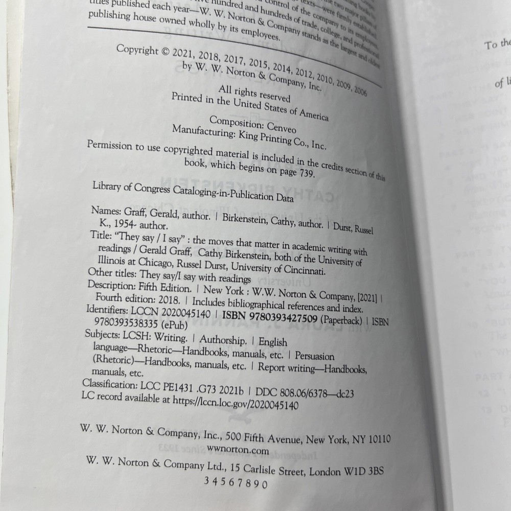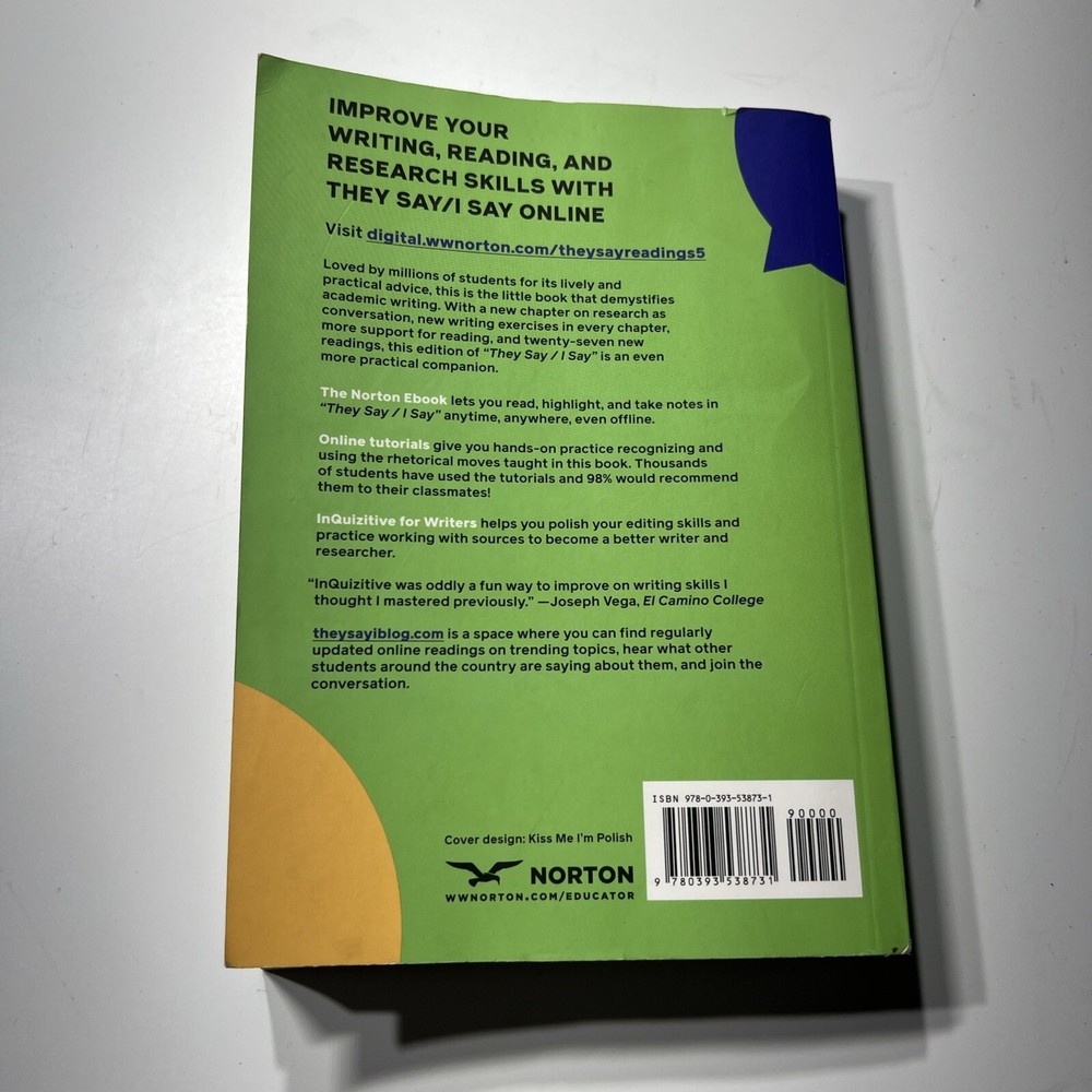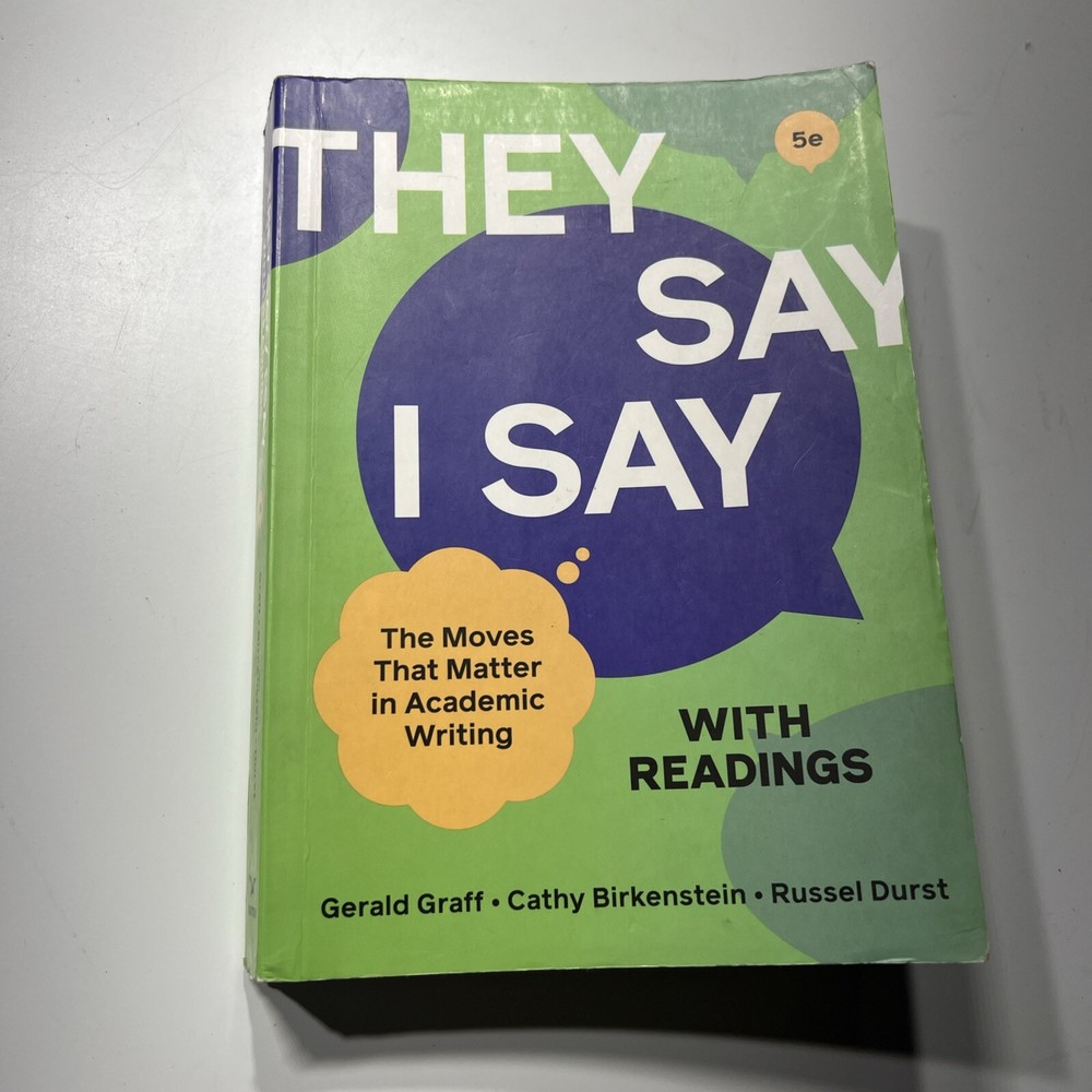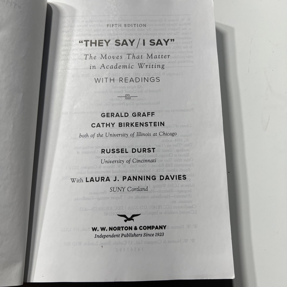 "They Say / I Say" with Readings is a Norton & Company, Incorporated, w. w. trade paperback textbook written by Cathy Birkenstein, Gerald Graff, and Russel Durst. The book has 816 pages and is 7.5 inches in length, 5.3 inches in width, and 1 inch in height. It weighs 22.4 ounces and was released in 2021. The book is a comprehensive guide to language arts and disciplines, composition, and creative writing.