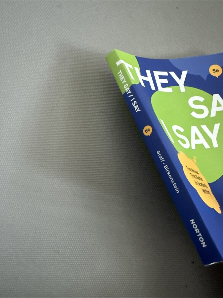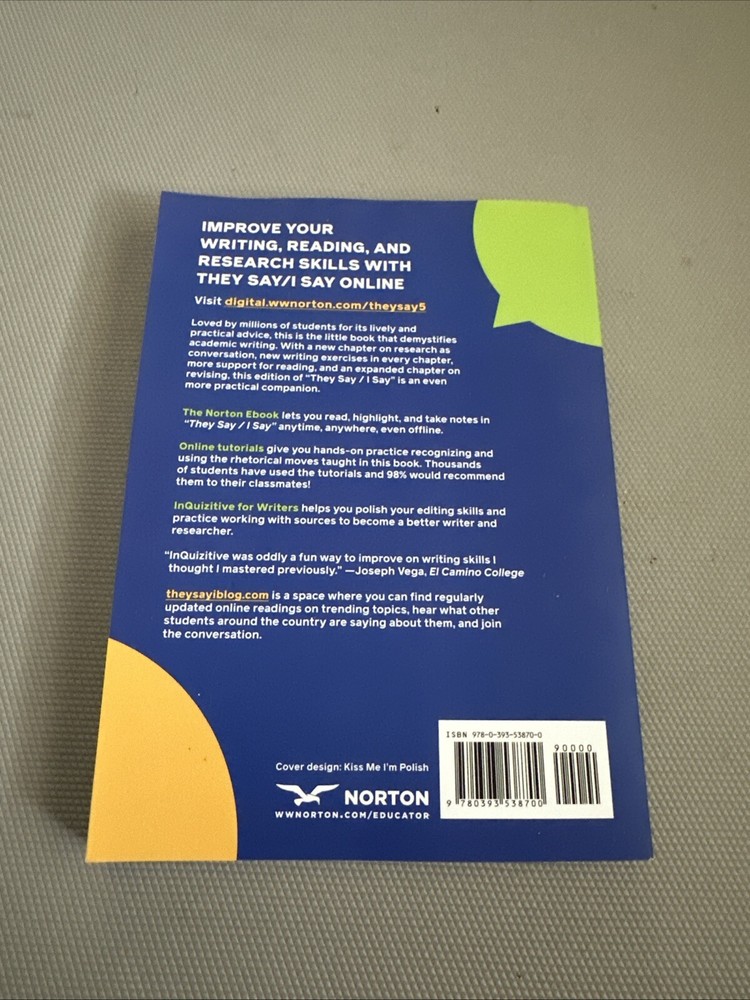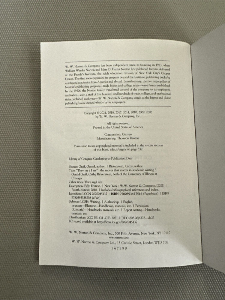 "They Say / I Say" is a textbook published by Norton & Company, Incorporated, w. w. in 2021. The book is a trade paperback / mixed lot format with 400 pages. It is written in English and is 7.5 inches in length, 5.4 inches in width, and 0.6 inches in height. The book is authored by Cathy Birkenstein and Gerald Graff and is designed for students studying Language Arts & Disciplines, Composition & Creative Writing, and other related subjects. The book covers the topic of reading, writing, and communication, and is intended for use as a textbook for college and university students.
